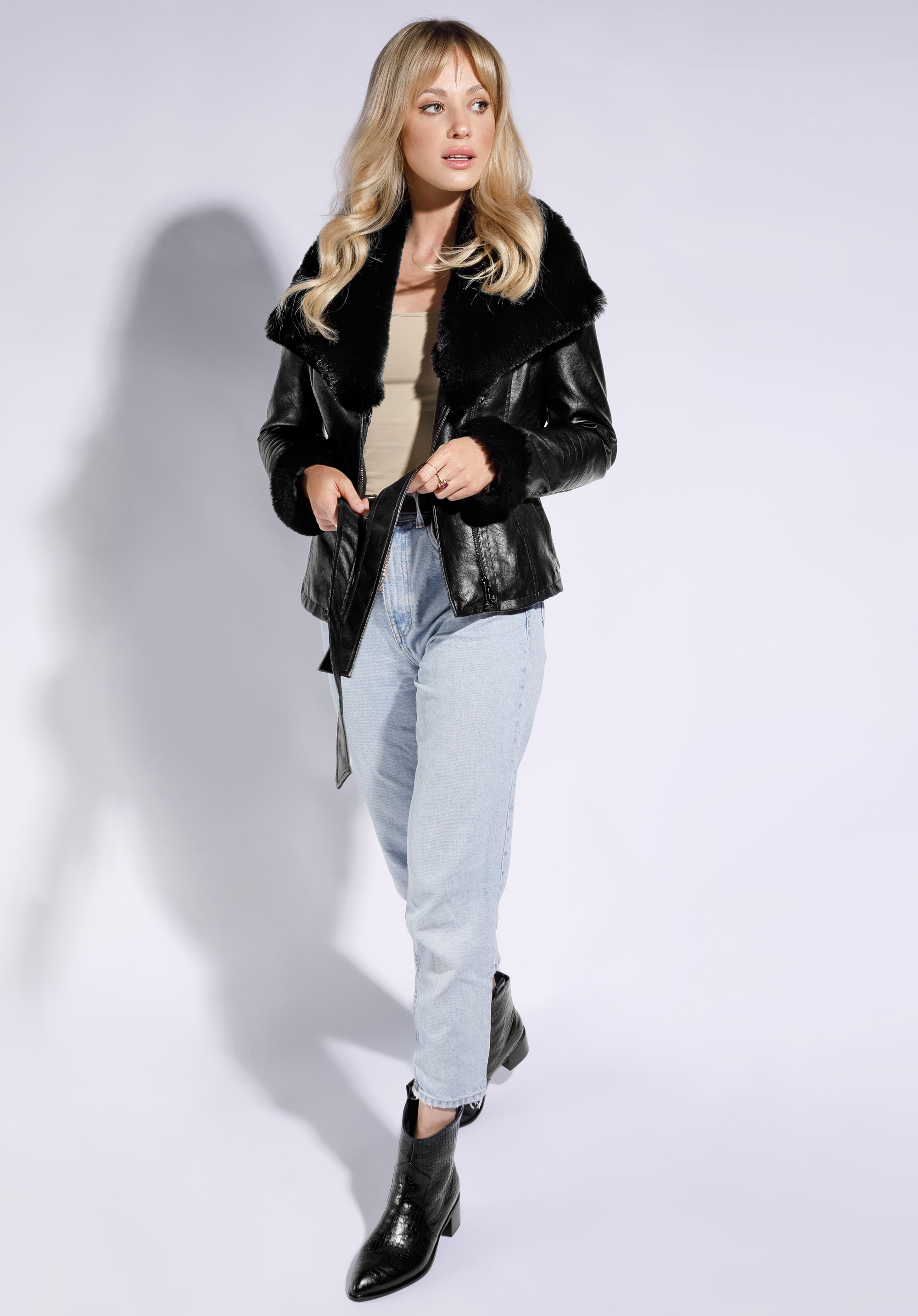 széles műszőrme gallér teszi sikkessé a megjelenést.A kabátot övvel megkötve kiemelheted a derekad.Remekül fogsz mutatni egy testhezálló, nőies ruhában, és karaktert kölcsönöz a farmernadrágnak és a pulóvernek a mindennapi viselethez.