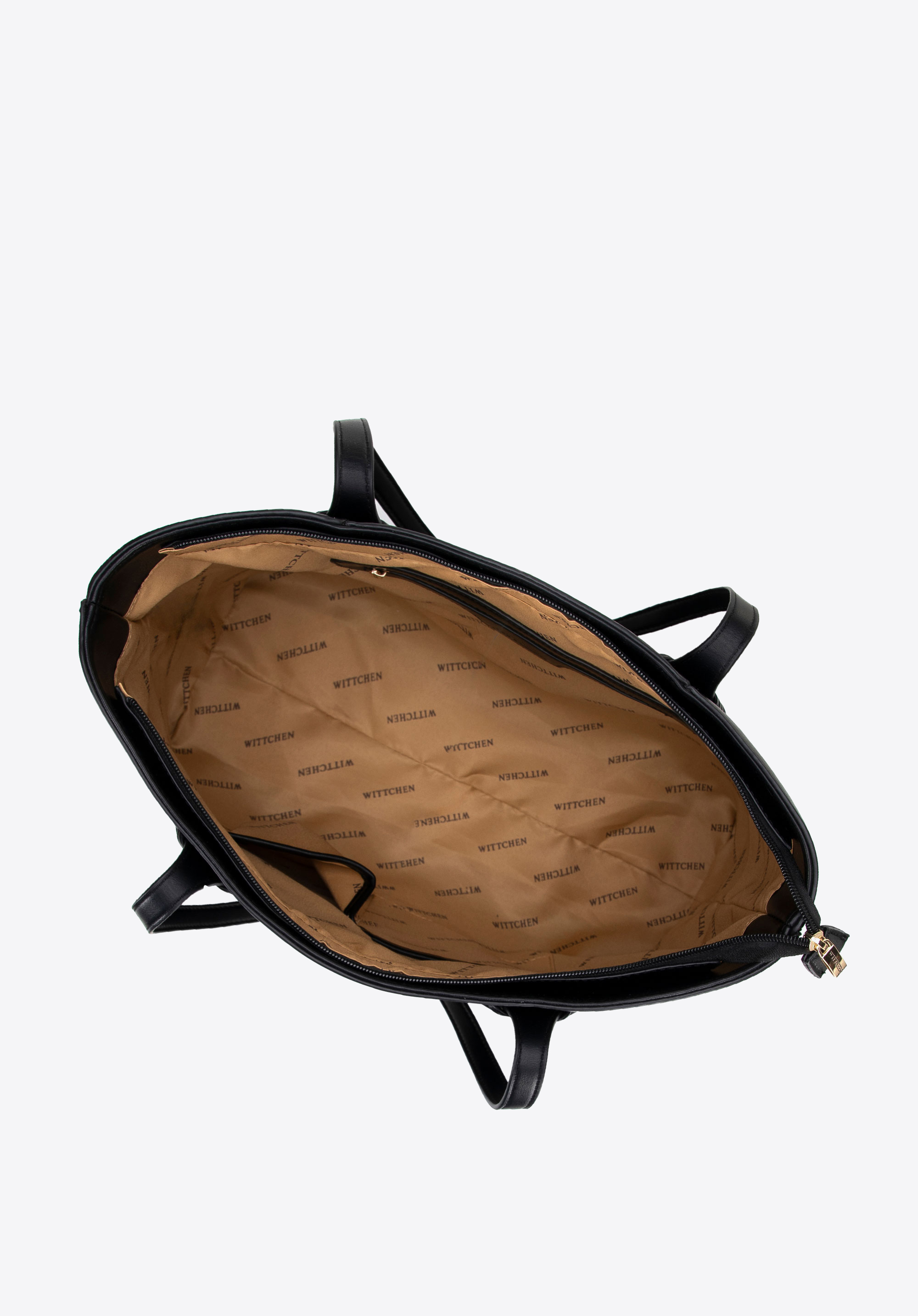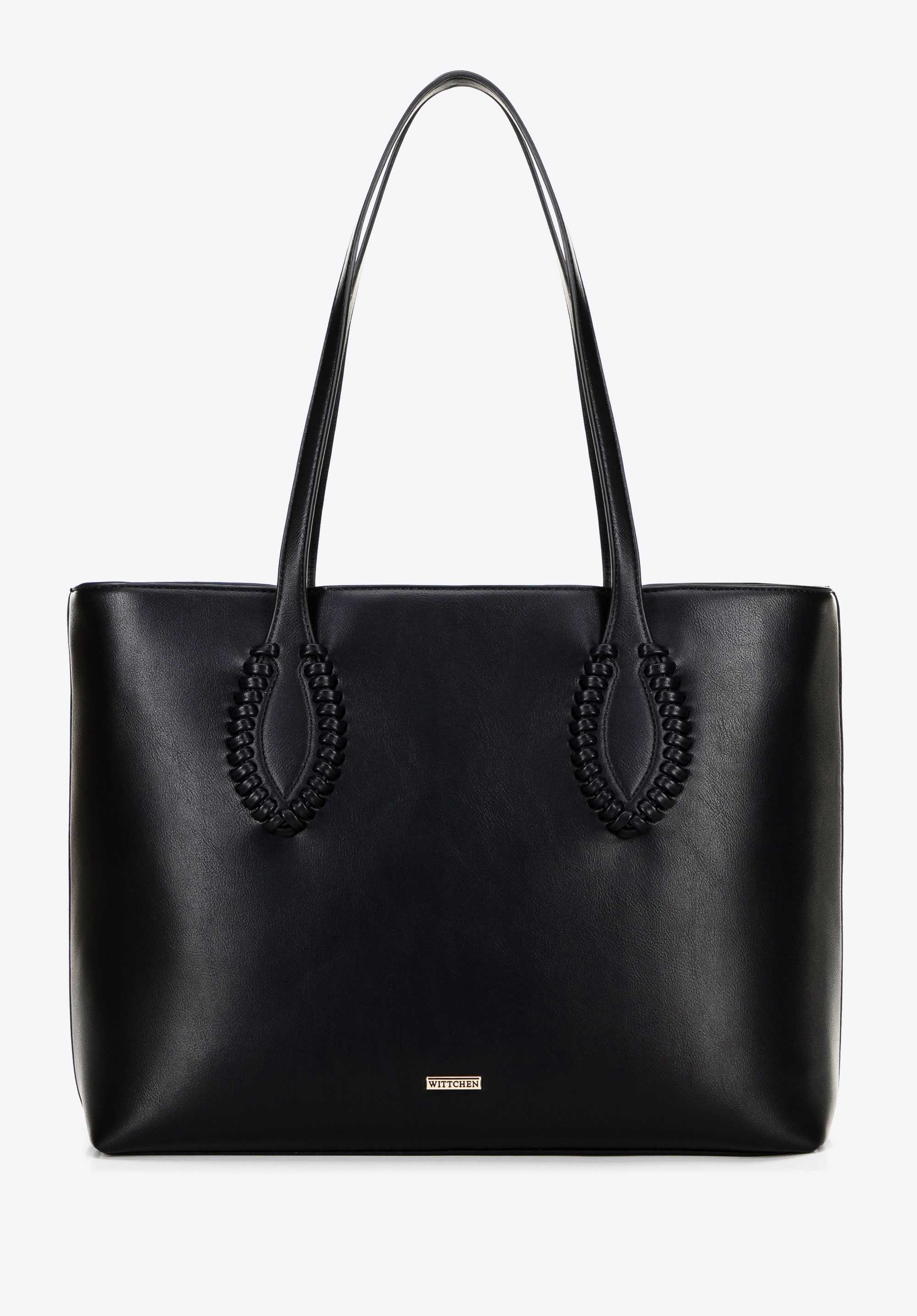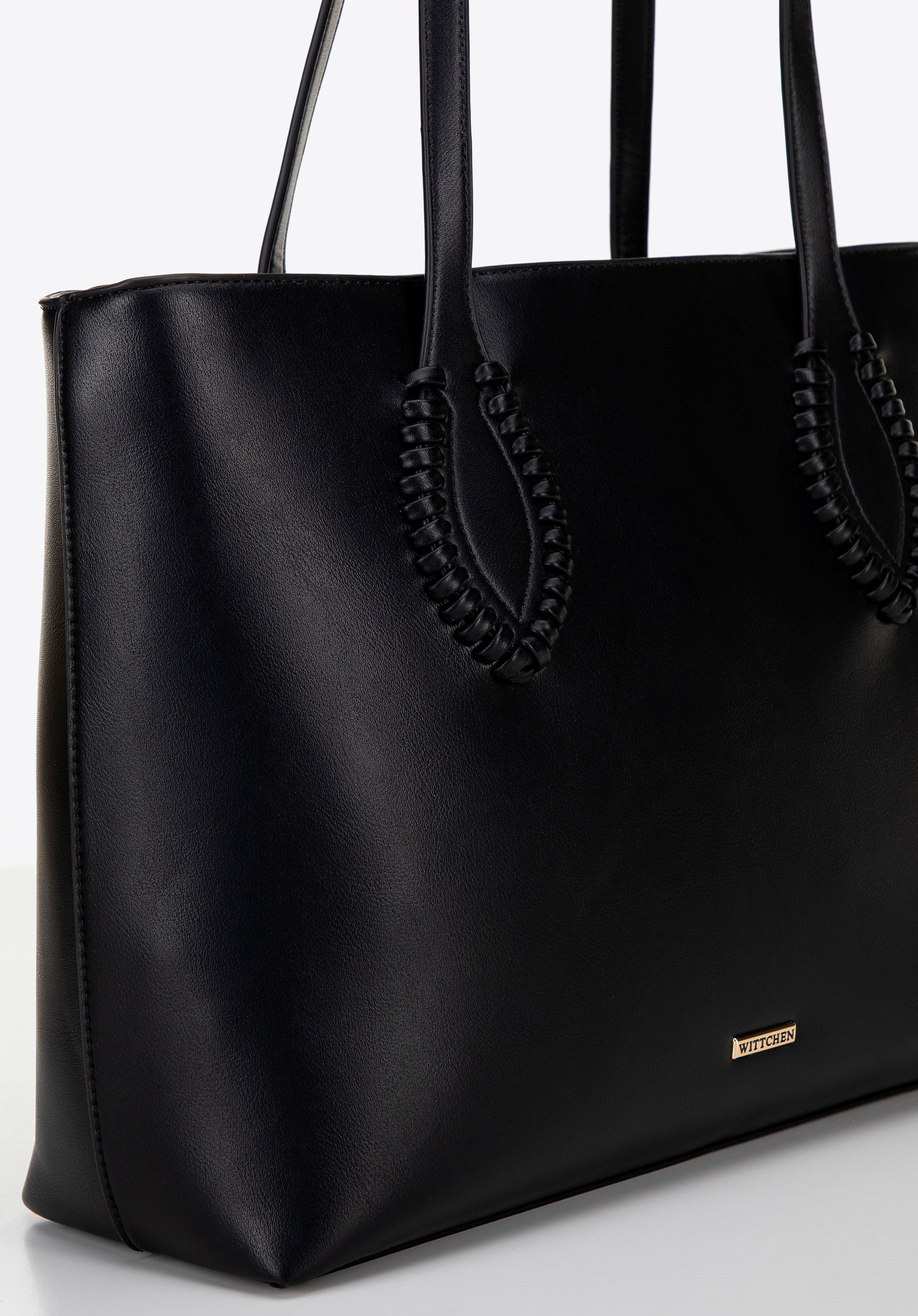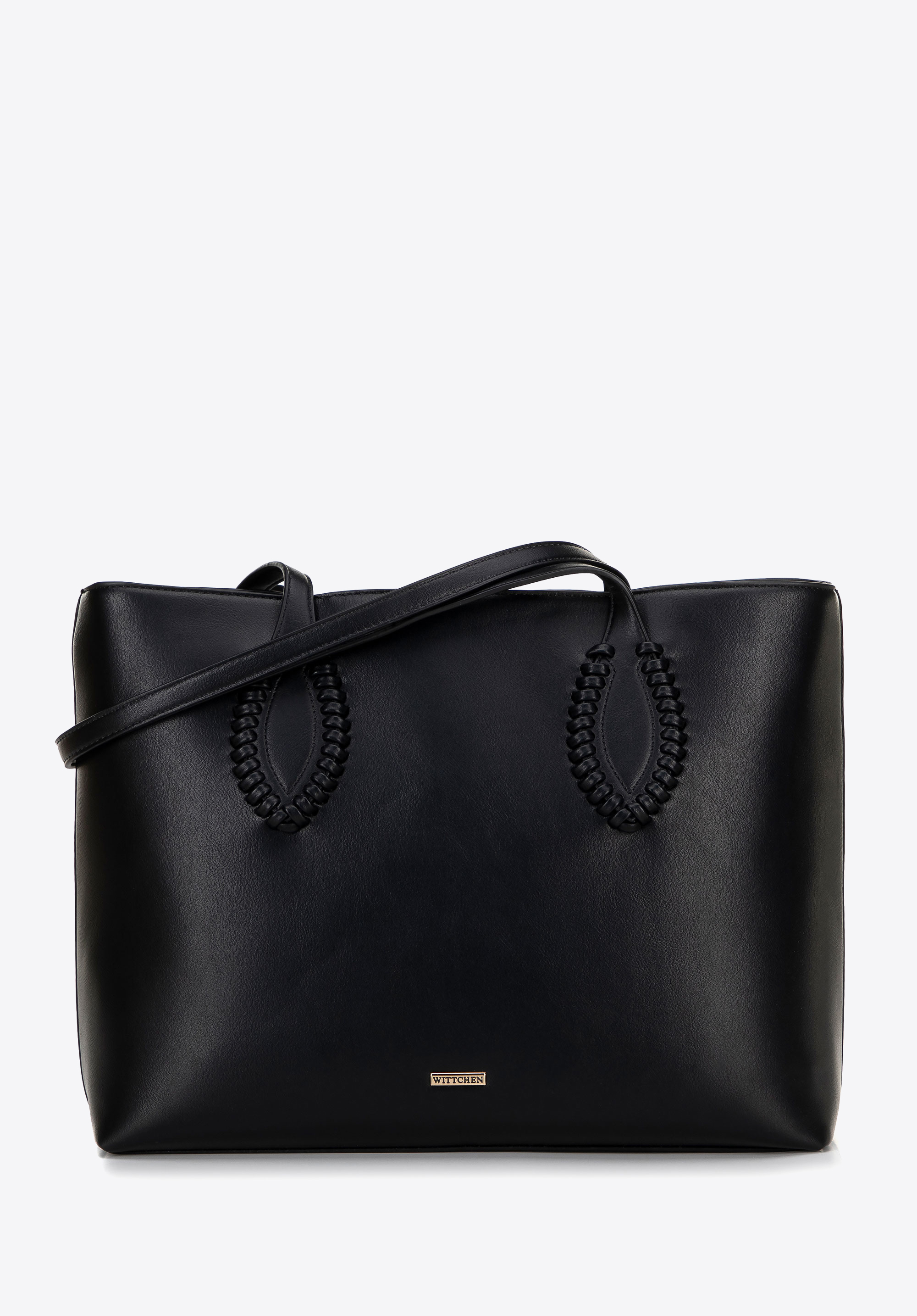 Stílusos, tágas és tökéletesen szervezett – ez a shoppertáska elengedhetetlen a mindennapi ruhákhoz. Klasszikus dizájnja finom részletekkel kibővítve tökéletesen illeszkedik az elegáns és a hétköznapi megjelenéshez. Két kényelmes fogantyú lehetővé teszi a könnyű vállon hordozást, míg a fogantyúk dekoratív szőtt részlete egyedi megjelenést kölcsönöz. A táska cipzárral záródik, belsejében pedig három praktikus zseb található, köztük egy cipzáras zseb. Egy további nyitott zseb a hátoldalon tökéletes a legfontosabb dolgok számára.