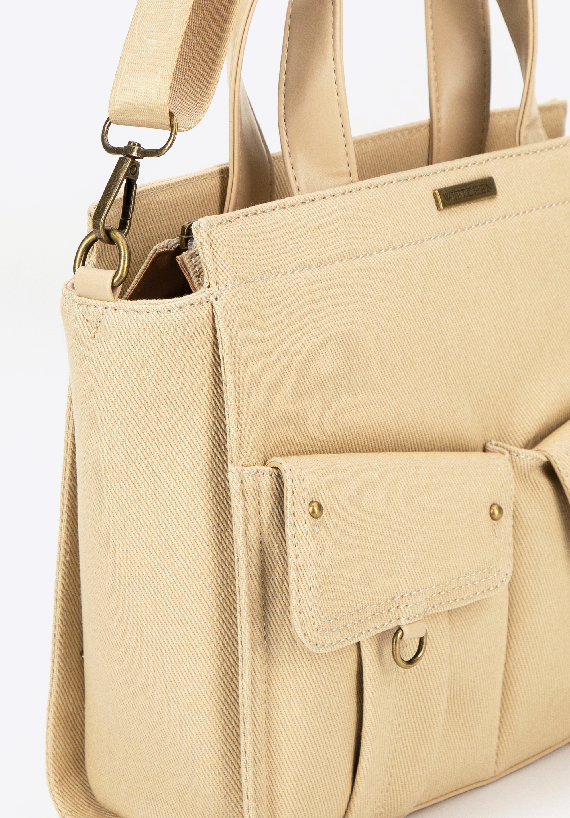 Bemutatjuk a táskát, amely a klasszikus dizájnt a modern funkcionalitással ötvözi. Pamutból , poliészterből és műbőrből készült, így tartós és ellenáll a napi használatnak. Két ökobőrből készült fogantyú biztosítja a kényelmes hordozást a kézben, az állítható pánt pedig kényelmes vállviselést tesz lehetővé. A kézitáska elején két stílusos, mágneses záródású füles zseb található, amelyek tökéletesek a kéznél tartani kívánt apró tárgyak számára.