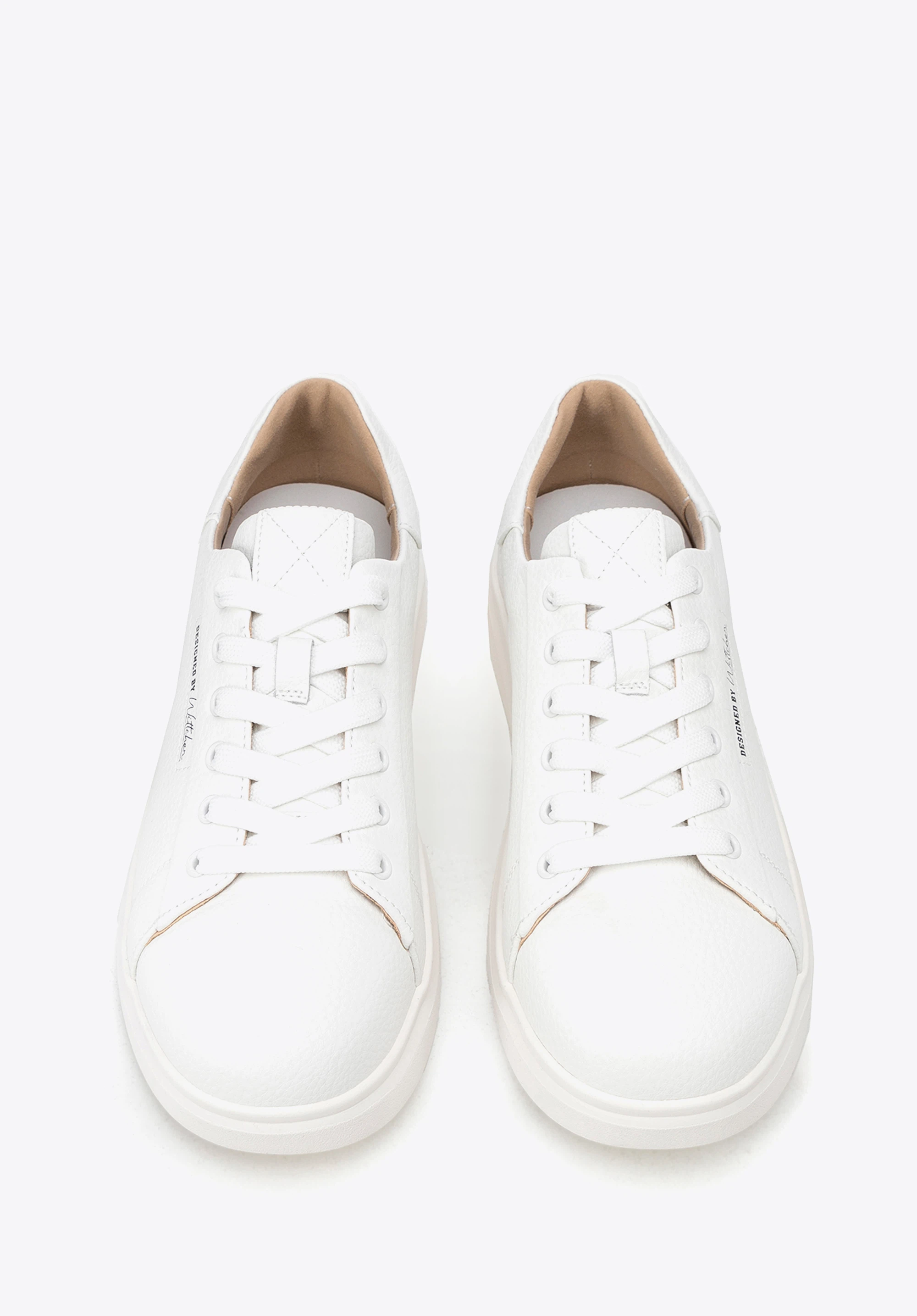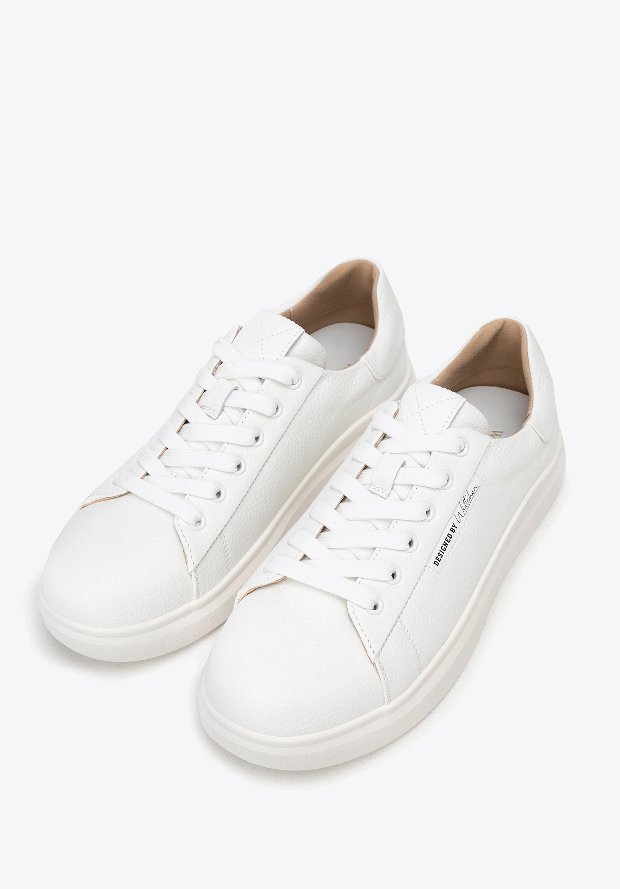Ez az elegáns női edzőcipő a kényelmet és a divatos dizájnt ötvözi, így kiváló minőséget kínáln a mindennapi viselethez. Ökobőrből készült, tartós, ellenáll a sérüléseknek és könnyen kezelhető. Modern megjelenése tökéletesen illeszkedik a legújabb trendekhez. Fűzős kialakítás, lekerekített orrú, jól illeszkedik a lábfejhez, így egész napos kényelmet biztosít. A gumiból készült, szív alakú hornyokkal díszítettplatformtalp nemcsak stabilitást és tapadást biztosít, hanem egyedi karaktert is ad a cipőnek.