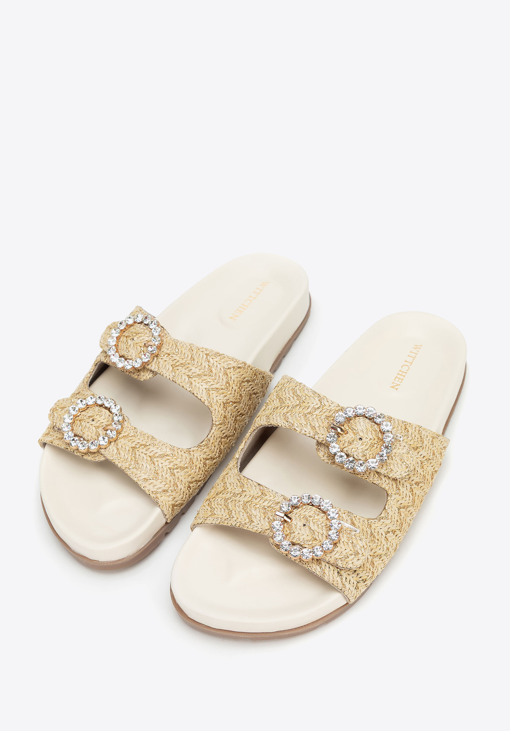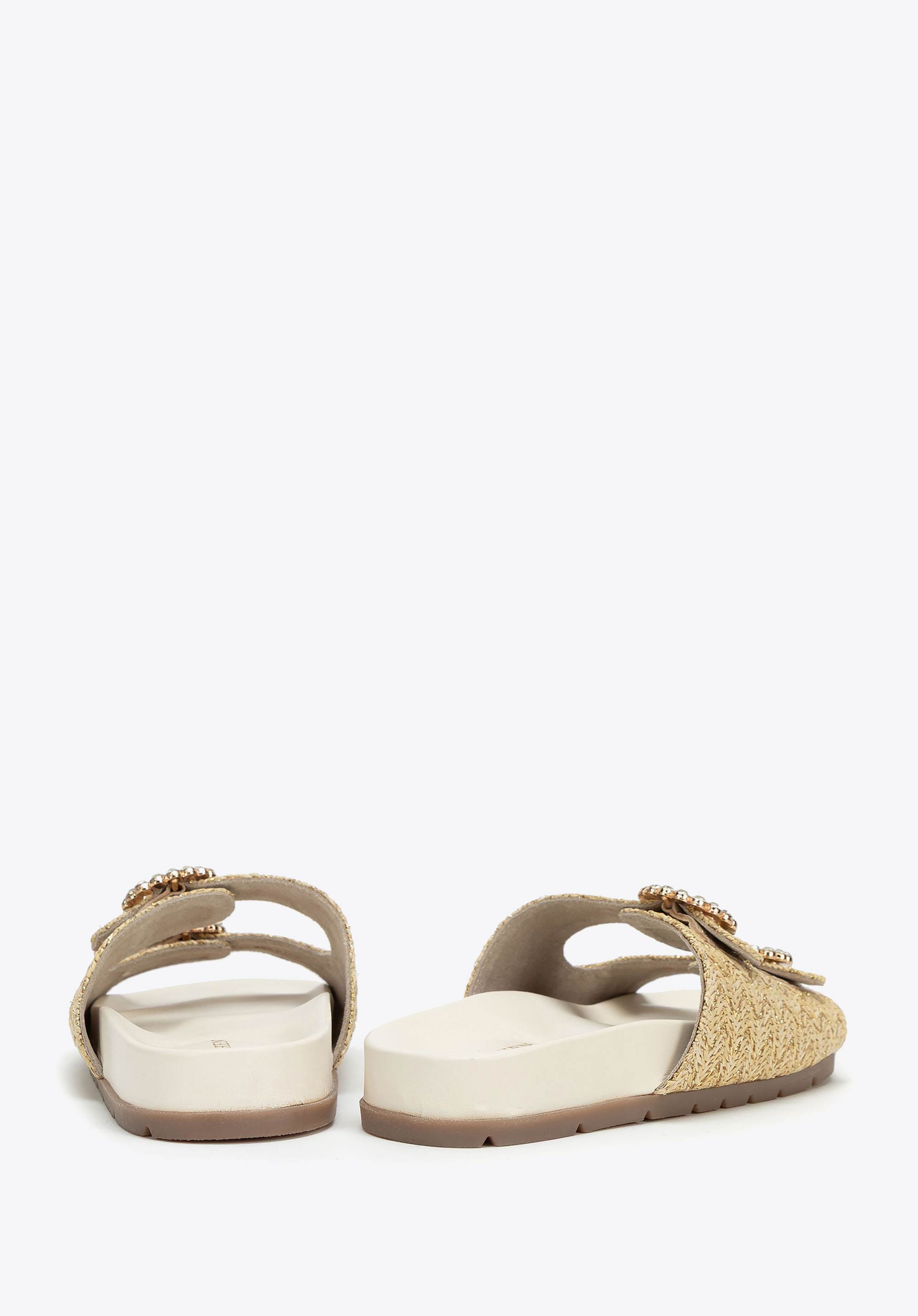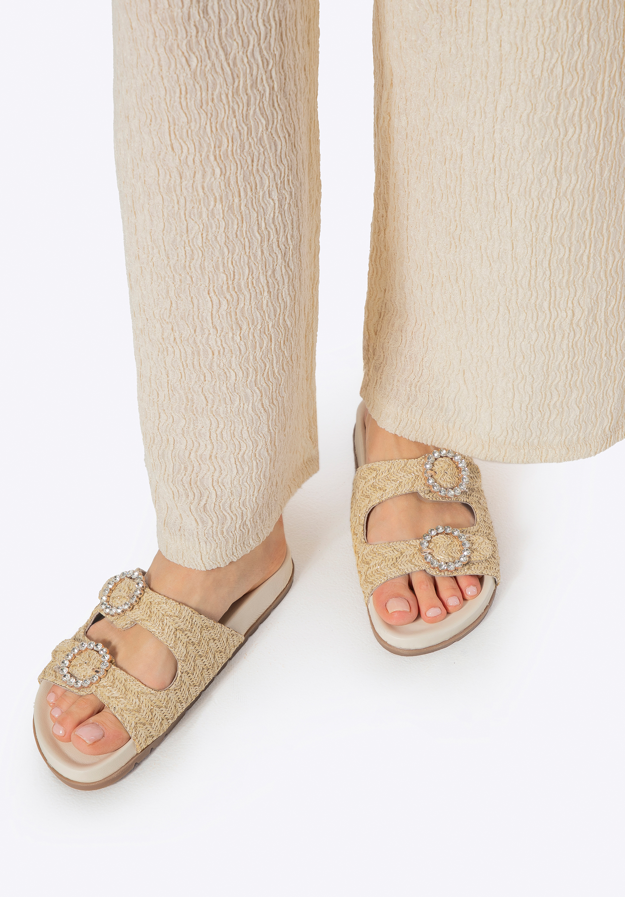 Olyan nyári lábbelit keresel, amely a kényelmet a divattal ötvözi? Akkor ez a női papucs tökéletes választás a napsütéses napokra - akár egy nyaraláshoz, akár a mindennapi városi stílushoz. Belebújós stílusú, nyitott és lekerekített orrú. Könnyed és elegáns viseletet kölcsönöznek bármilyen öltözéknek. Az elülső két, fényes csatokkal rögzített pánt nem csak kényelmes illeszkedést biztosít, hanem finom részletekkel is felhívja magára a figyelmet.