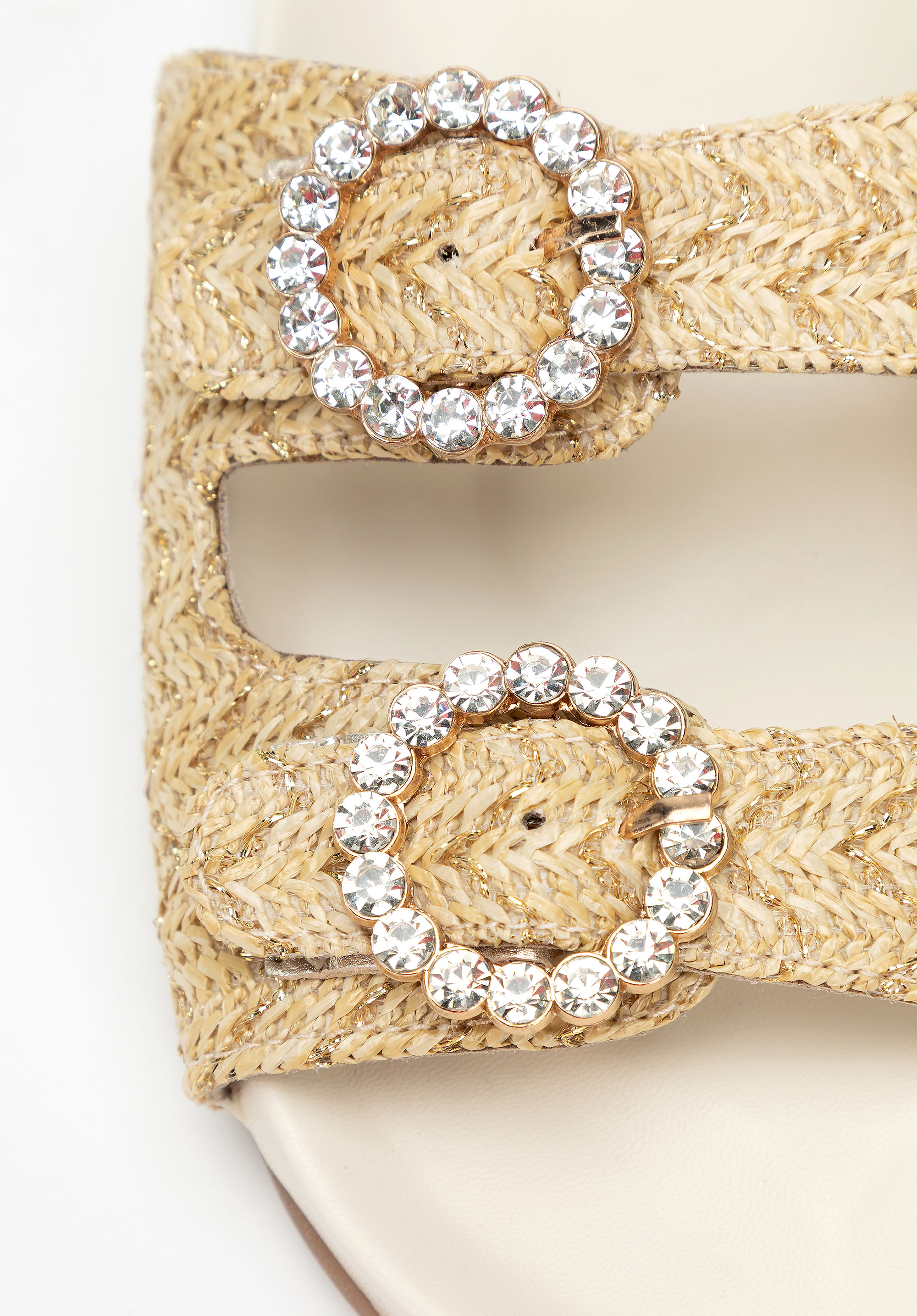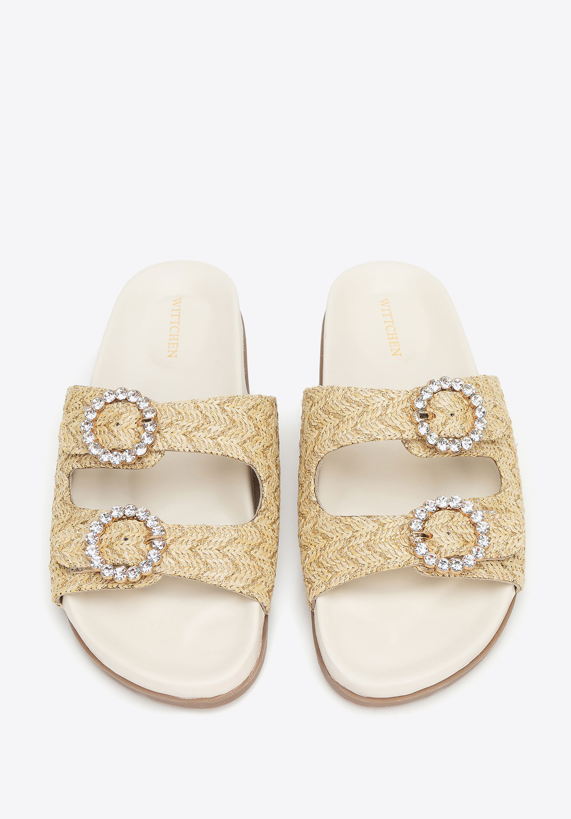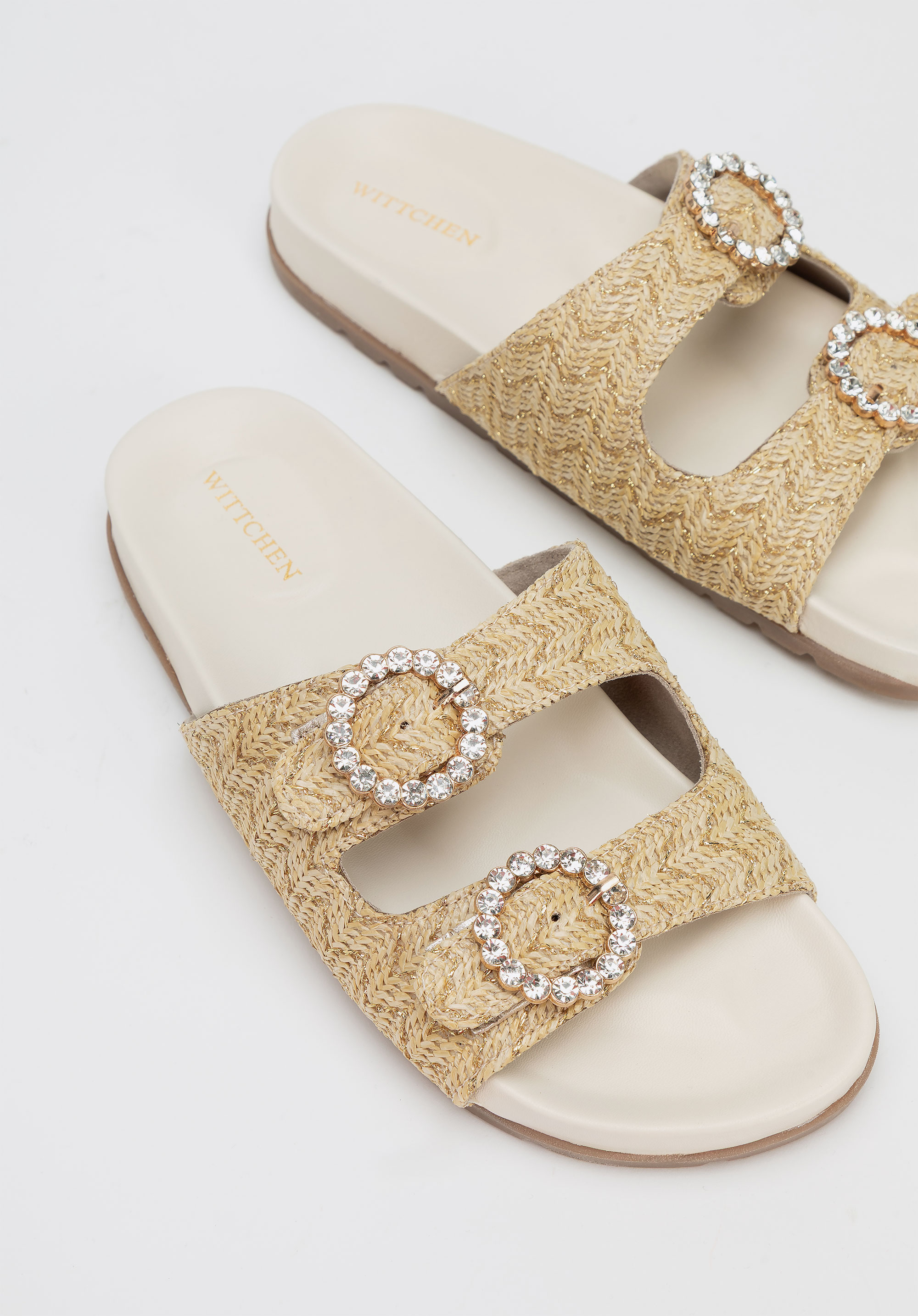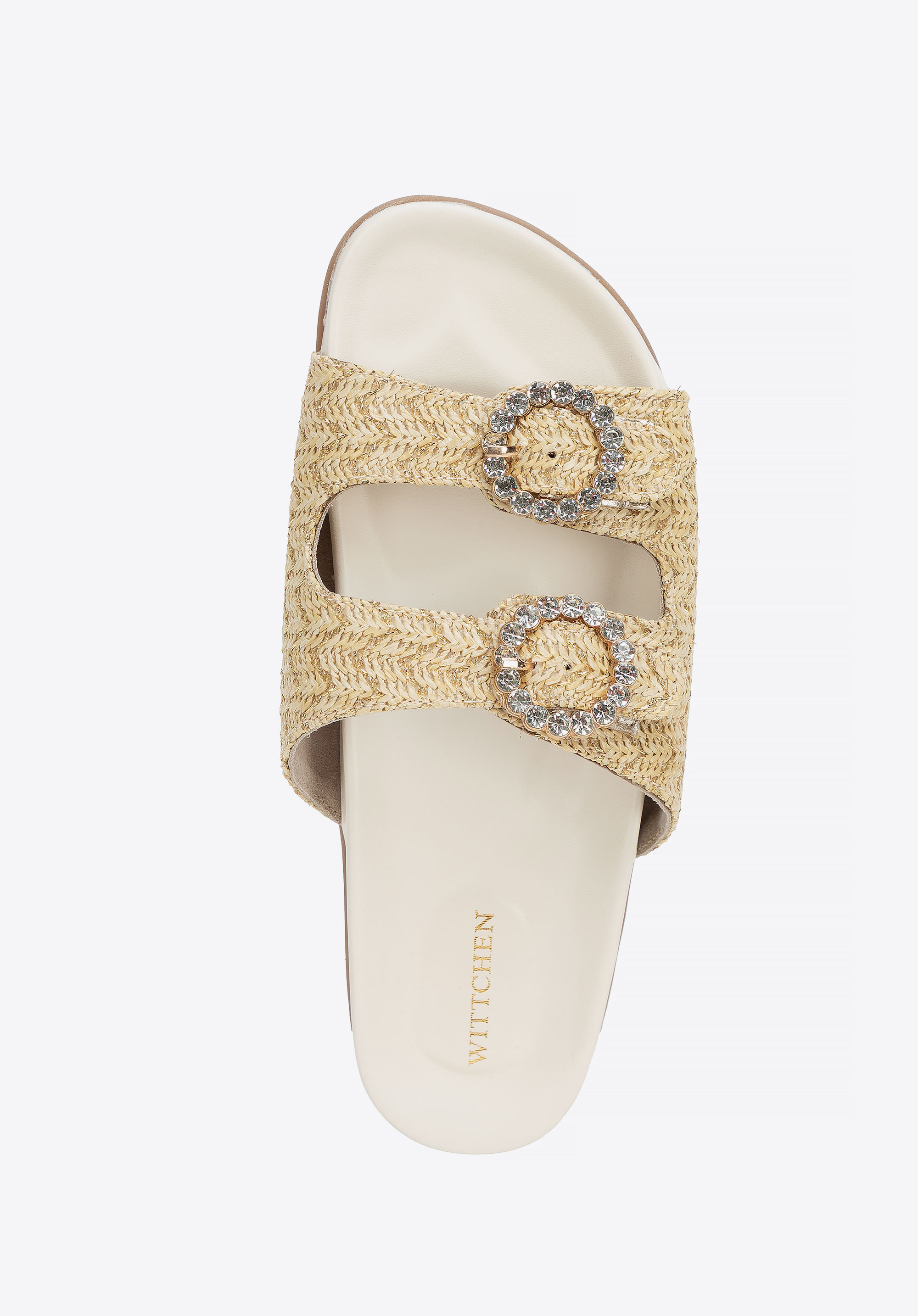 Olyan nyári lábbelit keresel, amely a kényelmet a divattal ötvözi? Akkor ez a női papucs tökéletes választás a napsütéses napokra - akár egy nyaraláshoz, akár a mindennapi városi stílushoz. Belebújós stílusú, nyitott és lekerekített orrú. Könnyed és elegáns viseletet kölcsönöznek bármilyen öltözéknek. Az elülső két, fényes csatokkal rögzített pánt nem csak kényelmes illeszkedést biztosít, hanem finom részletekkel is felhívja magára a figyelmet.