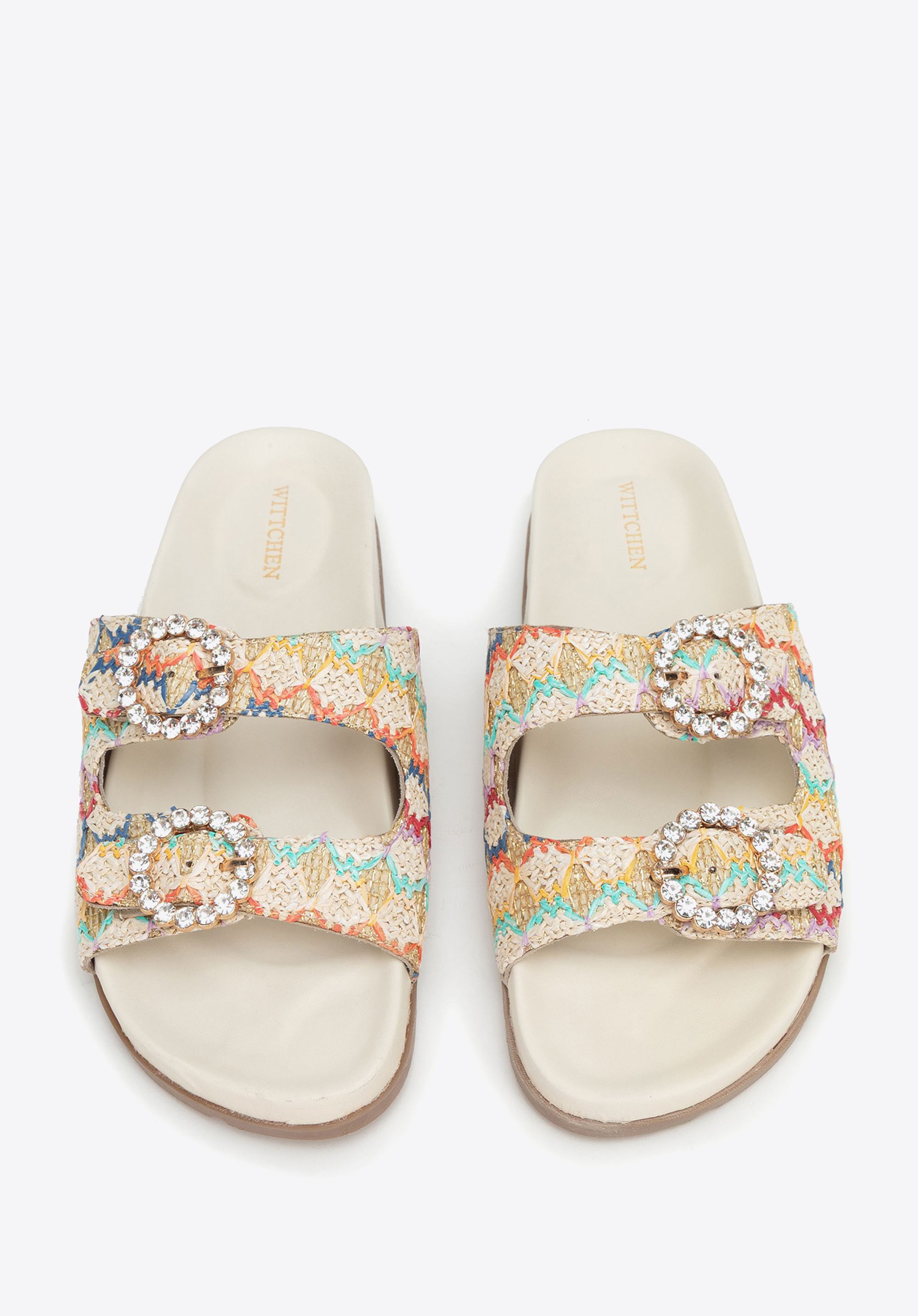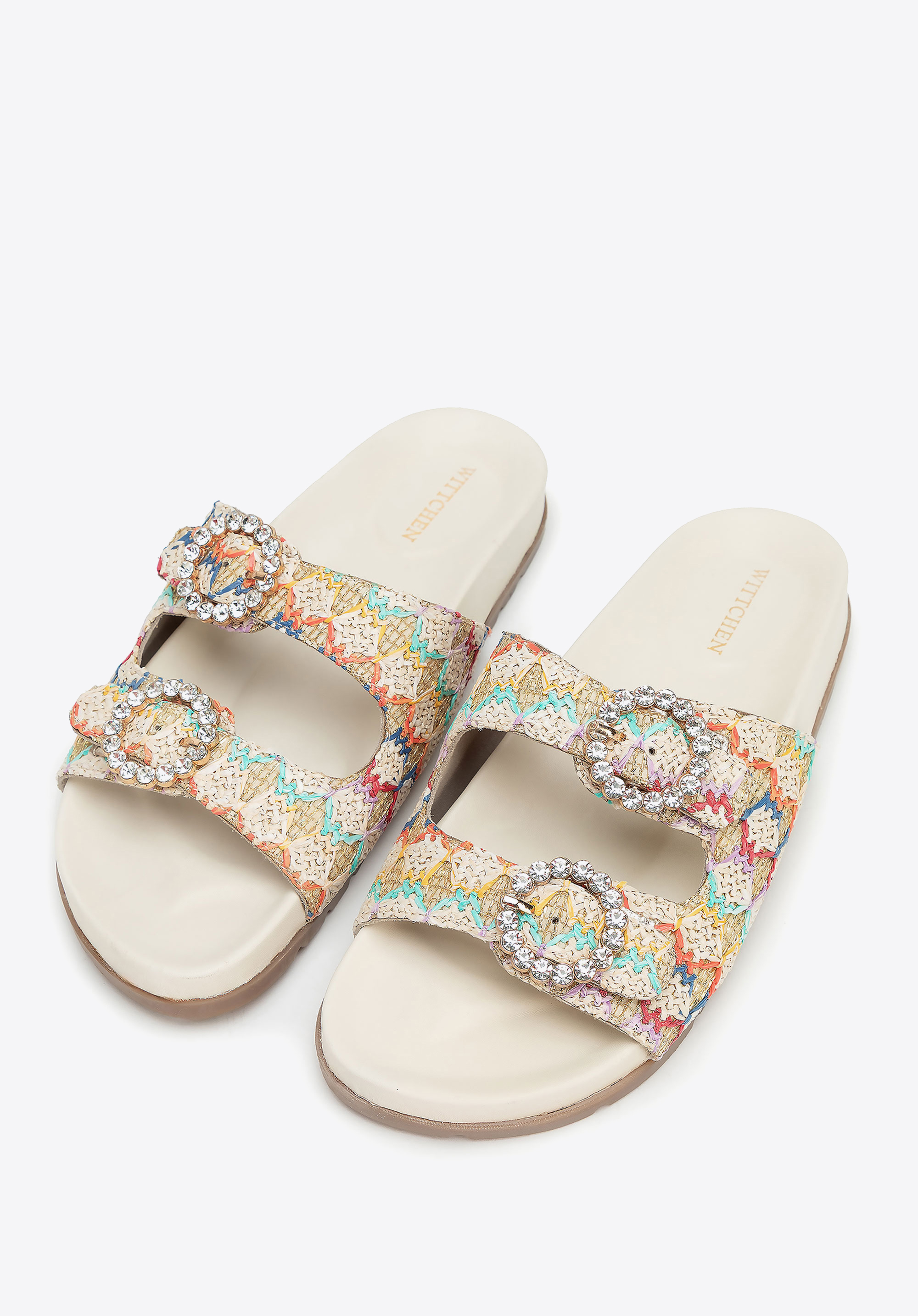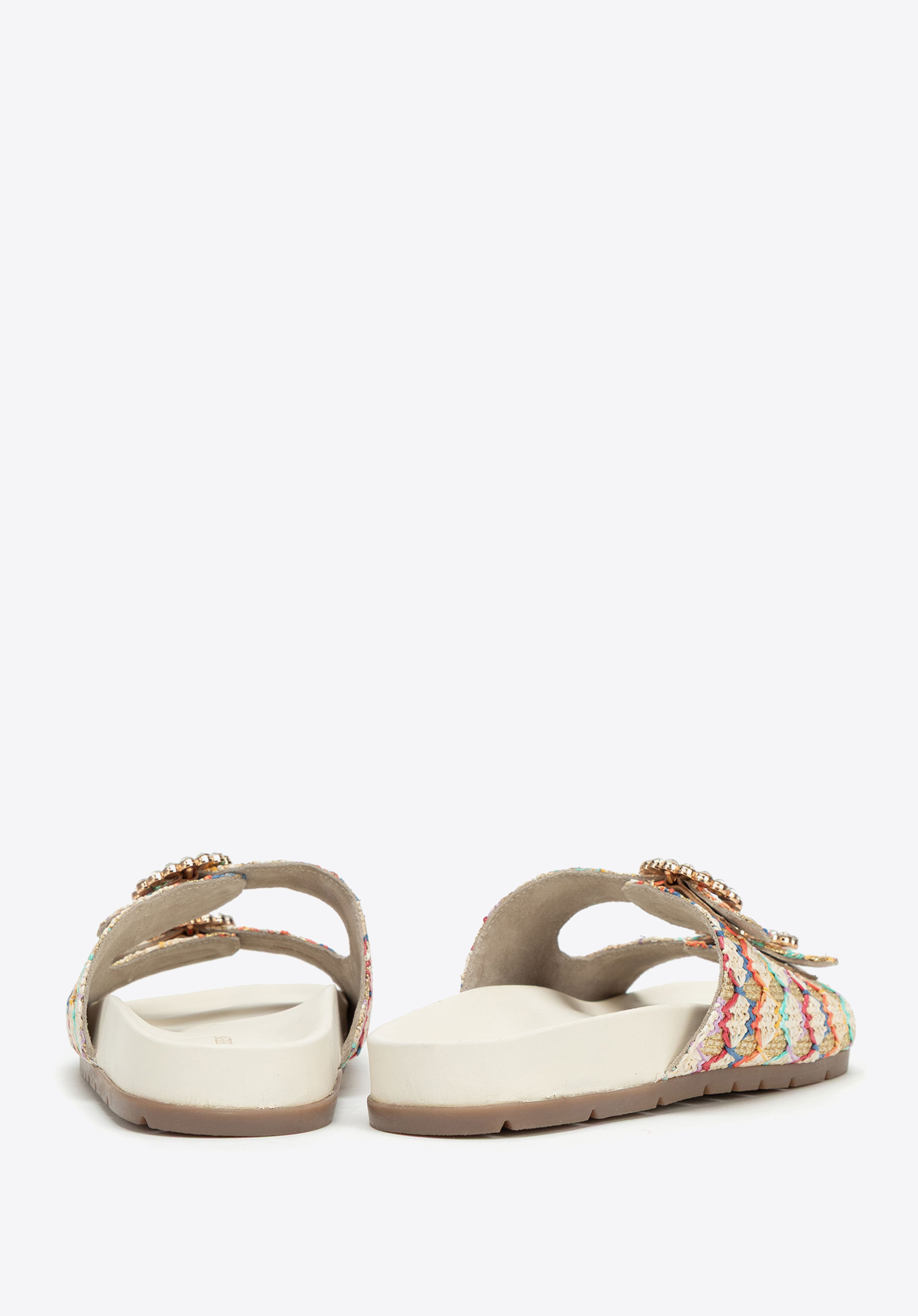 Olyan nyári lábbelit keresel, amely a kényelmet a divattal ötvözi? Akkor ez a női papucs tökéletes választás a napsütéses napokra - akár egy nyaraláshoz, akár a mindennapi városi stílushoz. Belebújós stílusú, nyitott és lekerekített orrú. Könnyed és elegáns viseletet kölcsönöznek bármilyen öltözéknek. Az elülső két, fényes csatokkal rögzített pánt nem csak kényelmes illeszkedést biztosít, hanem finom részletekkel is felhívja magára a figyelmet.