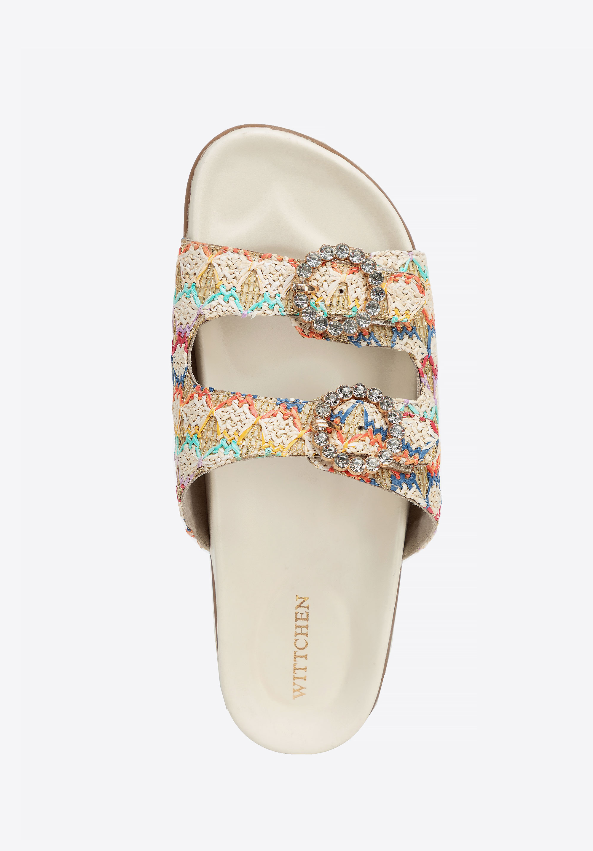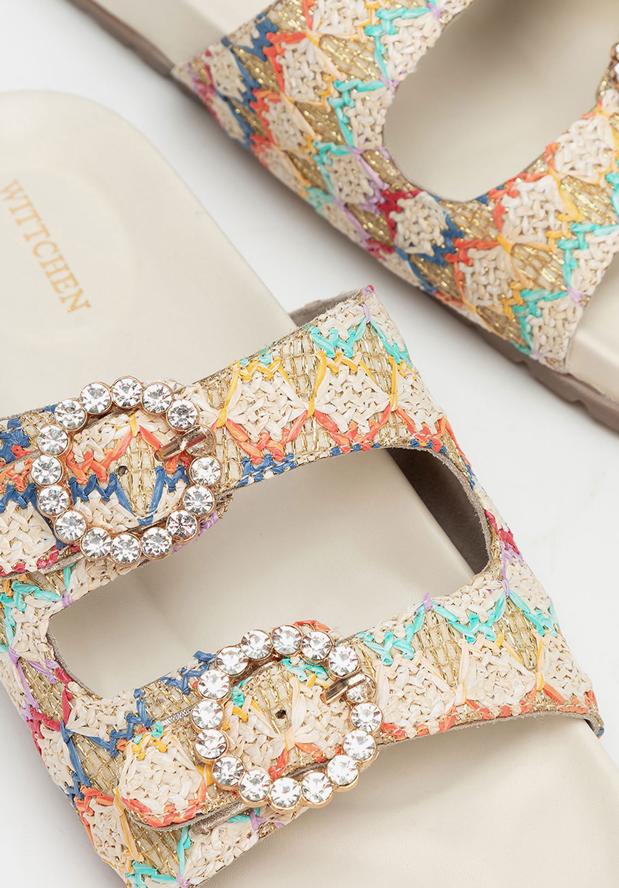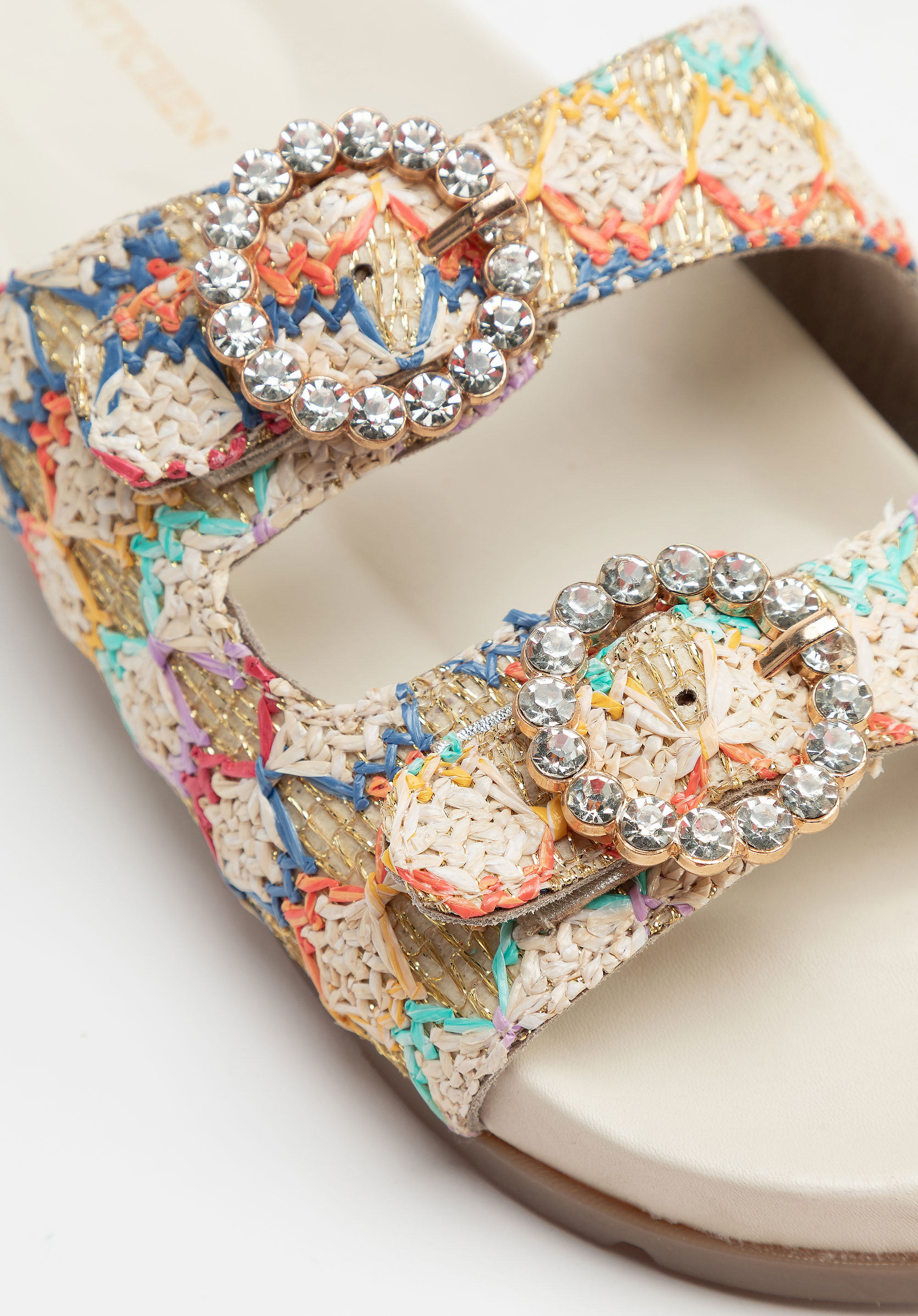 Olyan nyári lábbelit keresel, amely a kényelmet a divattal ötvözi? Akkor ez a női papucs tökéletes választás a napsütéses napokra - akár egy nyaraláshoz, akár a mindennapi városi stílushoz. Belebújós stílusú, nyitott és lekerekített orrú. Könnyed és elegáns viseletet kölcsönöznek bármilyen öltözéknek. Az elülső két, fényes csatokkal rögzített pánt nem csak kényelmes illeszkedést biztosít, hanem finom részletekkel is felhívja magára a figyelmet.