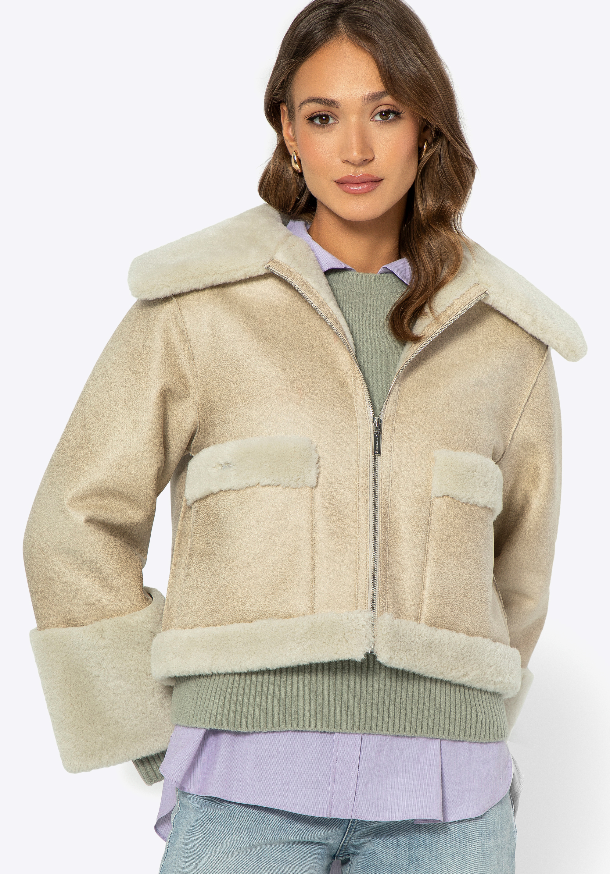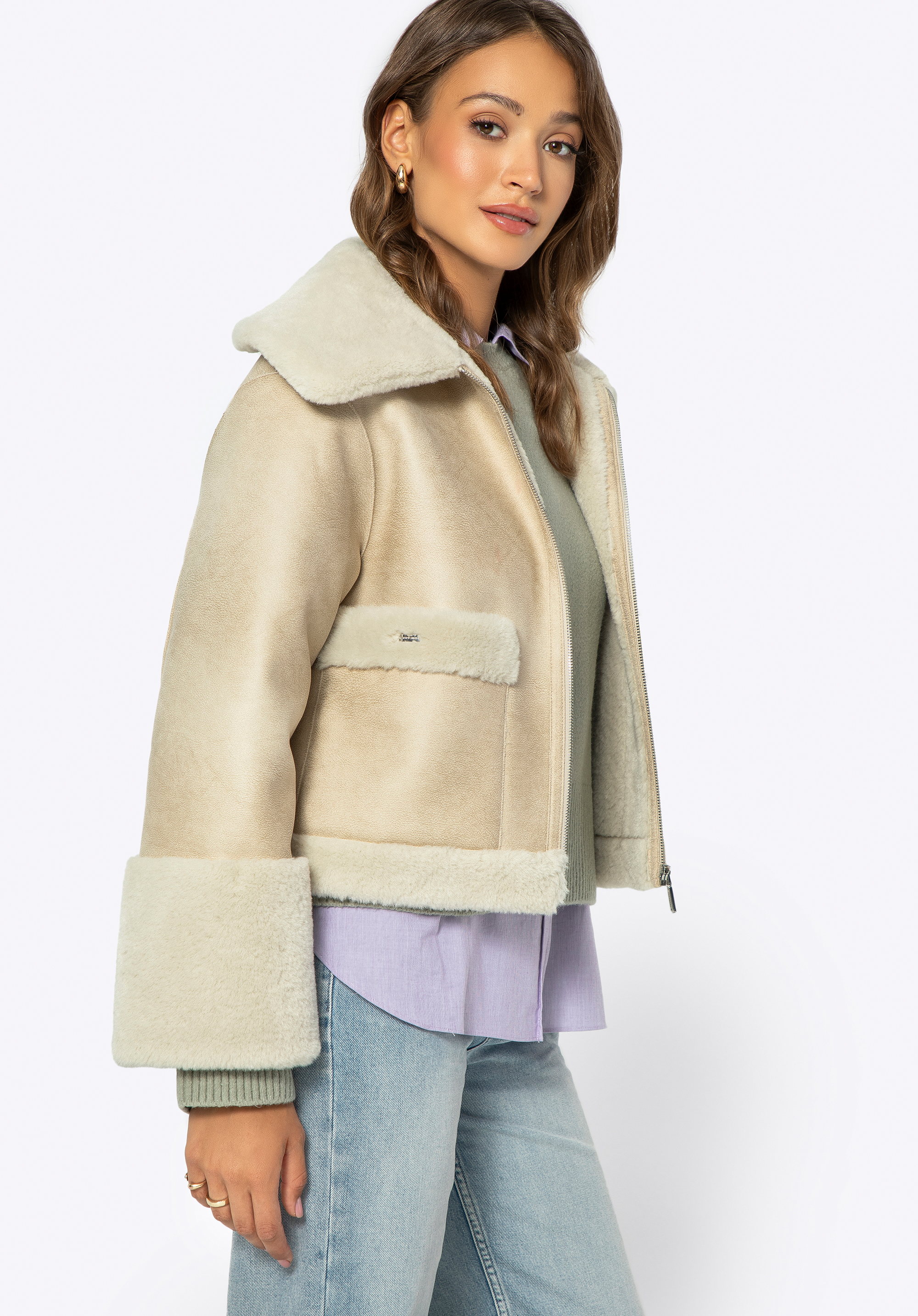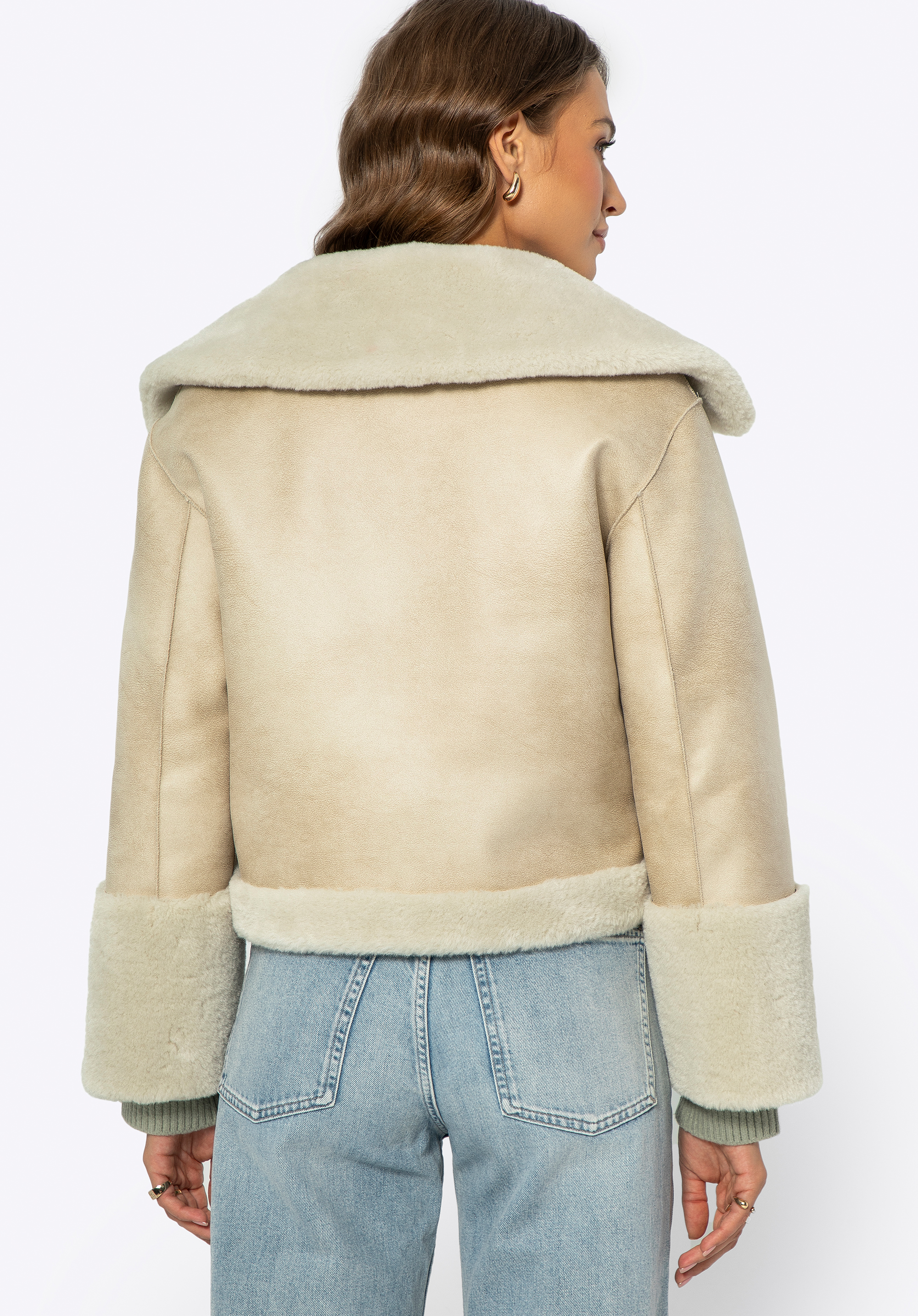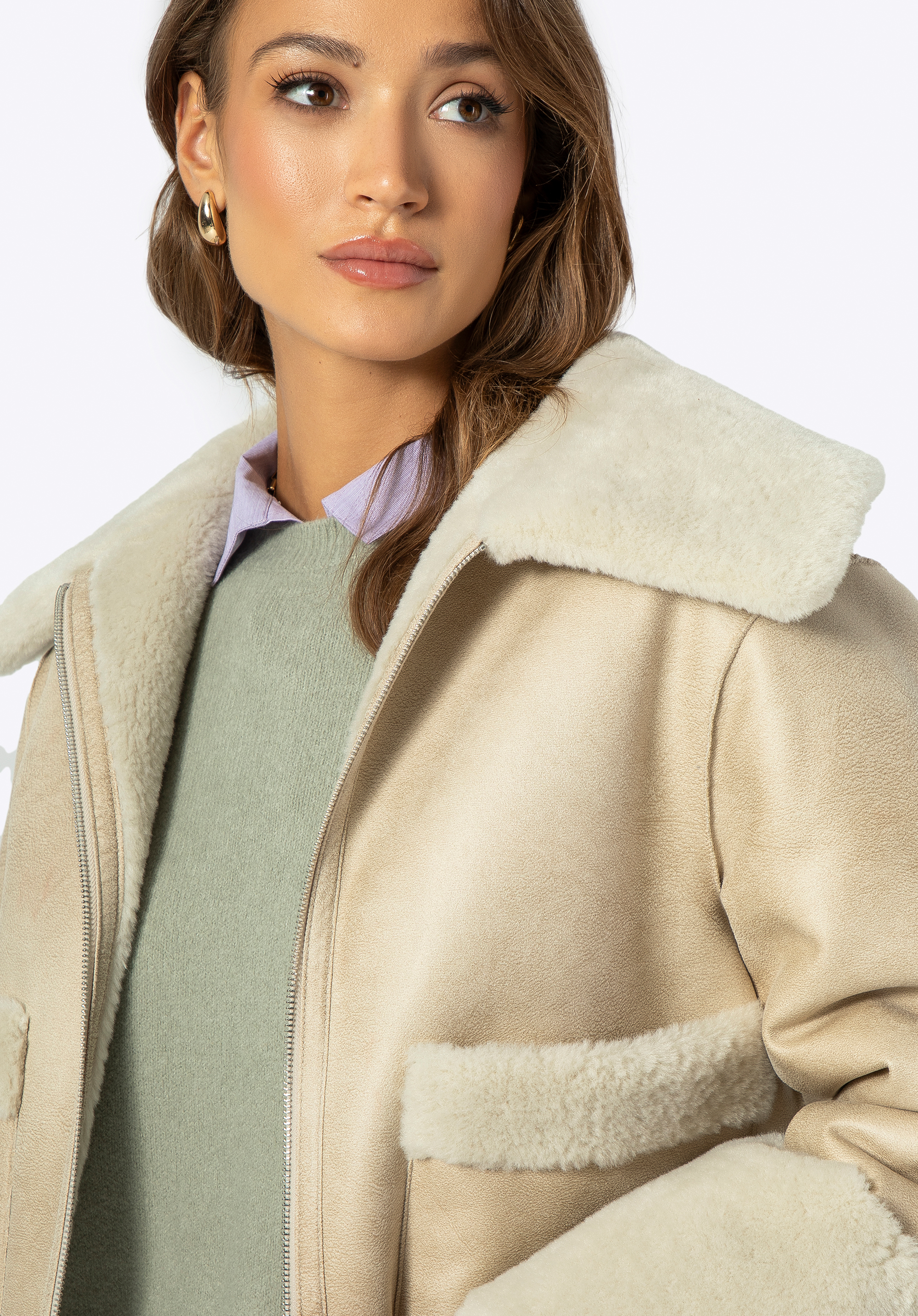 - Anyaga: Puha és finom műszőrme a kabát bélésén, gallérján, zsebeiben és alján.