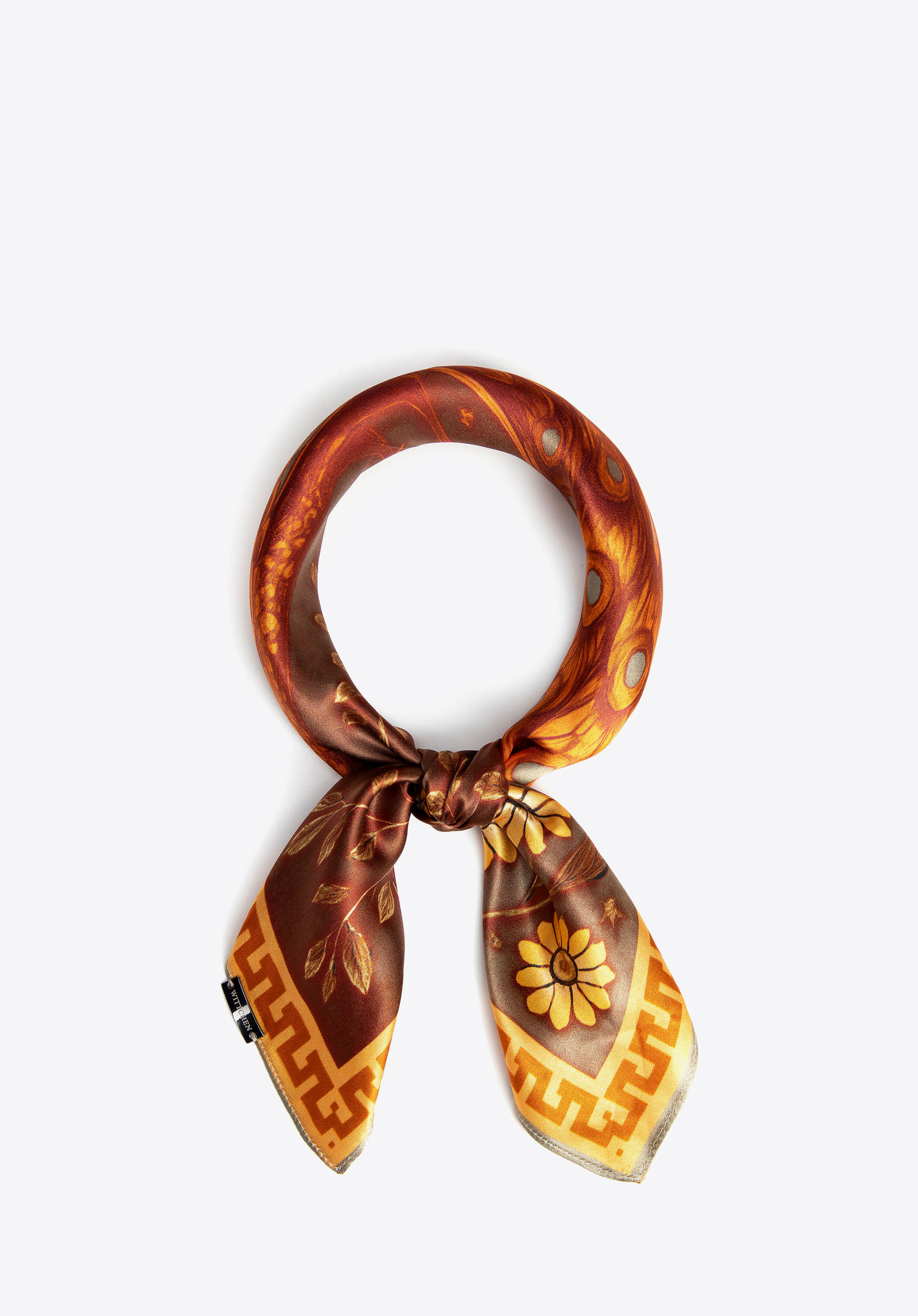 - Méretek: 53 × 53 cm -es méretével ez egy sokoldalú méret, amely számos stíluslehetőséget kínál – tökéletes nyakba akasztva vagy kézitáskára kötve.