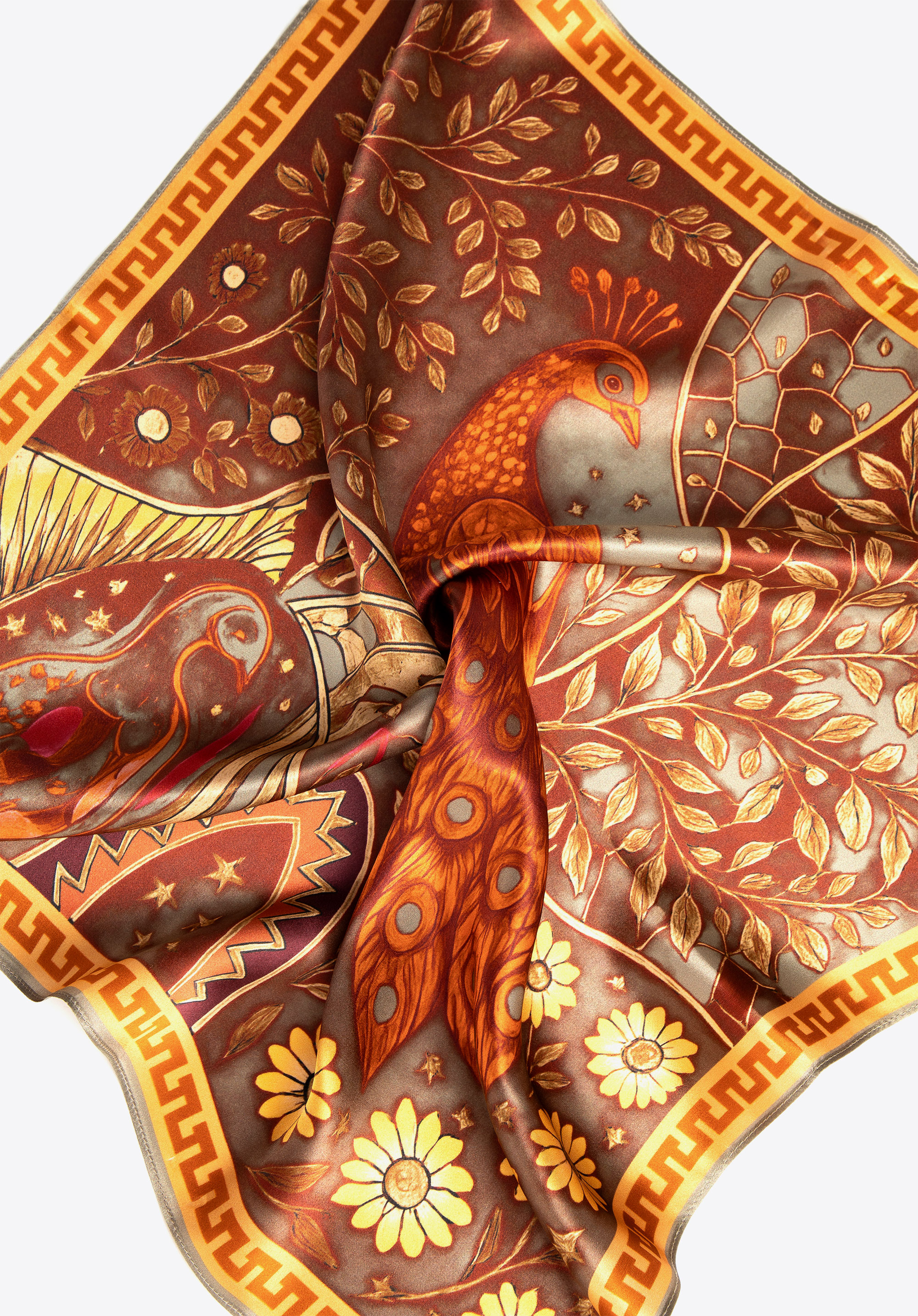 Feltűnő pávaminta tiszta selyemre – ez a kendő művészi, természet ihlette részleteket visz bármilyen öltözékbe. A minta feltűnő pávát ábrázol gazdag botanikai részletek között – szemet gyönyörködtető, mégis gyönyörűen komponált. Puha, könnyű és csodálatosan kényelmes viselet, gyönyörűen esik és finom eleganciát kölcsönöz bármilyen megjelenésnek.