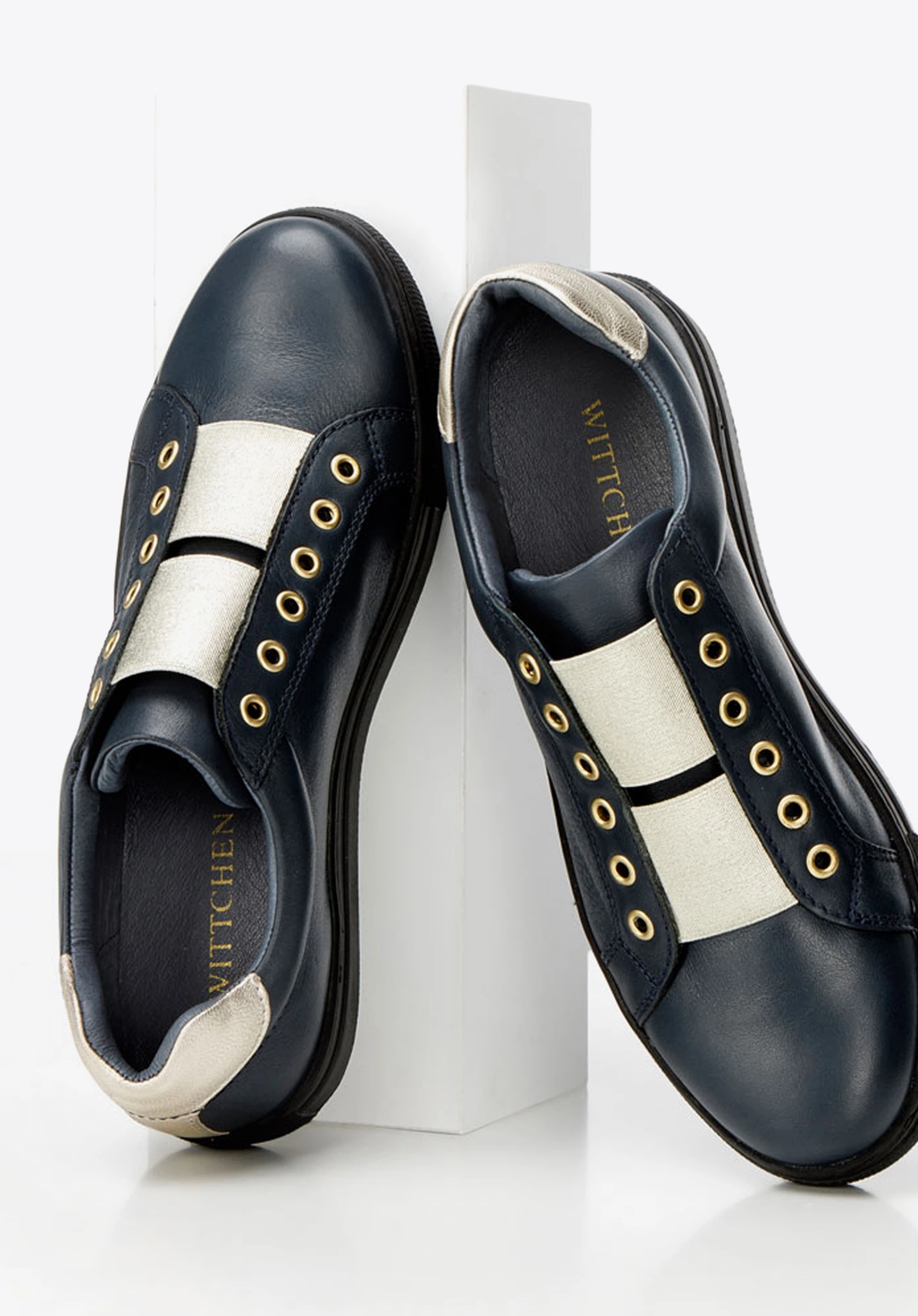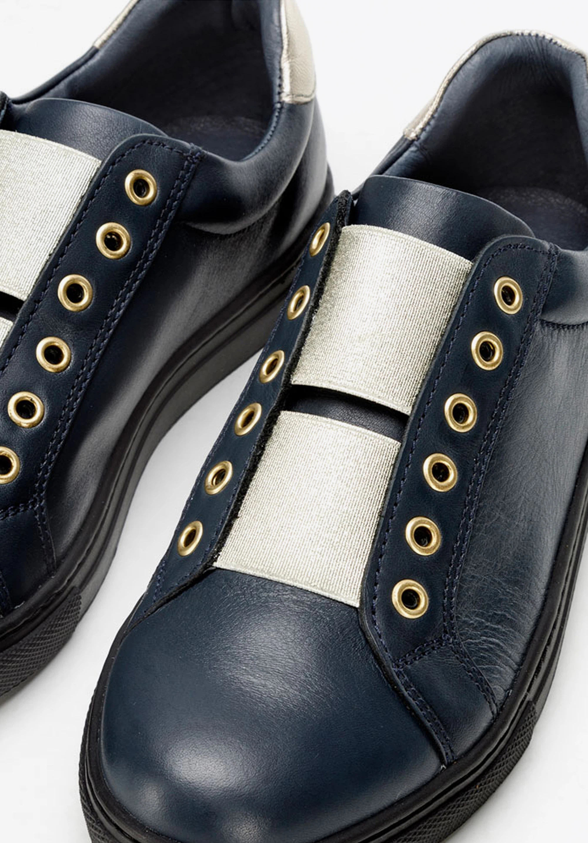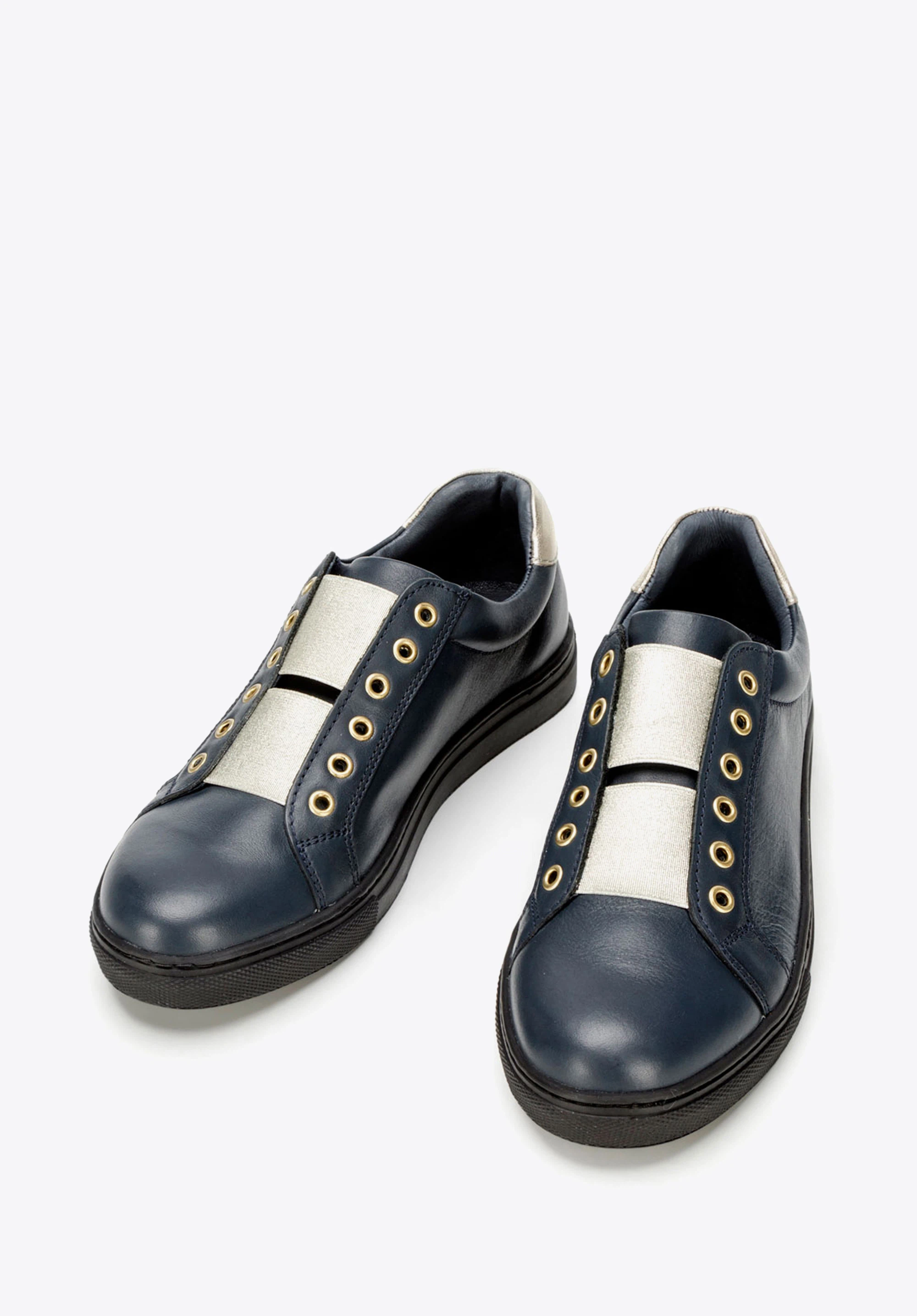 A sneakers cipők évek óta nagyon népszerűek a nők és a férfiak körében is. Ez a modell a sportcipők jelenlegi trendjeinek és funkcionalitásának a kombinációja. Remekül mutatnak a lábon, és nagyon kényelmes viselet. Kiváló minőségű szemes bőrből készültek. A cipőfűző aszimmetrikus arany színű lyukai csak dekorációként szolgálnak. Ezek a női rugalmas cipők tökéletesek a mindennapi viselethez.
