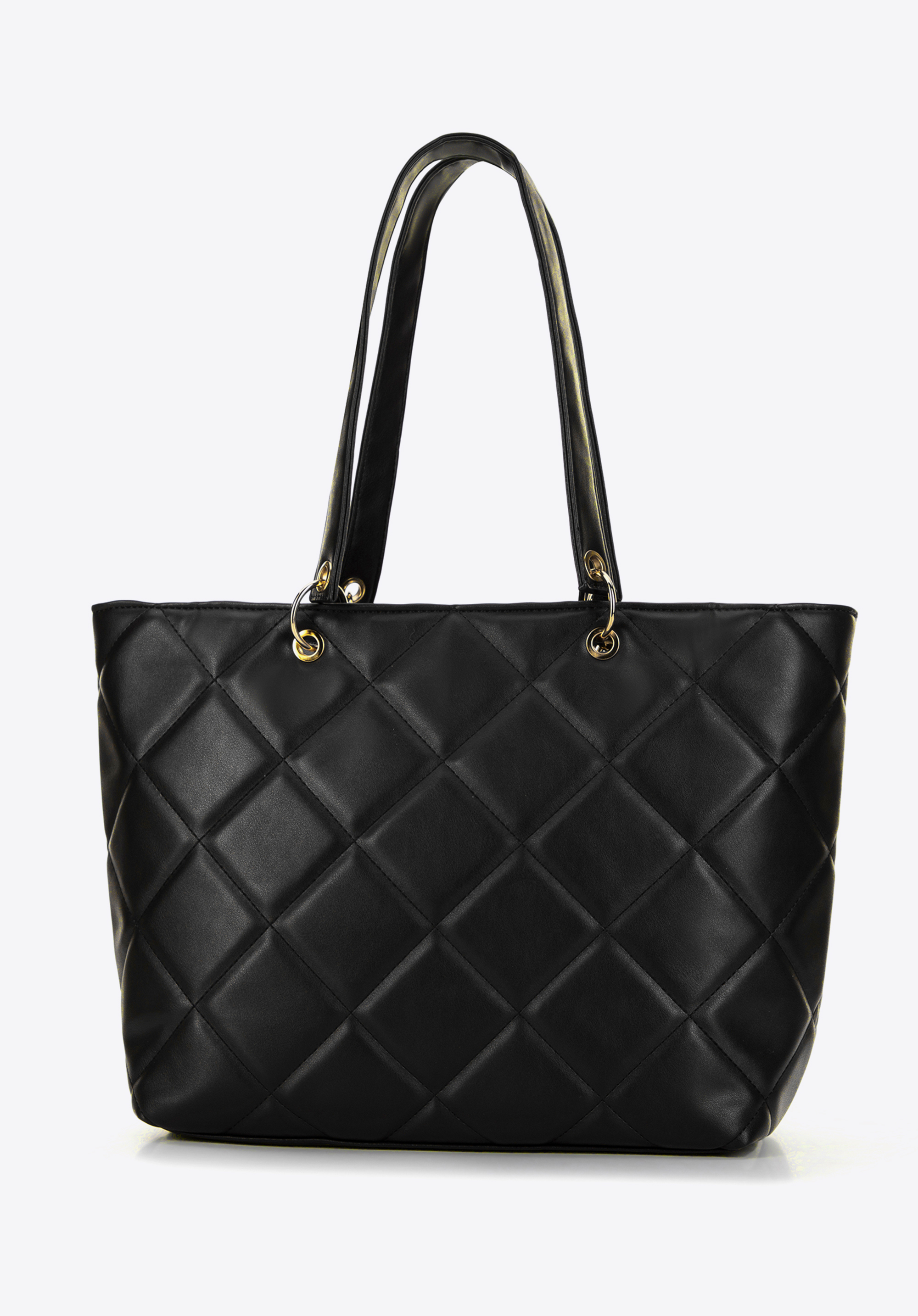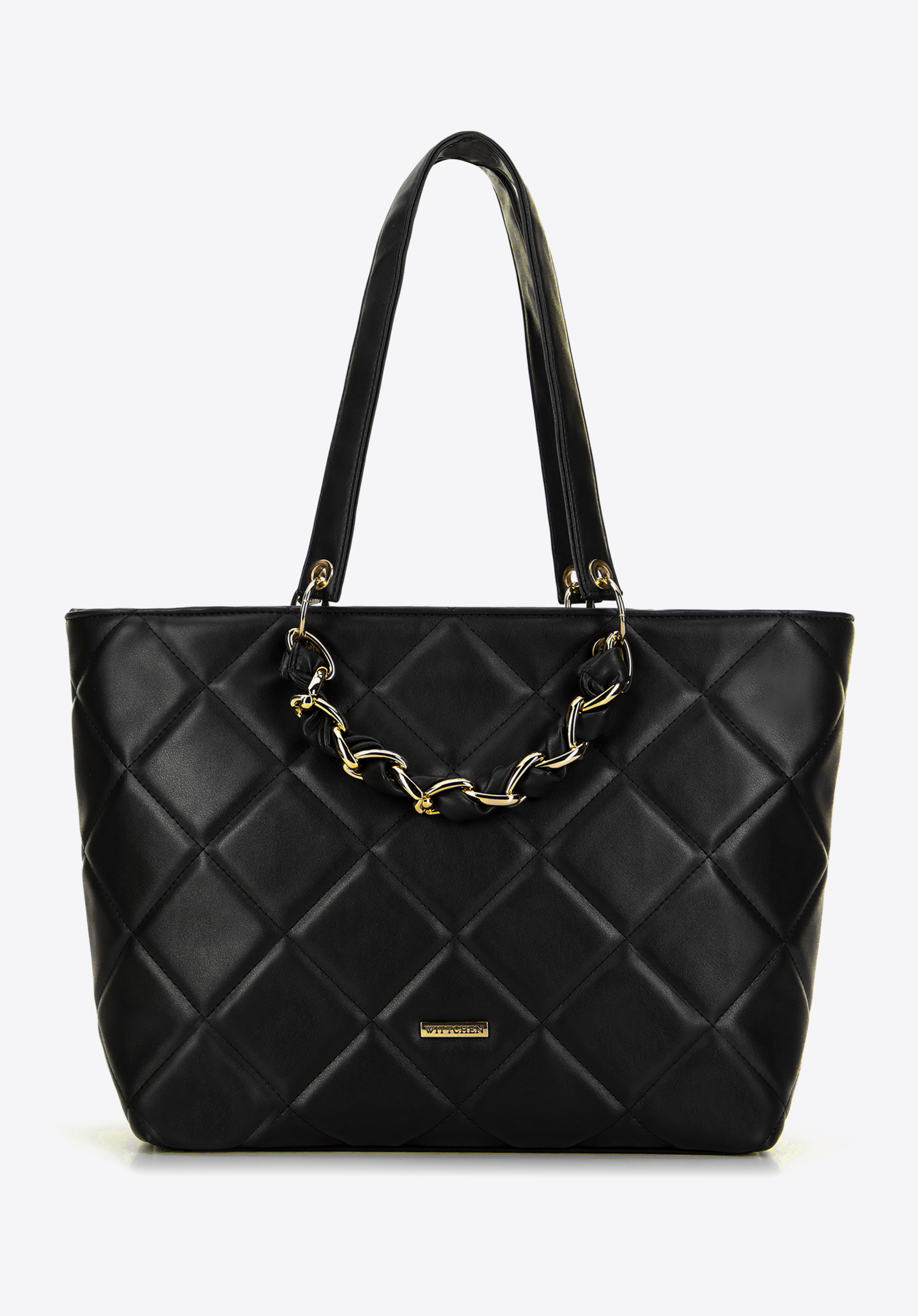Az egyrekeszes kézitáska geometrikus mintája stílusos, modern megjelenést kölcsönöz. A cipzáros zárás hatékonyan védi holmijaidat, míg az erős talp stabilitást biztosít. Ennek a shoppertáskának a belseje a Te igényeidnek megfelelően lett kialakítva: három praktikus zsebbel rendelkezik, köztük egy cipzáras zsebbel, amely tökéletes azokhoz a tárgyakhoz, amelyeket mindig kéznél szeretnél tartani. Két fogantyúja sokoldalú hordozást tesz lehetővé: vállon vagy kézben. A fényes biléta és a lánc fényűző hatást kölcsönöz, így a ruhatárad igazi gyöngyszeme lesz.