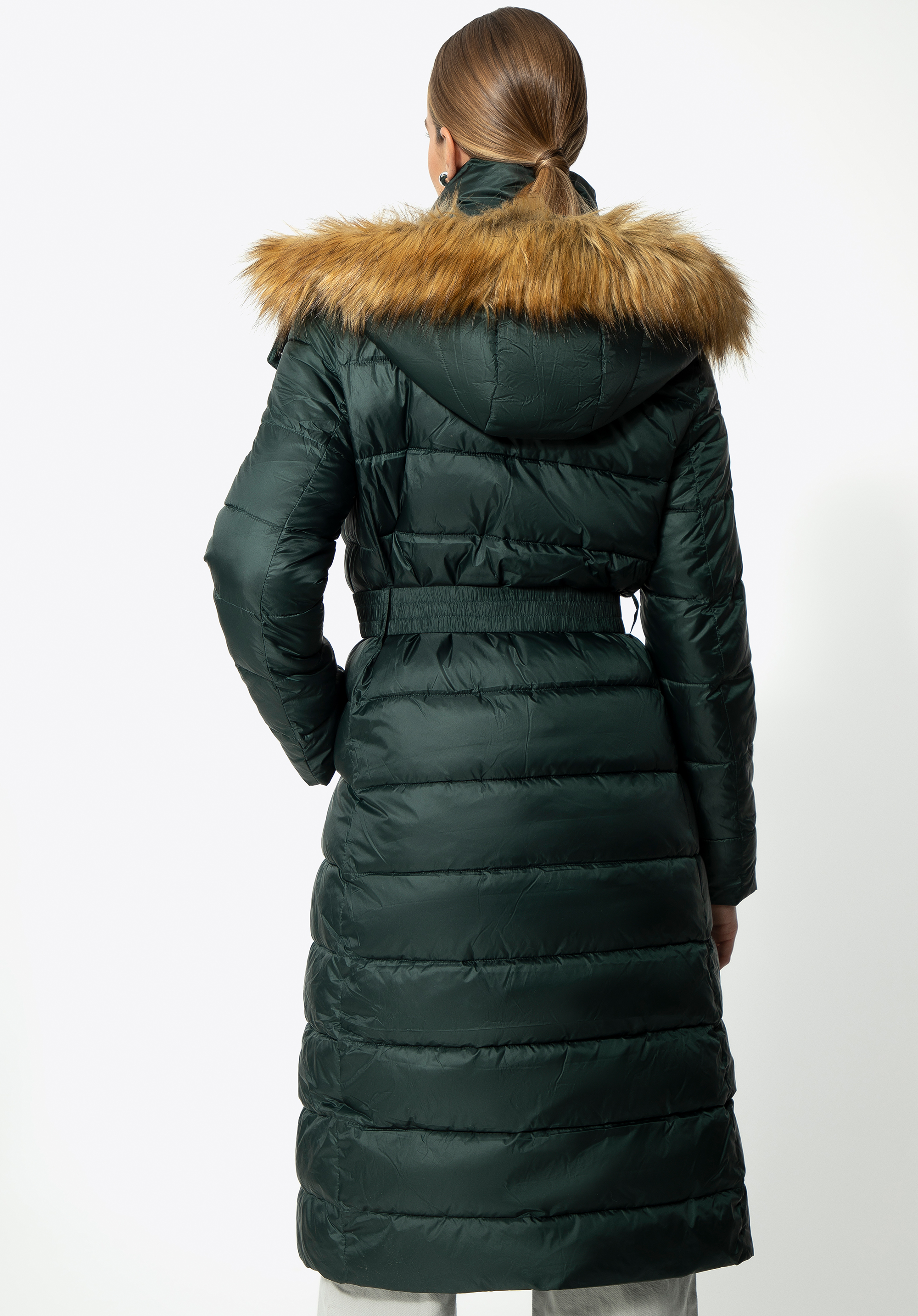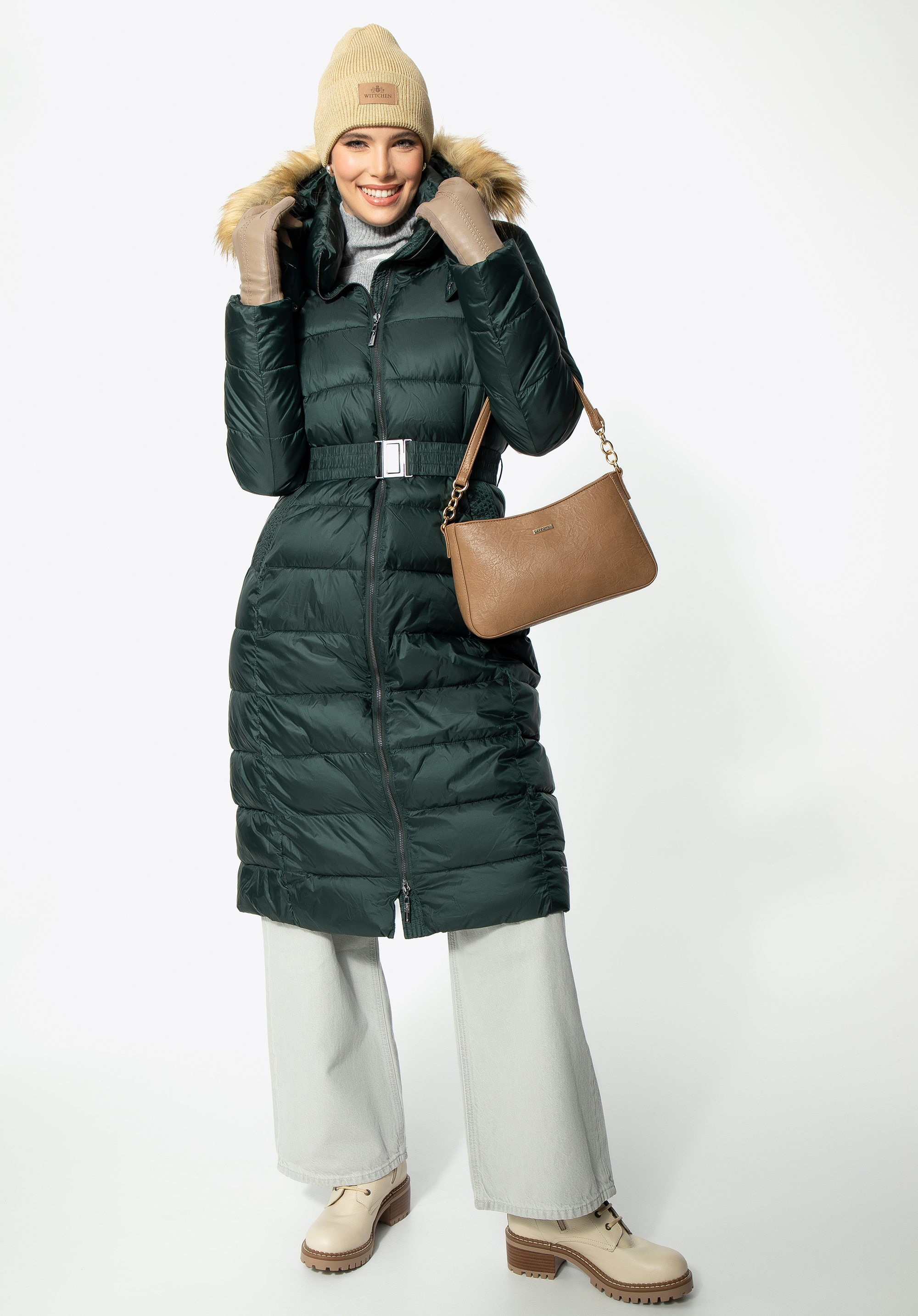 Ez a stílusos őszi-téli kabát még a legkedvezőtlenebb időben is melegen tart. Enyhén fényes poliészterből készült, vízszintes steppeléssel. A derekát egy csattal rögzíthető öv hangsúlyozza, amely levehető. A magas gallér és a levehető műszőrmével díszített kapucni tökéletes kiegészítők azoknak a nőknek, akik nem szeretnek sapkát viselni. Ennek a kabátnak az oldalán elegáns varrással ellátott zsebek találhatók. Ez a női téli steppelt kapucnis kabát időtálló modell minden elegáns nő számára.