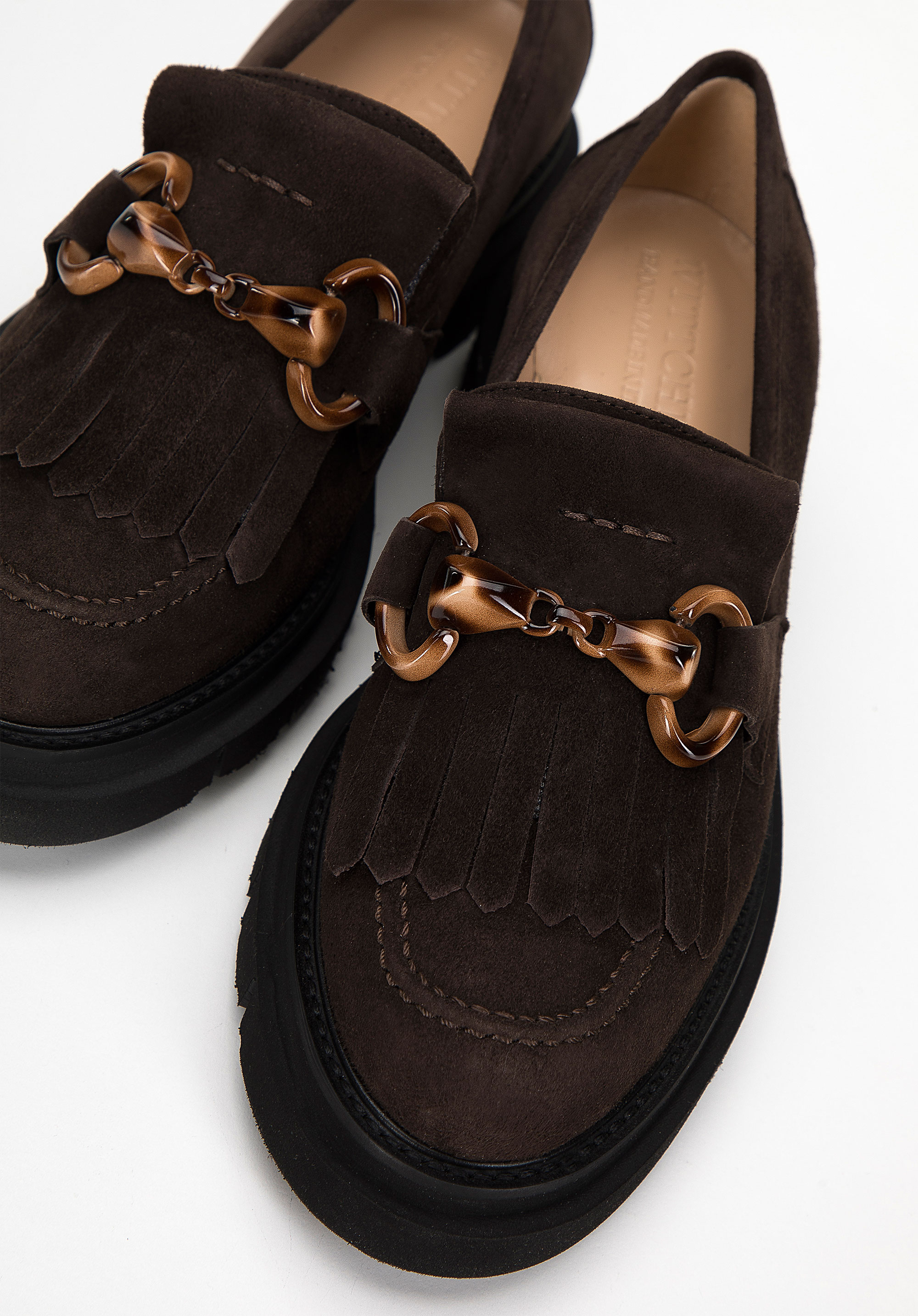 Női szarvasbőr mokaszin rojtokkal és csattal barna
