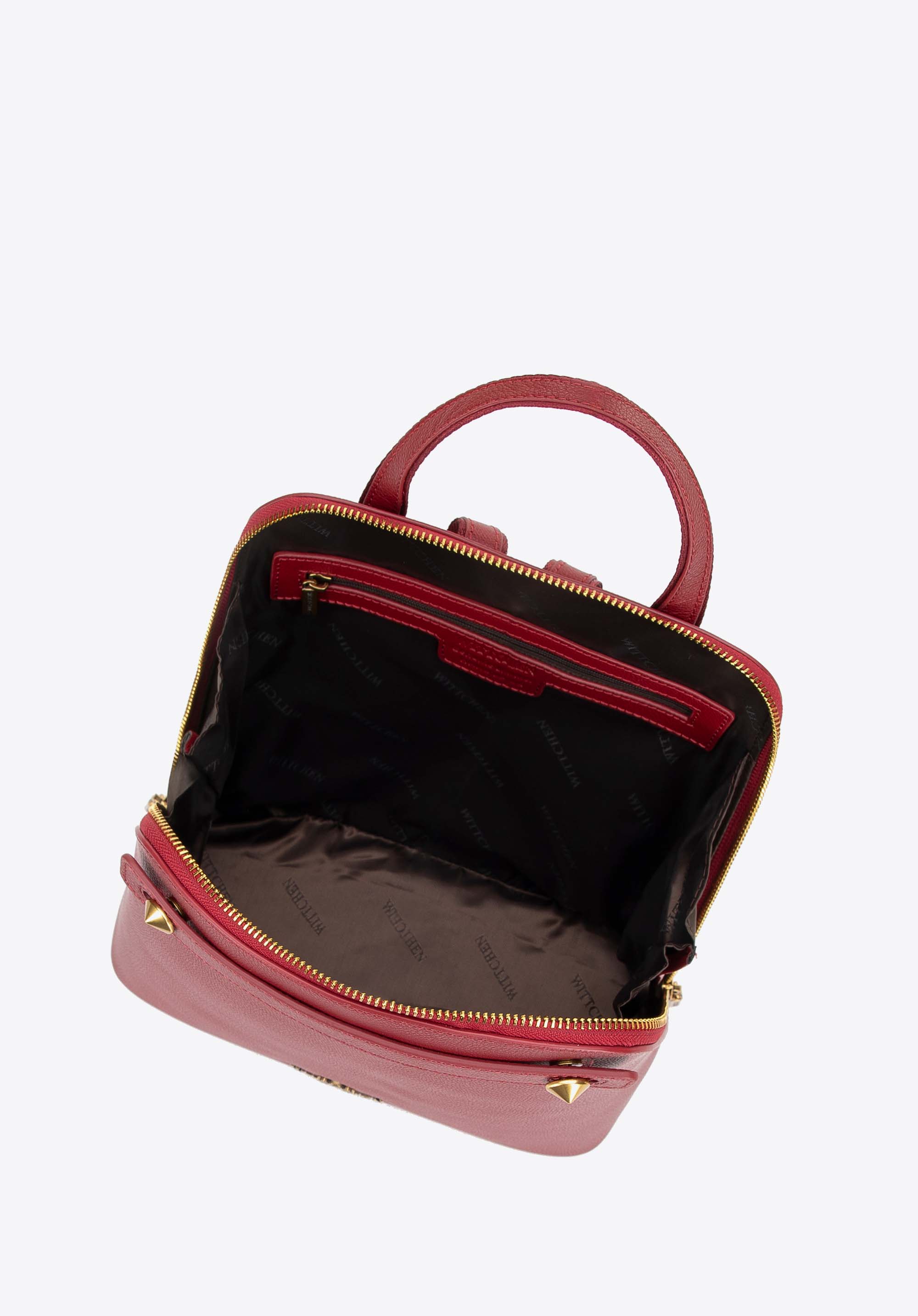 Ez az egyedi trapéz alakú hátizsák ideális azoknak a nőknek, akik a stílus és a funkcionalitás kombinációját keresik. Kiváló minőségű természetes bőrből készült, tartósságot és időtlen, elegáns megjelenést biztosít, amely sok szezonon át fog tartani. A széles nyílásnak köszönhetően a hátizsák mindennapi használata rendkívül kényelmes, míg az elején található díszítő szegecsek és a pánt felfrissítik a klasszikus stílust.