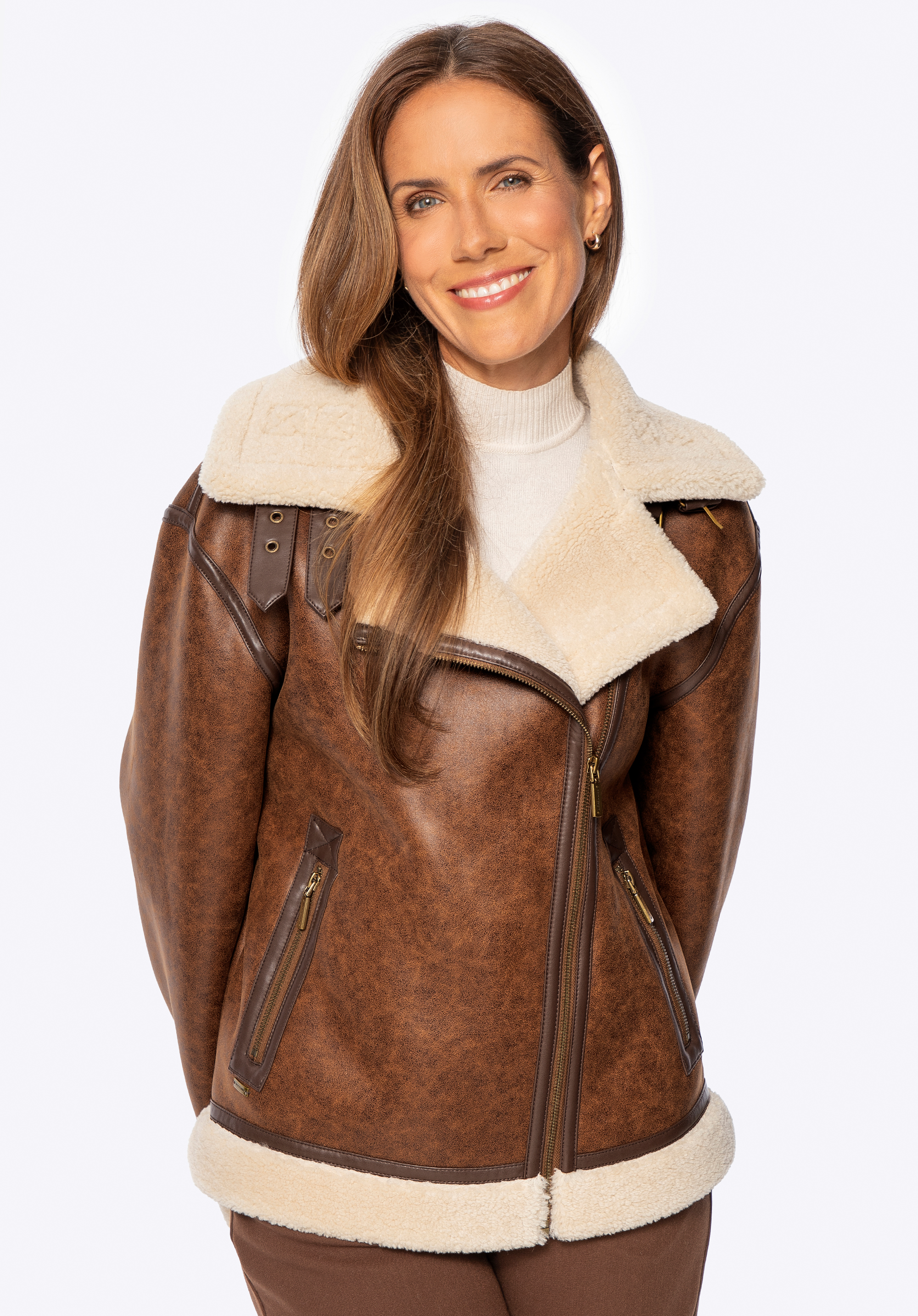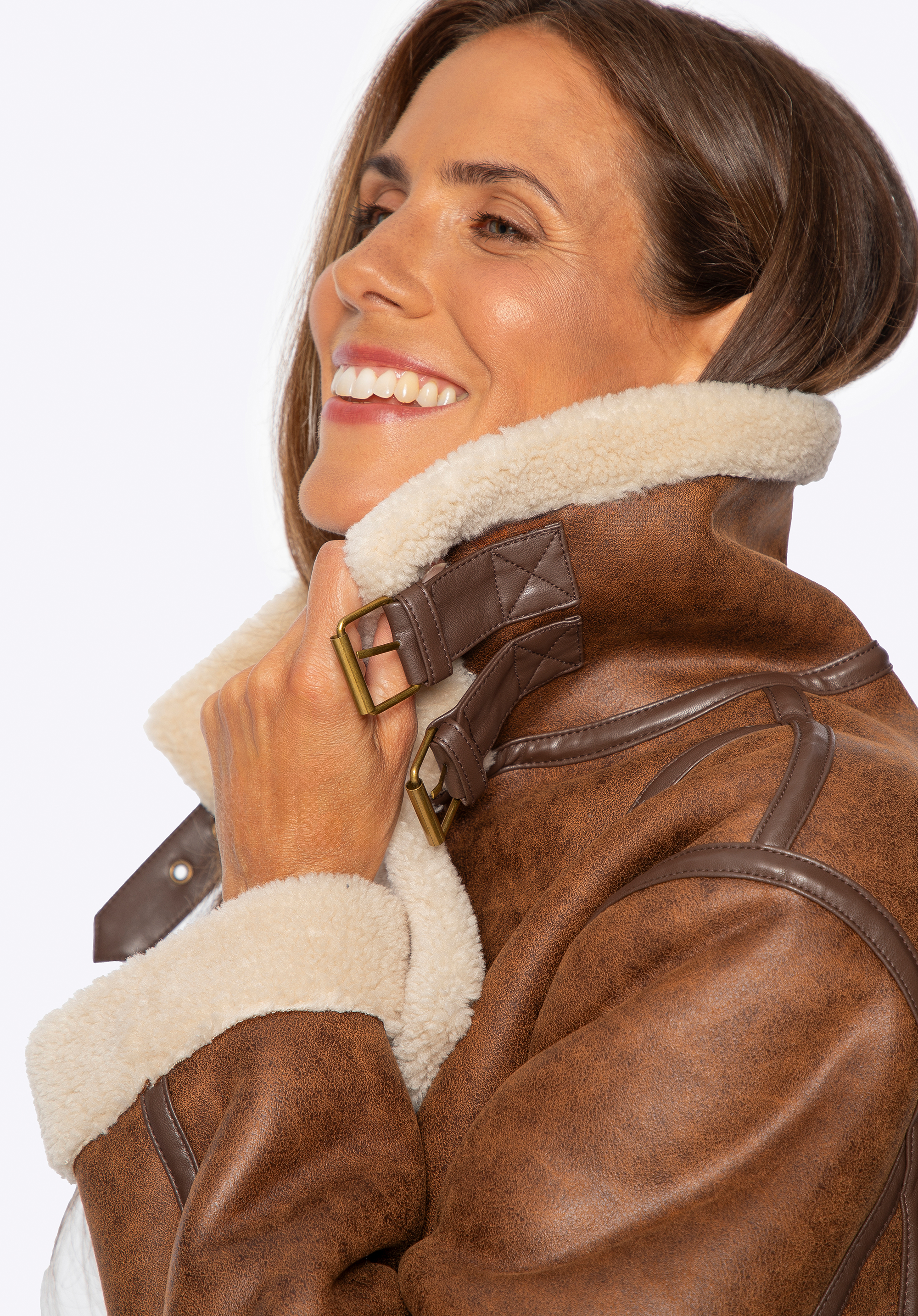 - Állítható nyakpántok: A stílusos műbőr pántok lehetővé teszik a gallér rögzítését az extra meleg és a jellegzetes megjelenés érdekében.
