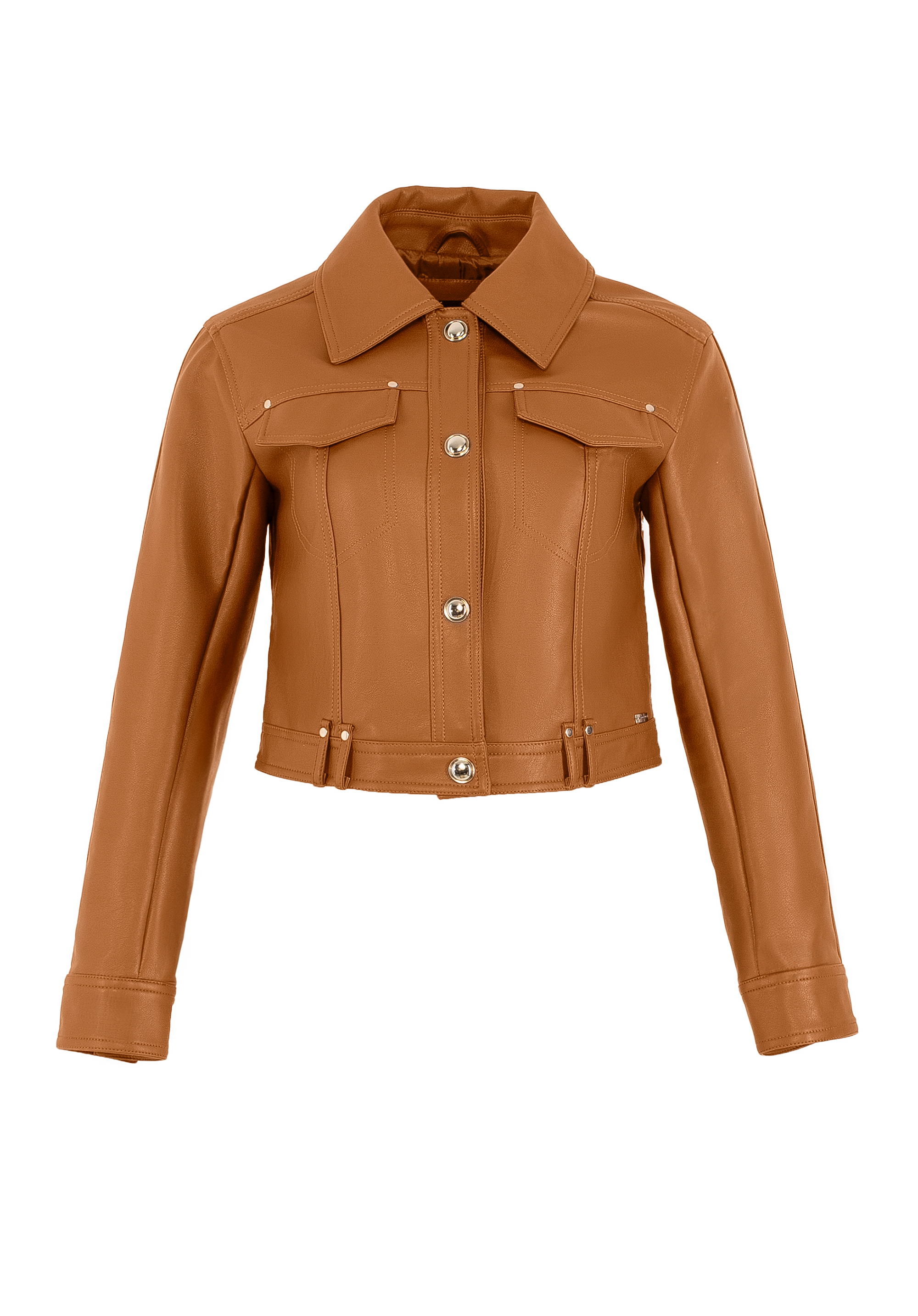 Ez az ökobőr dzseki egy igazi stílusikon, amely azonnal megragadja a tekintetet! A rövidebb, karcsúsított szabás a nagy, feltűnő gombokkal kombinálva a klasszikus és a modern stílus tökéletes kombinációját alkotja. A mandzsettáknál lévő patentok és a mellkas magasságában lévő díszítőelemek egyedi jelleget kölcsönöznek, míg a fém gyártó logója finoman hangsúlyozza a kabát eleganciáját.