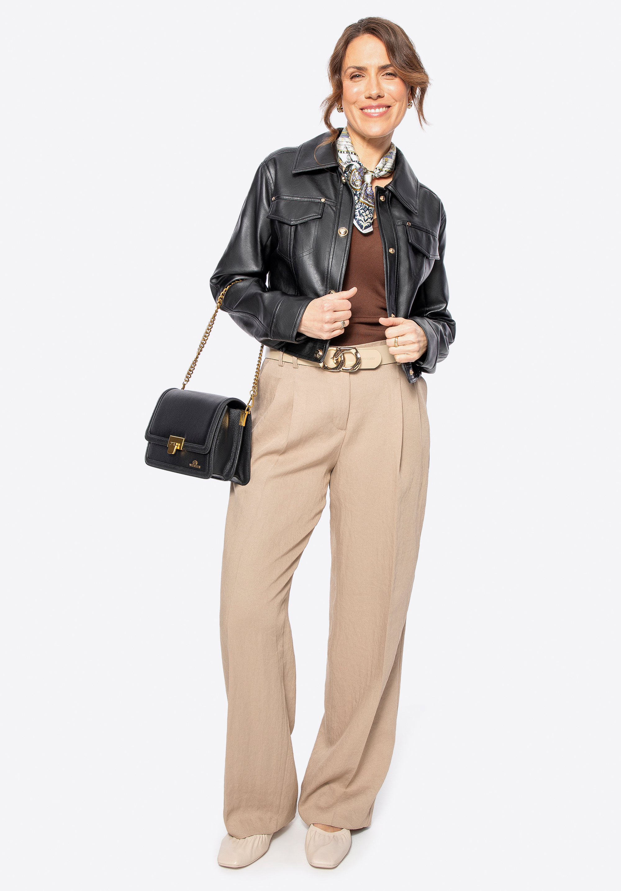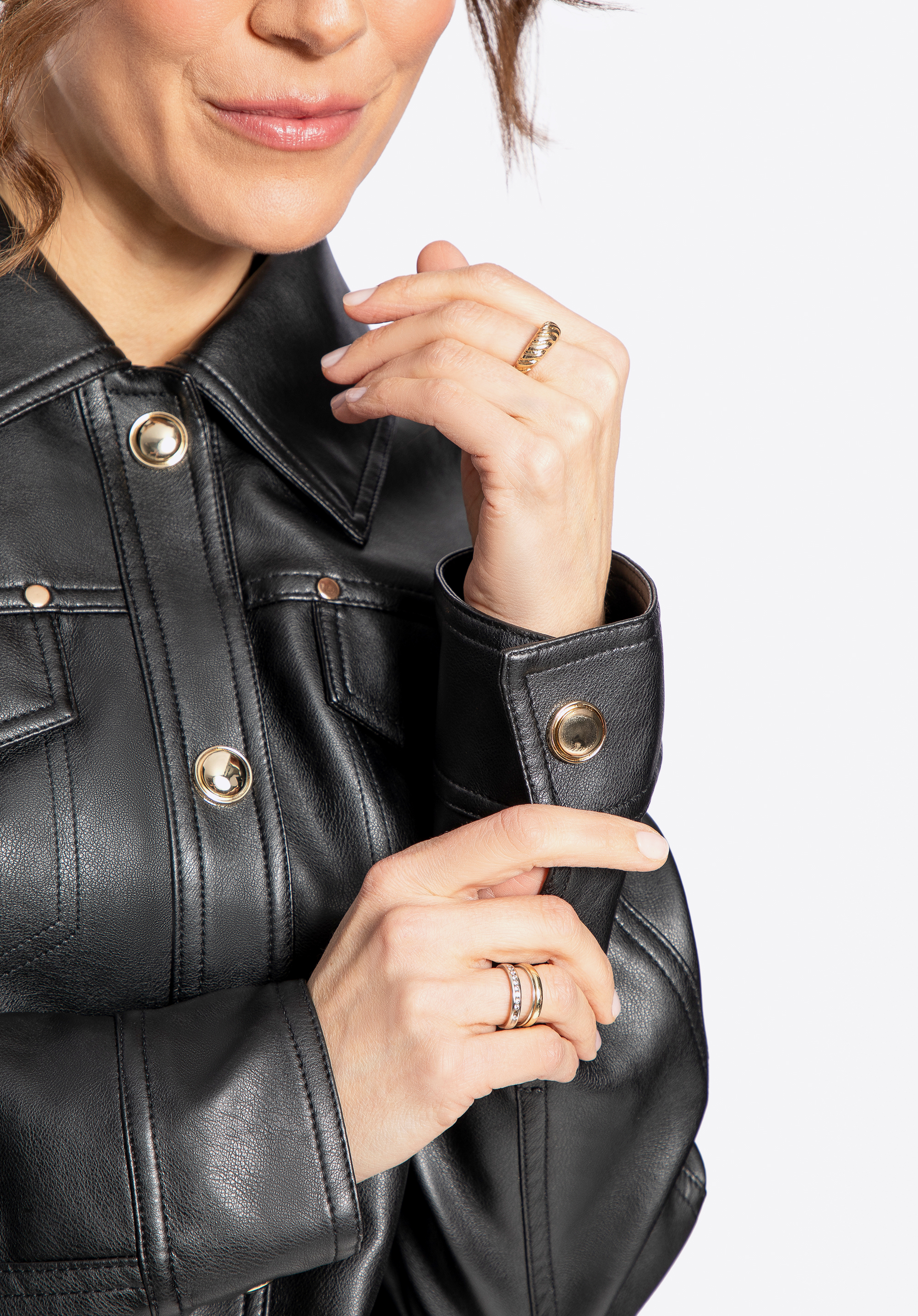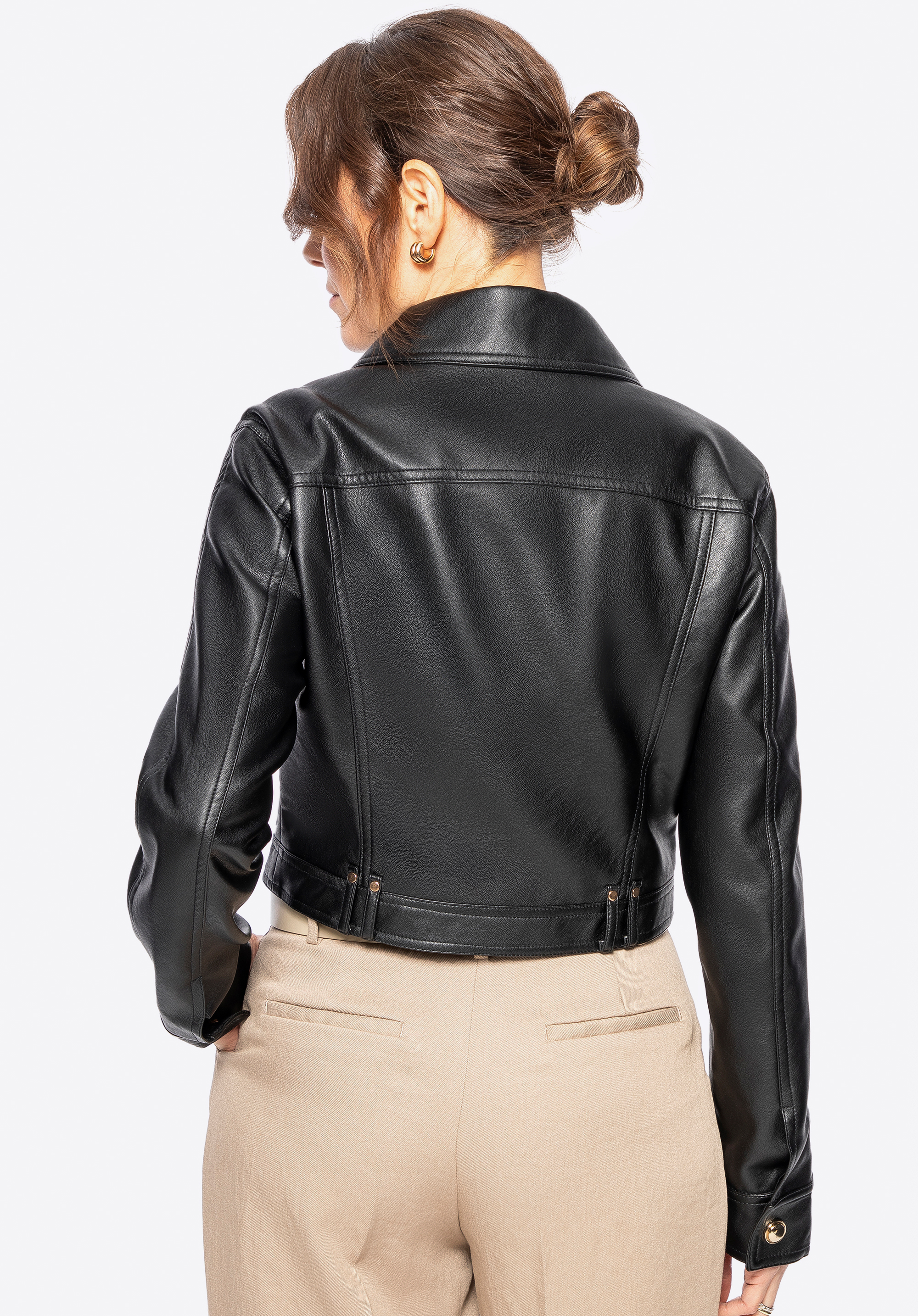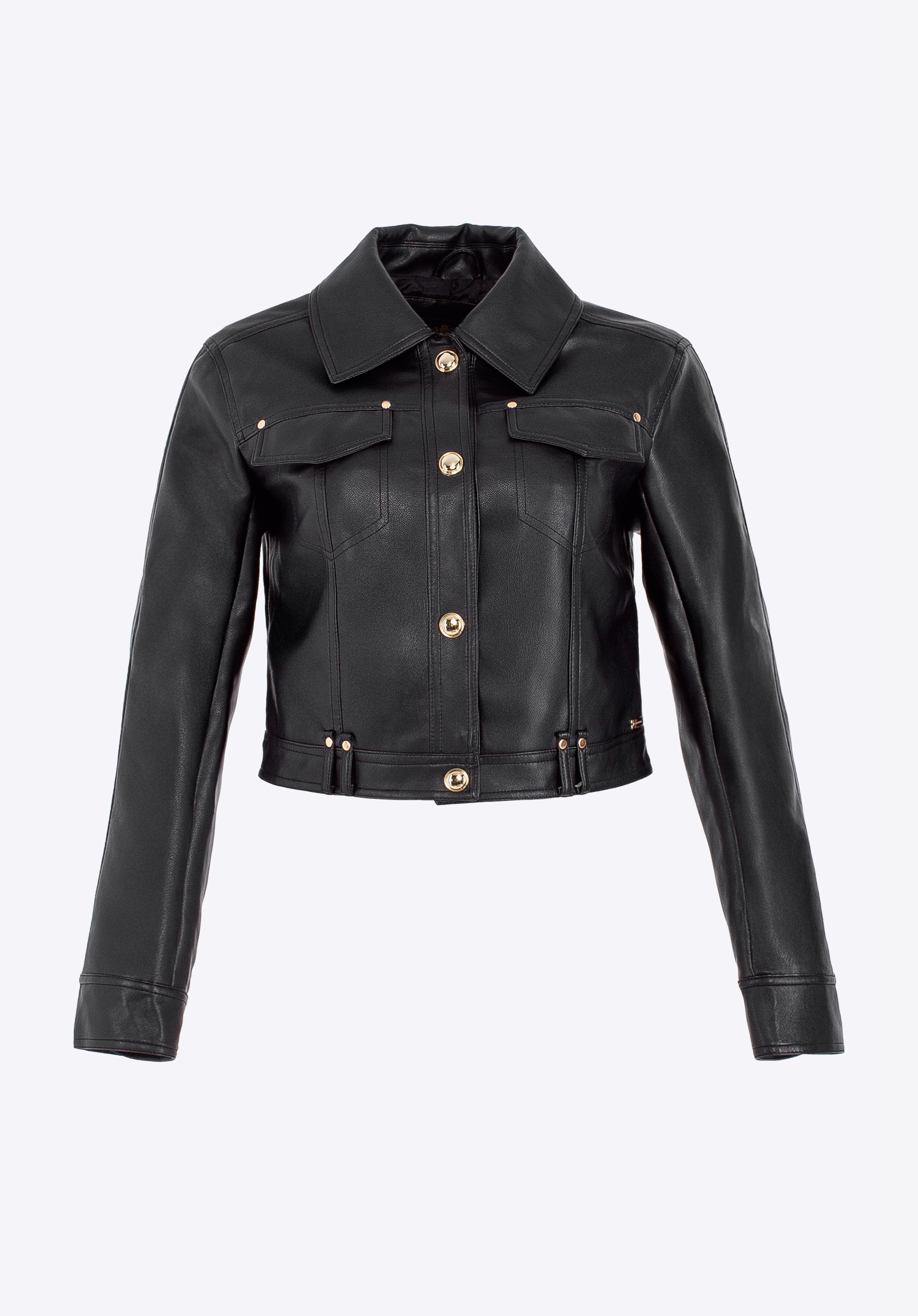 Ez az ökobőr dzseki egy igazi stílusikon, amely azonnal megragadja a tekintetet! A rövidebb, karcsúsított szabás a nagy, feltűnő gombokkal kombinálva a klasszikus és a modern stílus tökéletes kombinációját alkotja. A mandzsettáknál lévő patentok és a mellkas magasságában lévő díszítőelemek egyedi jelleget kölcsönöznek, míg a fém gyártó logója finoman hangsúlyozza a kabát eleganciáját.