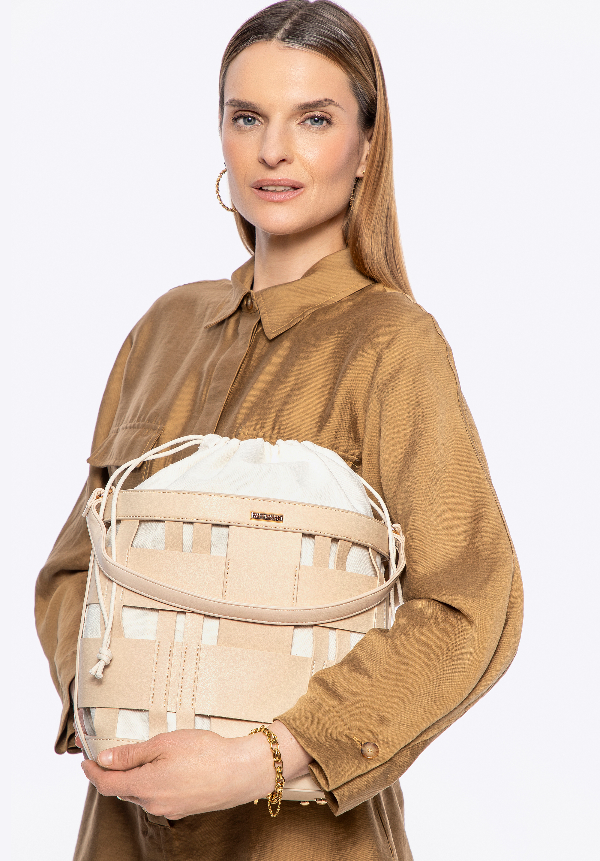Lépj be a könnyed elegancia és laza stílus világába bucket bag táskánkkal, amely tökéletesen ötvözi a bohó szellemiséget a mindennapi praktikummal. Ez az ökobőrből készült táska szövött textúrájával tűnik ki, amely jellegzetes, művészi hatást ad a terméknek. A könnyű pamut bélés gyönyörű kontrasztot alkot a külsővel, bájos akcentust hozva létre, amely minden pillanatot különlegessé varázsol ezzel a táskával. Élvezd a kényelmet, a stílust és a funkcionalitást – mindezt egyben!