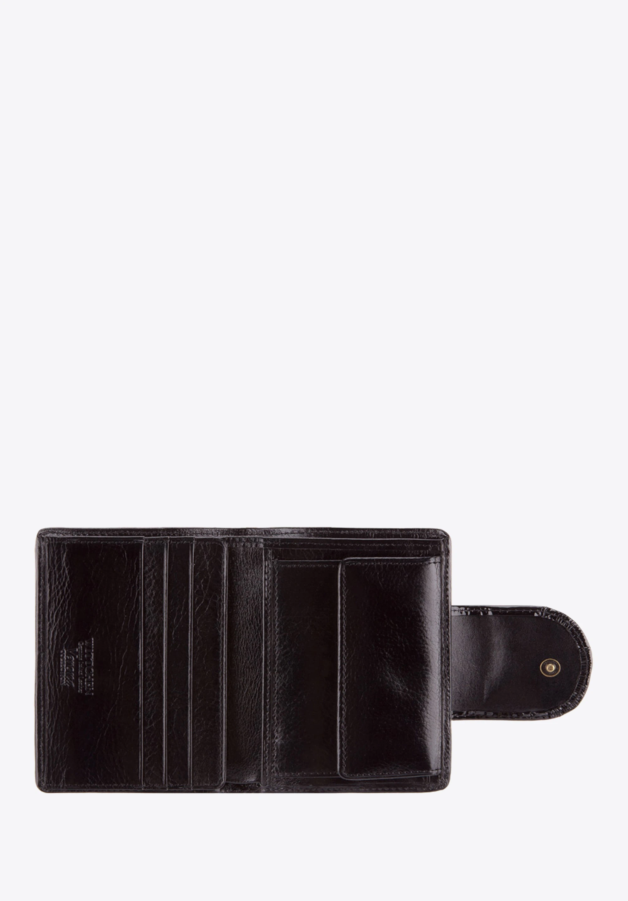 Közepes méretű női irattárca, szépen fénylő lakkbőrből nagy gondossággal kidolgozva. Tökéletes választás a különösen szép és kényelmes kiegészítőket kedvelő nők számára.