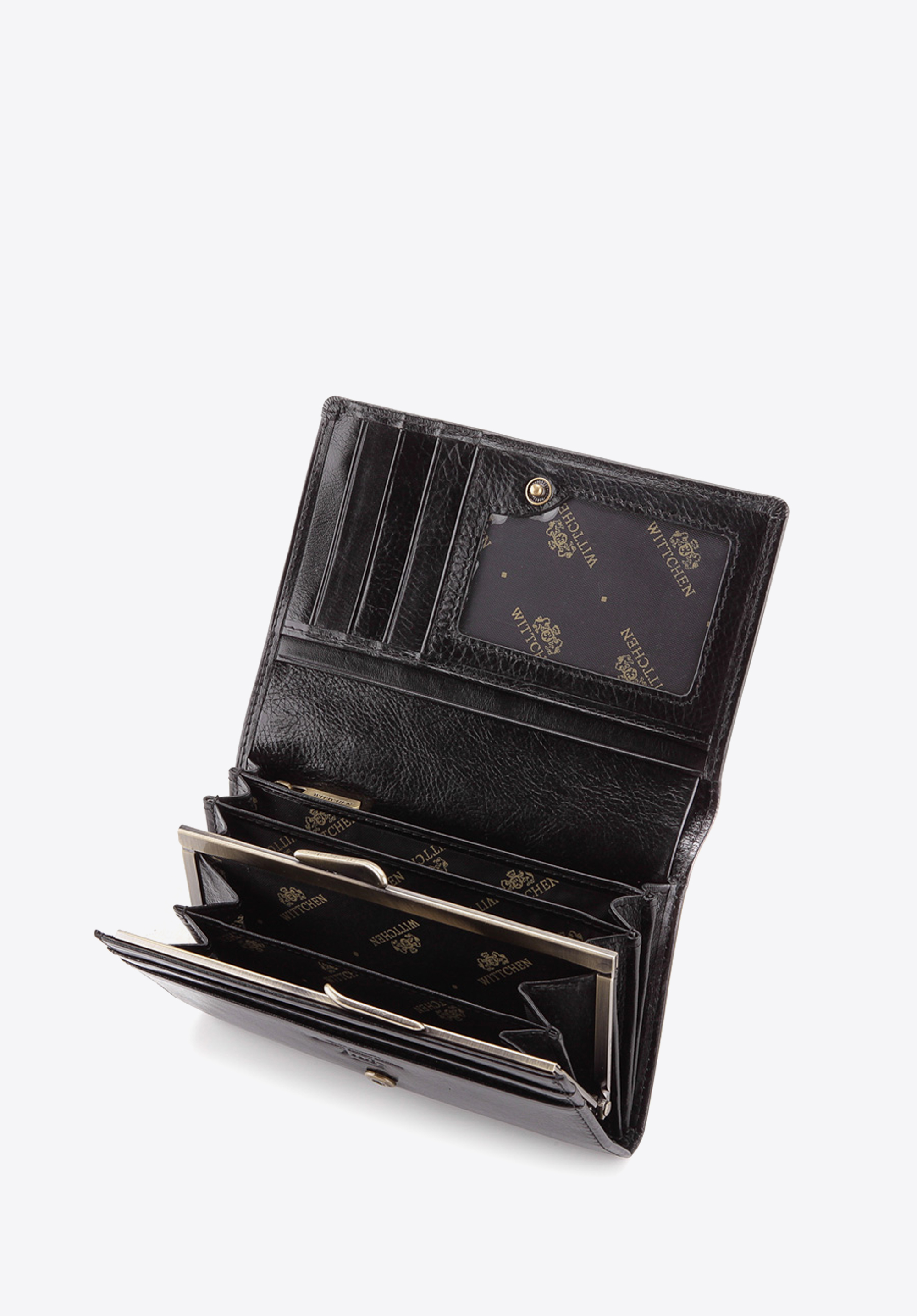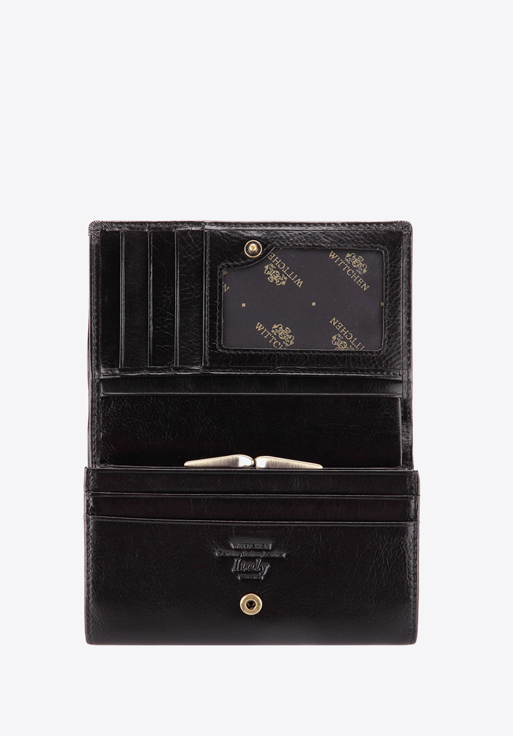 Elegáns és tágas női pénztárca nagy szakértelemmel kidolgozva puha borjúbőrből. Ez a modell megfelel a klasszikus stílust és funkcionális megoldásokat kedvelő hölgyek ízlésének.