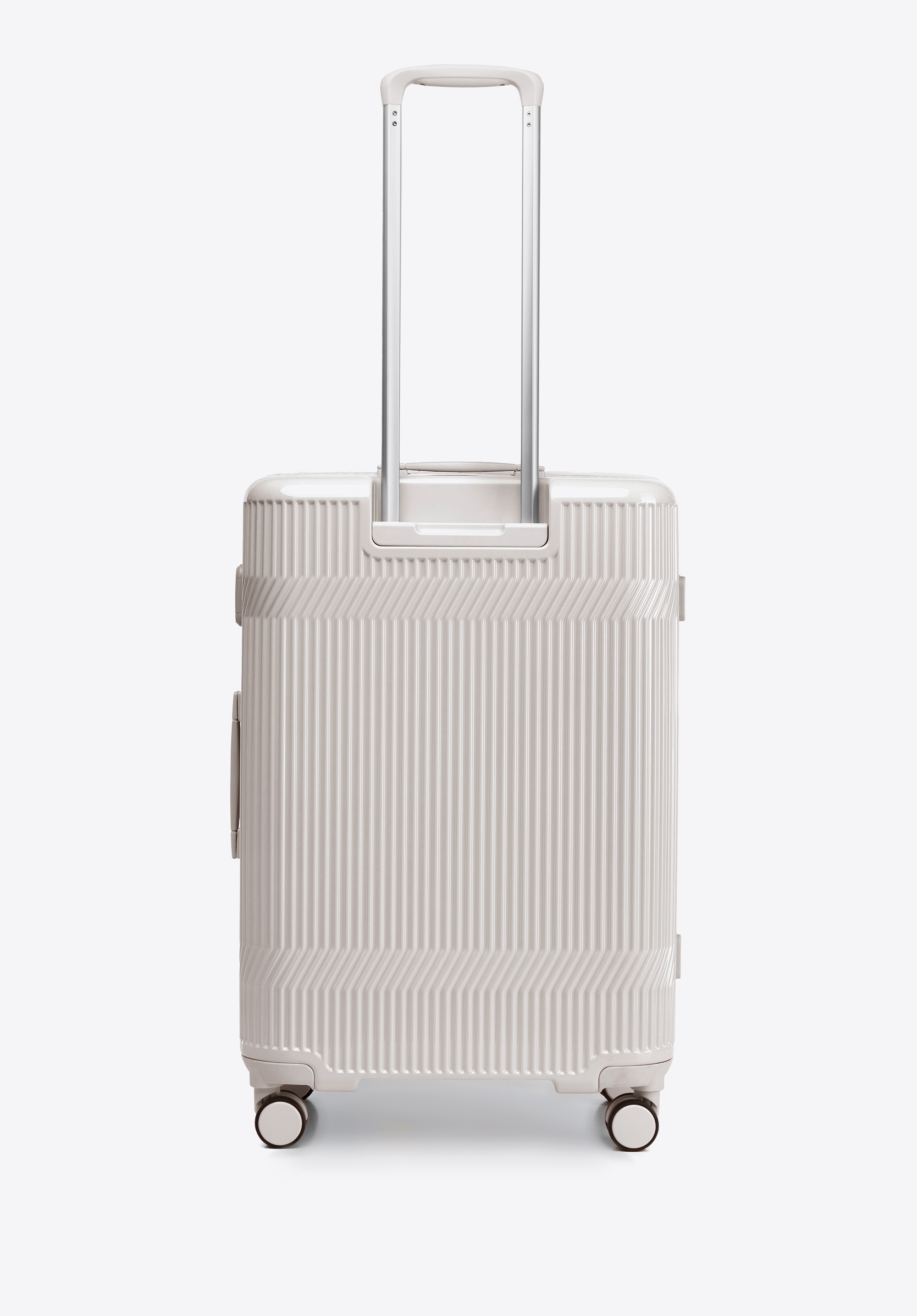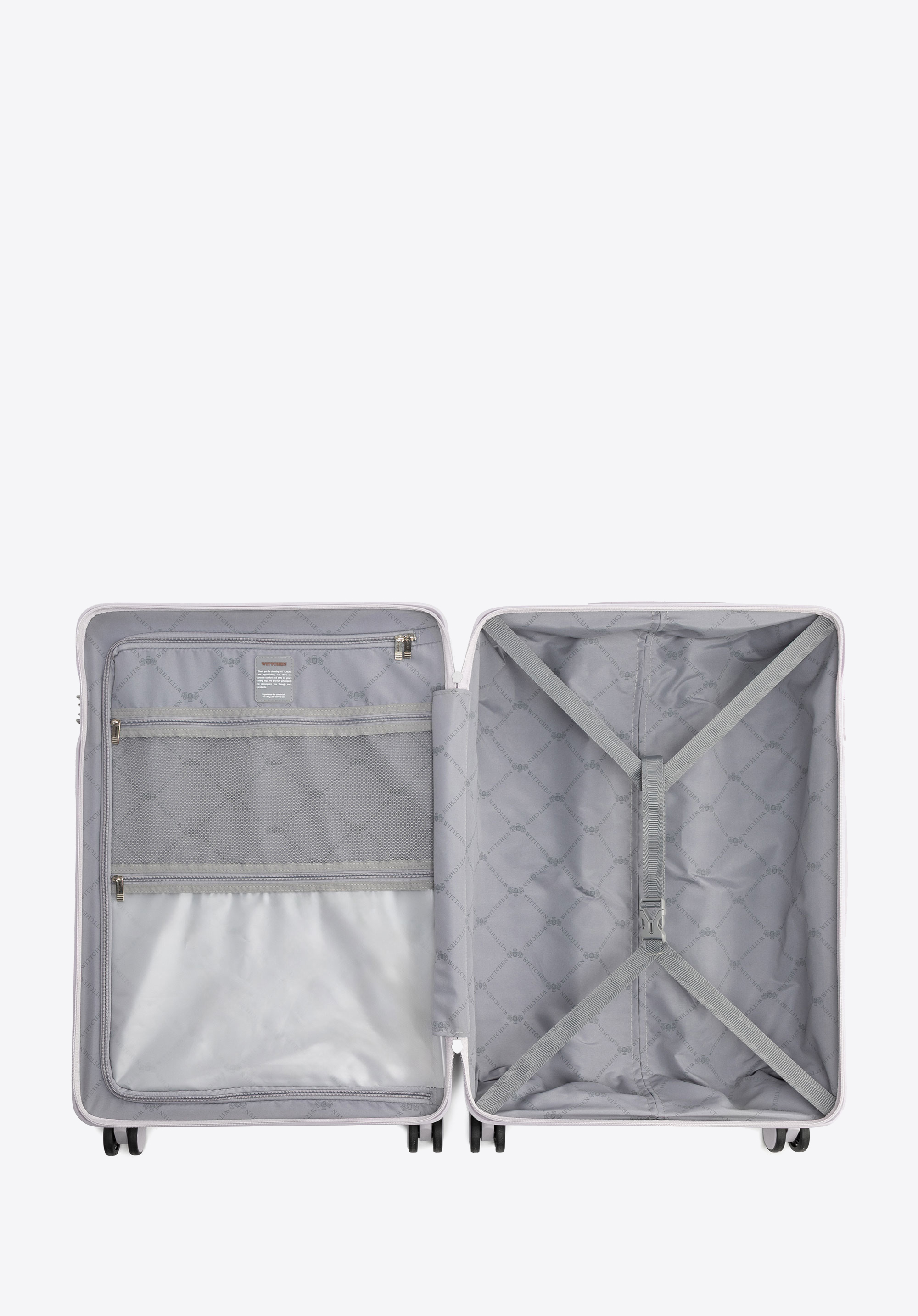 - Design: A modern függőleges bordák és a fényes felület elegáns, jellegzetes megjelenést kölcsönöznek a bőröndöknek, és könnyen felismerhetők.
