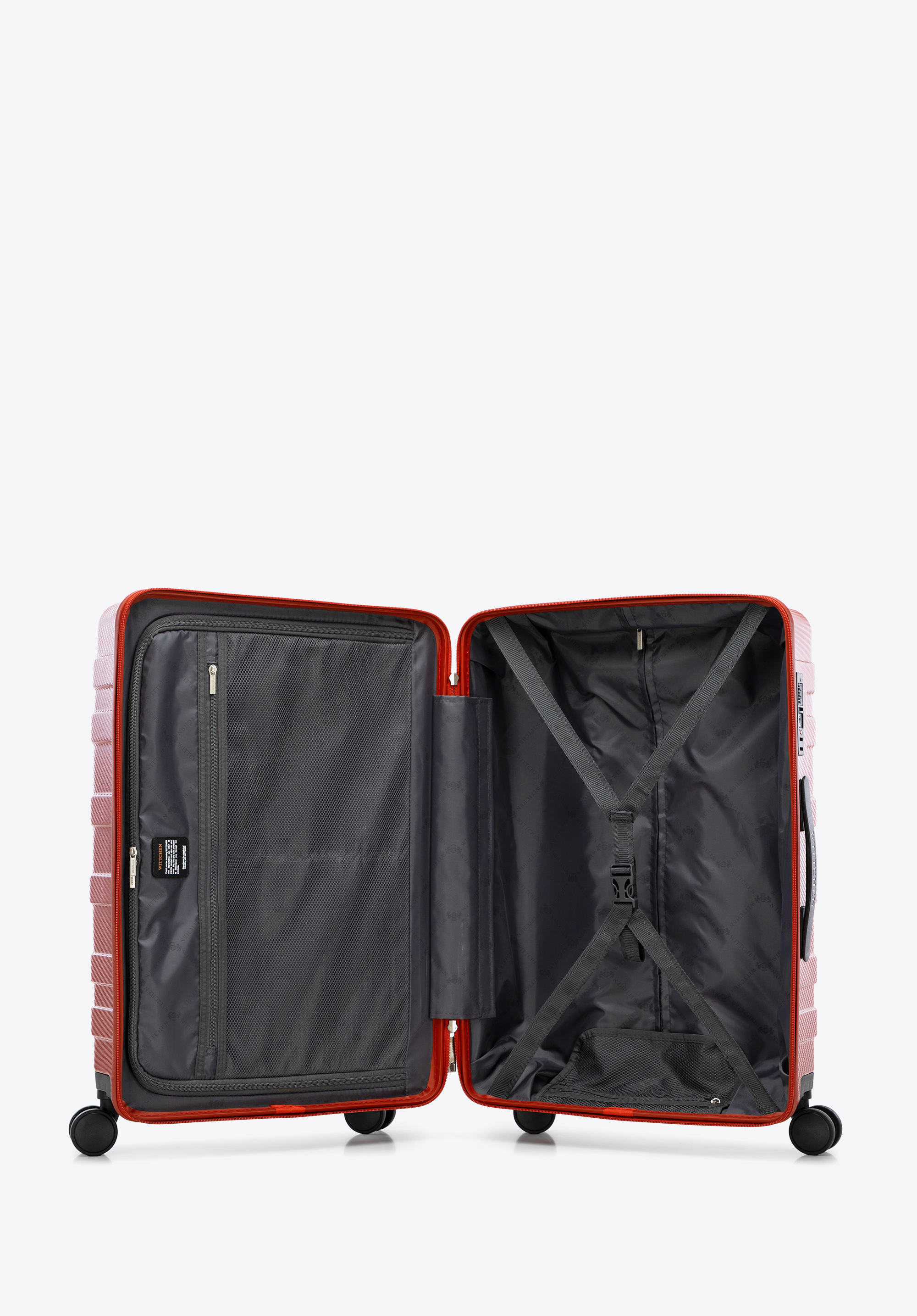 - Jól szervezett belső tér: Minden bőrönd állítható rögzítőpántokkal, cipzáras hálós zsebekkel és két extra rekesszel rendelkezik a holmijaid rendben tartásához.