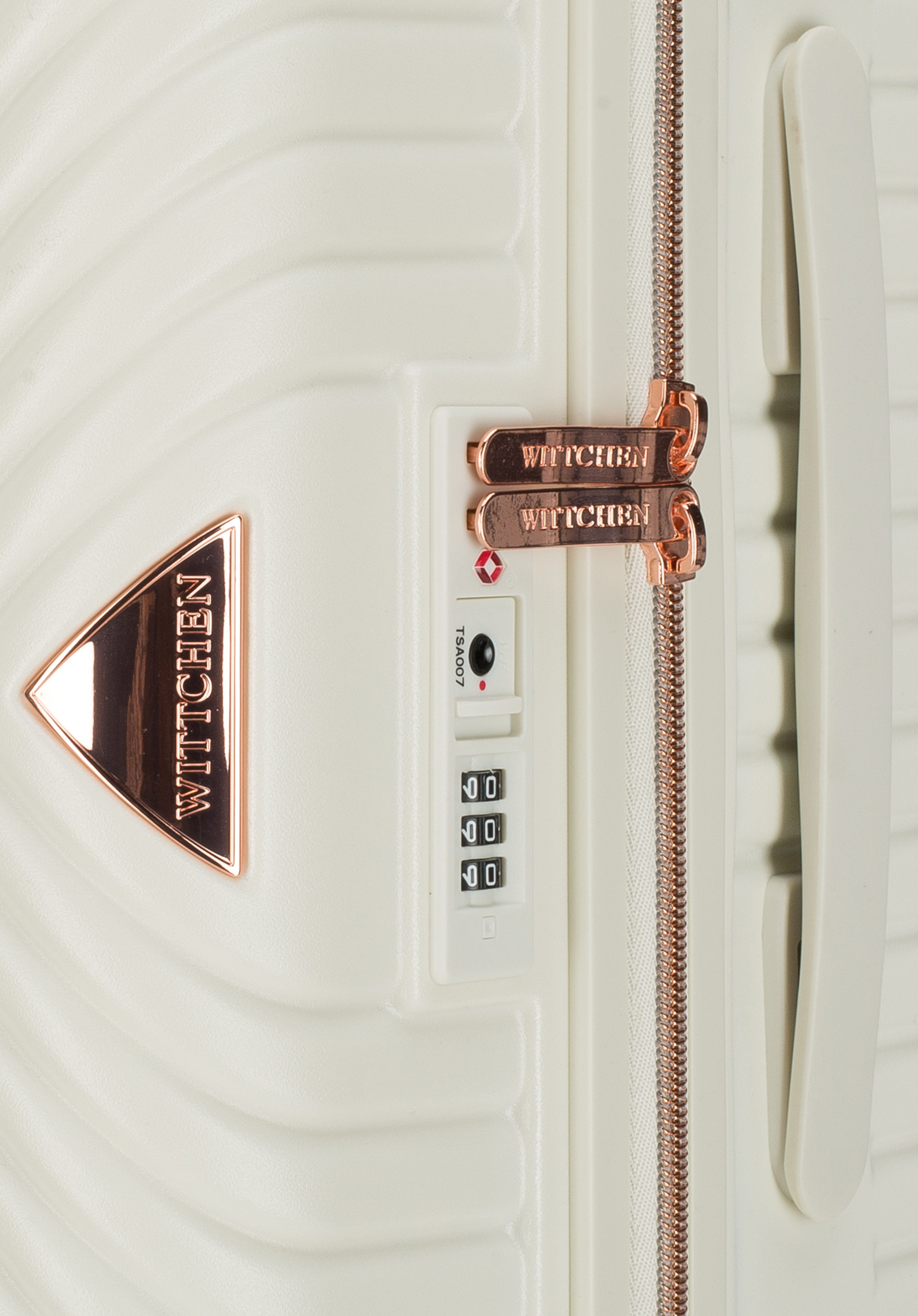 Polikarbonát bőröndök matt felülettel.Ez a különleges modell fényes, rosegold részletekkel van ellátva. Kerekei ABS műanyagból készülnek, rugalmas bevonattal. A poggyászok belsejében WITTCHEN logós bézs színű bélés található. Többféle színben is elérhető: fehér, fekete, oliva zöld és rózsaszín árnyalatban kapható.