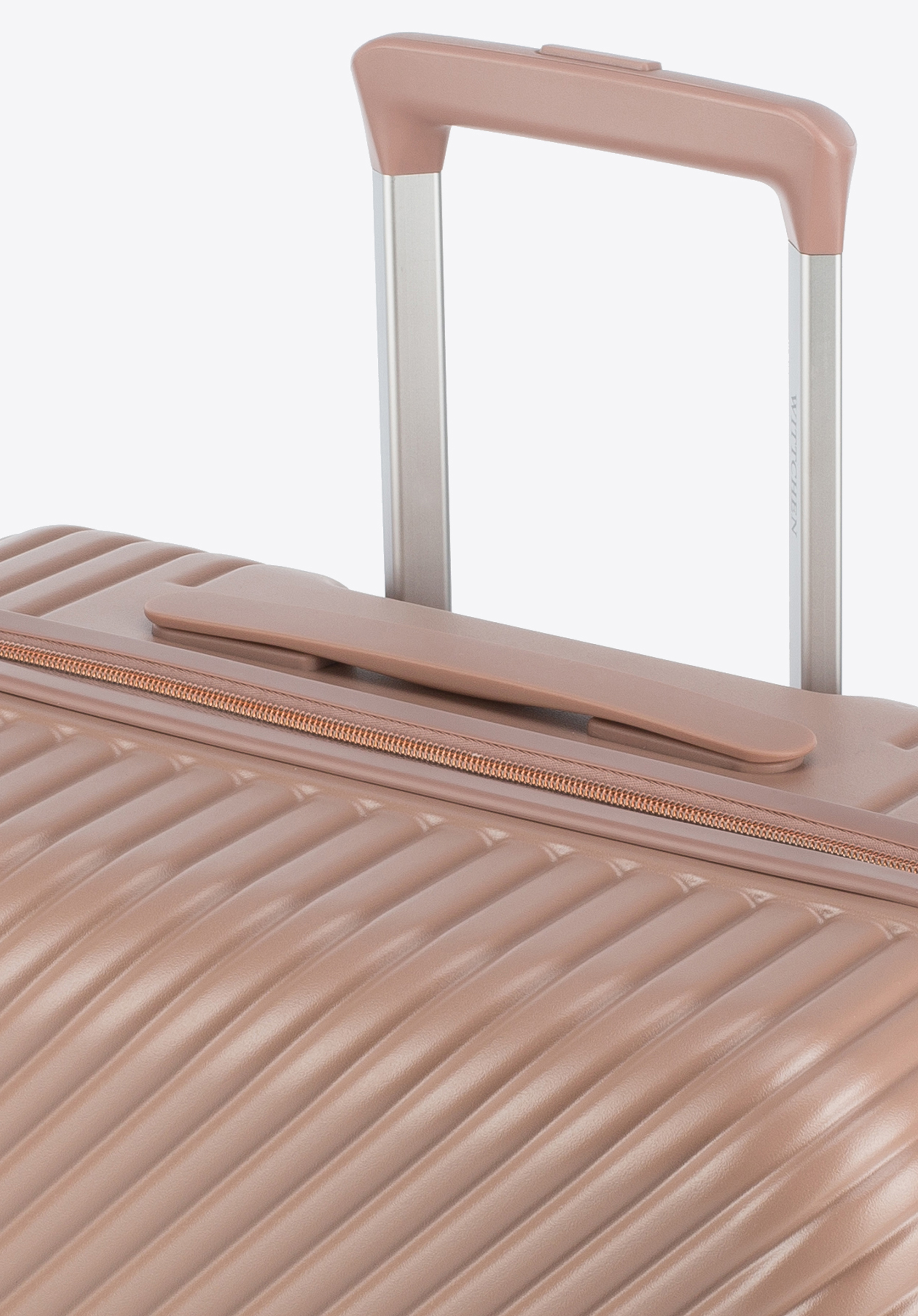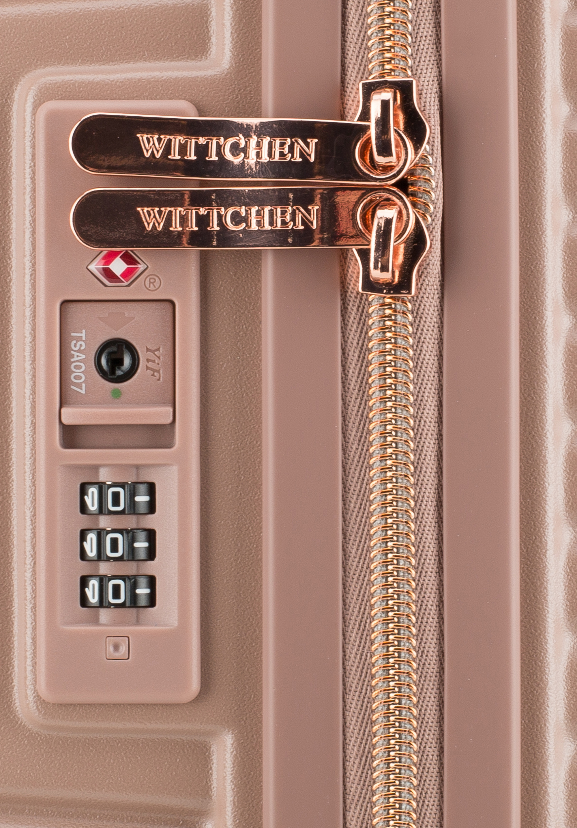 Polikarbonát bőröndök matt felülettel.Ez a különleges modell fényes, rosegold részletekkel van ellátva. Kerekei ABS műanyagból készülnek, rugalmas bevonattal. A poggyászok belsejében WITTCHEN logós bézs színű bélés található. Többféle színben is elérhető: fehér, fekete, oliva zöld és rózsaszín árnyalatban kapható.