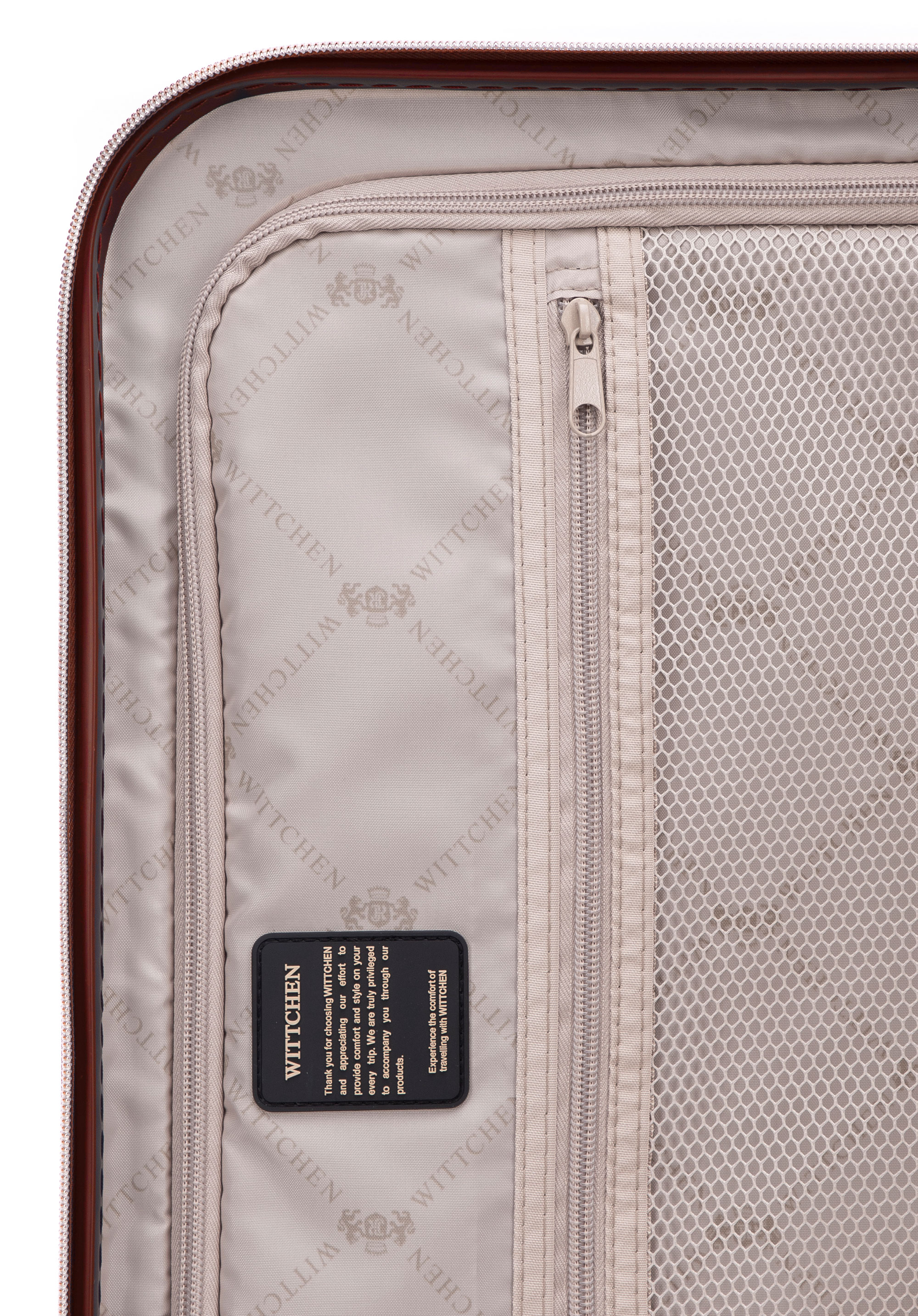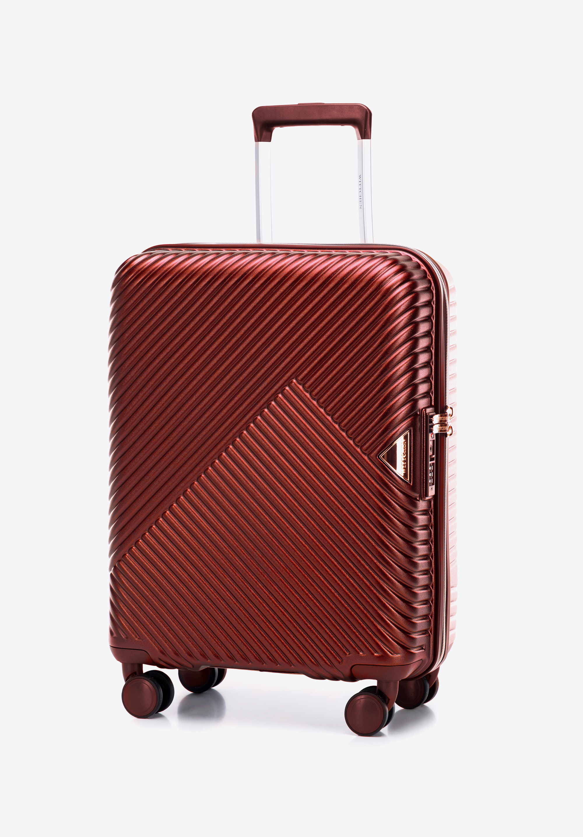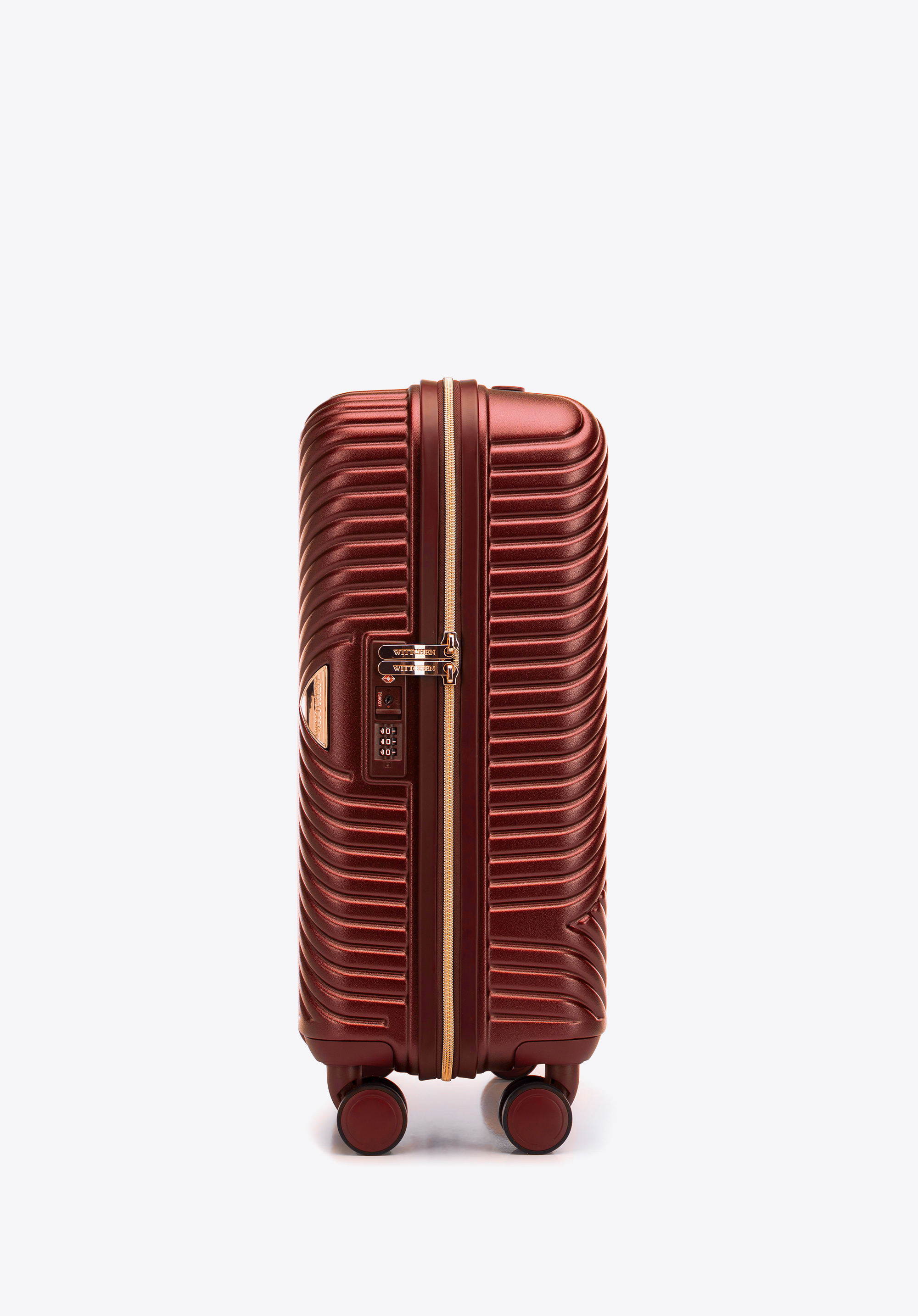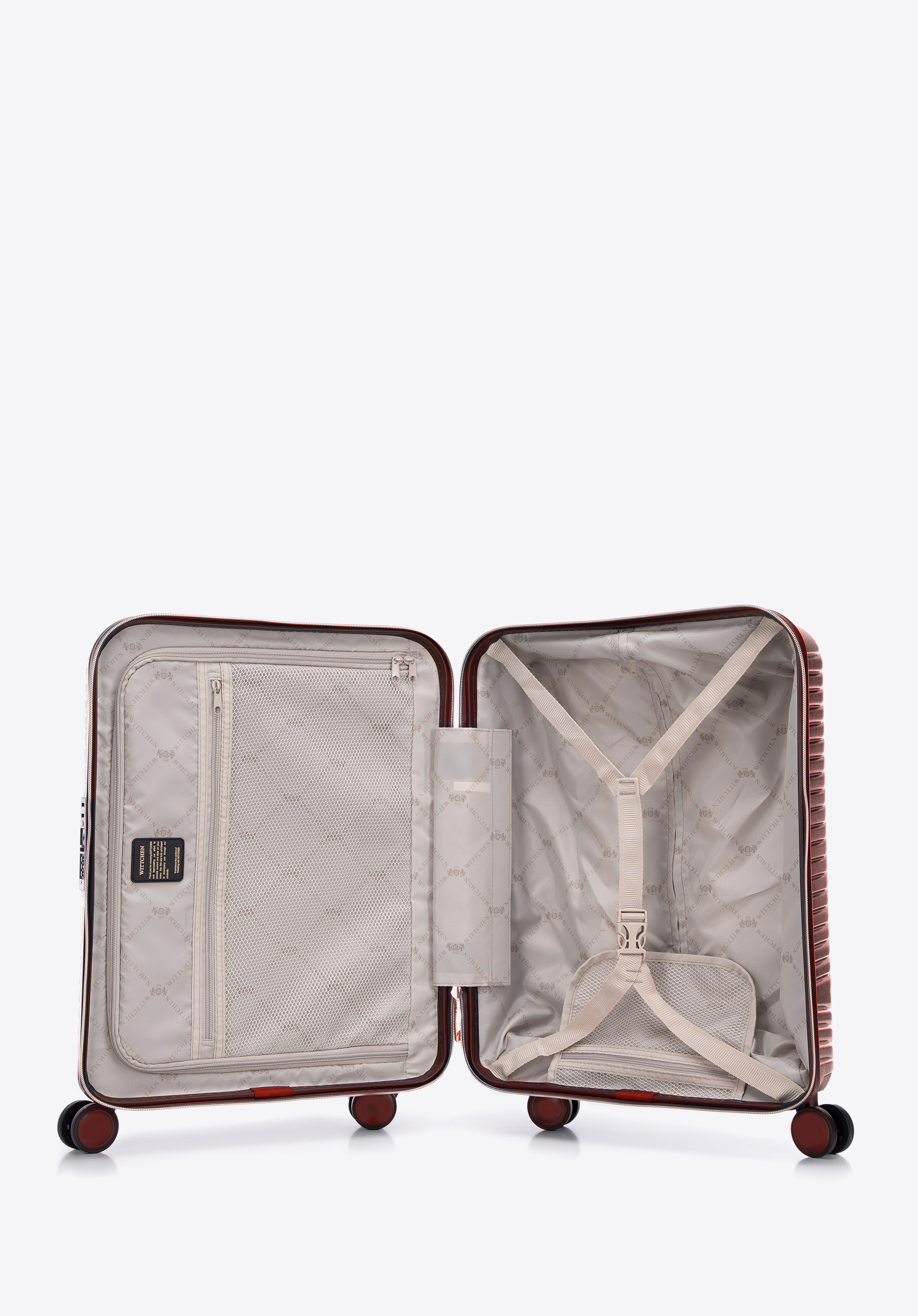Kis méretű kabin bőrőnd polikarbonátból matt felülettel. Designer modell, fényes, rózsaarany részletekkel. Kerekei ABS műanyagból készülnek, elasztikus bevonattal. A bőrönd belsejét bézs színű poliészter bélés borítja, WITTCHEN logóval.