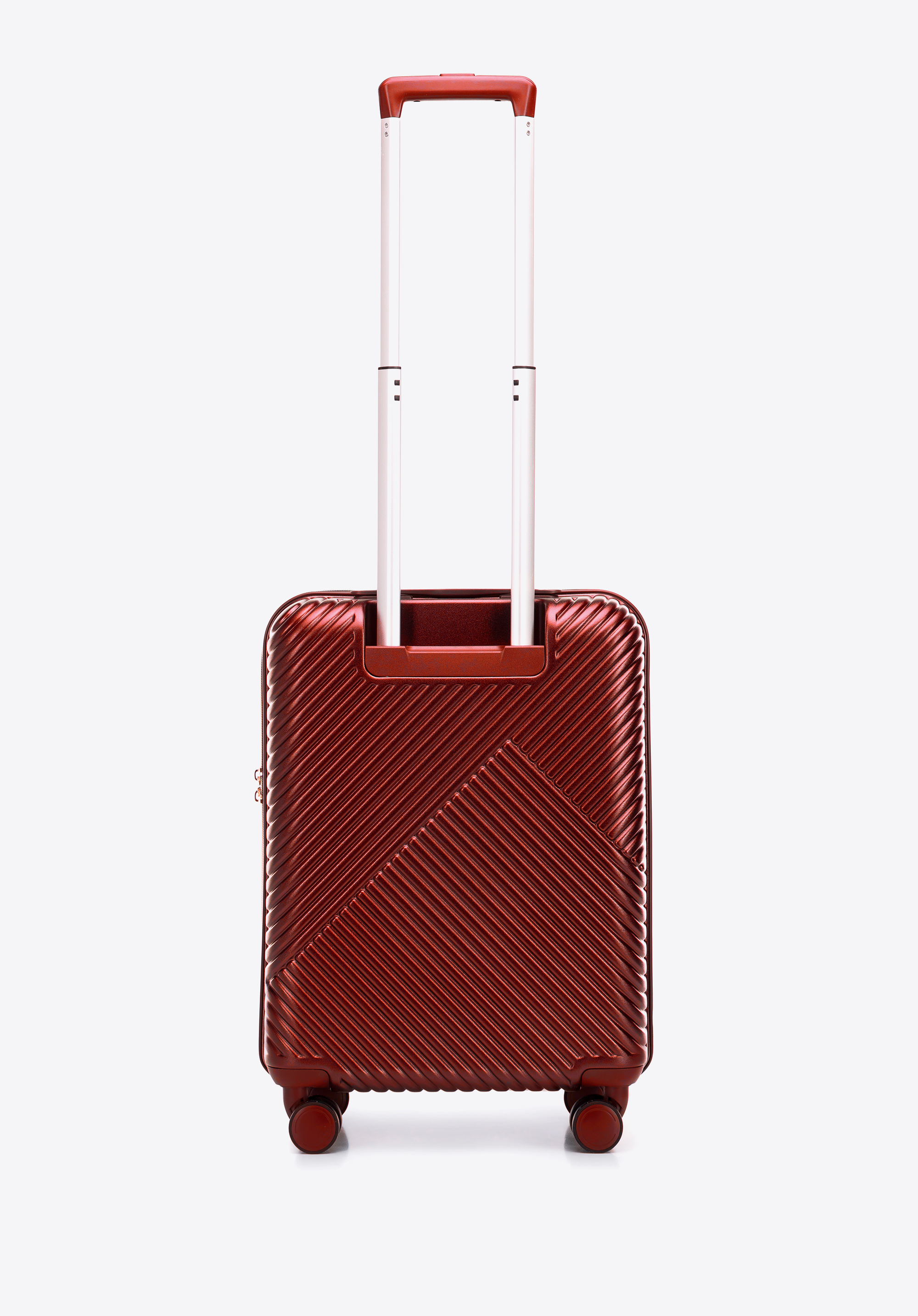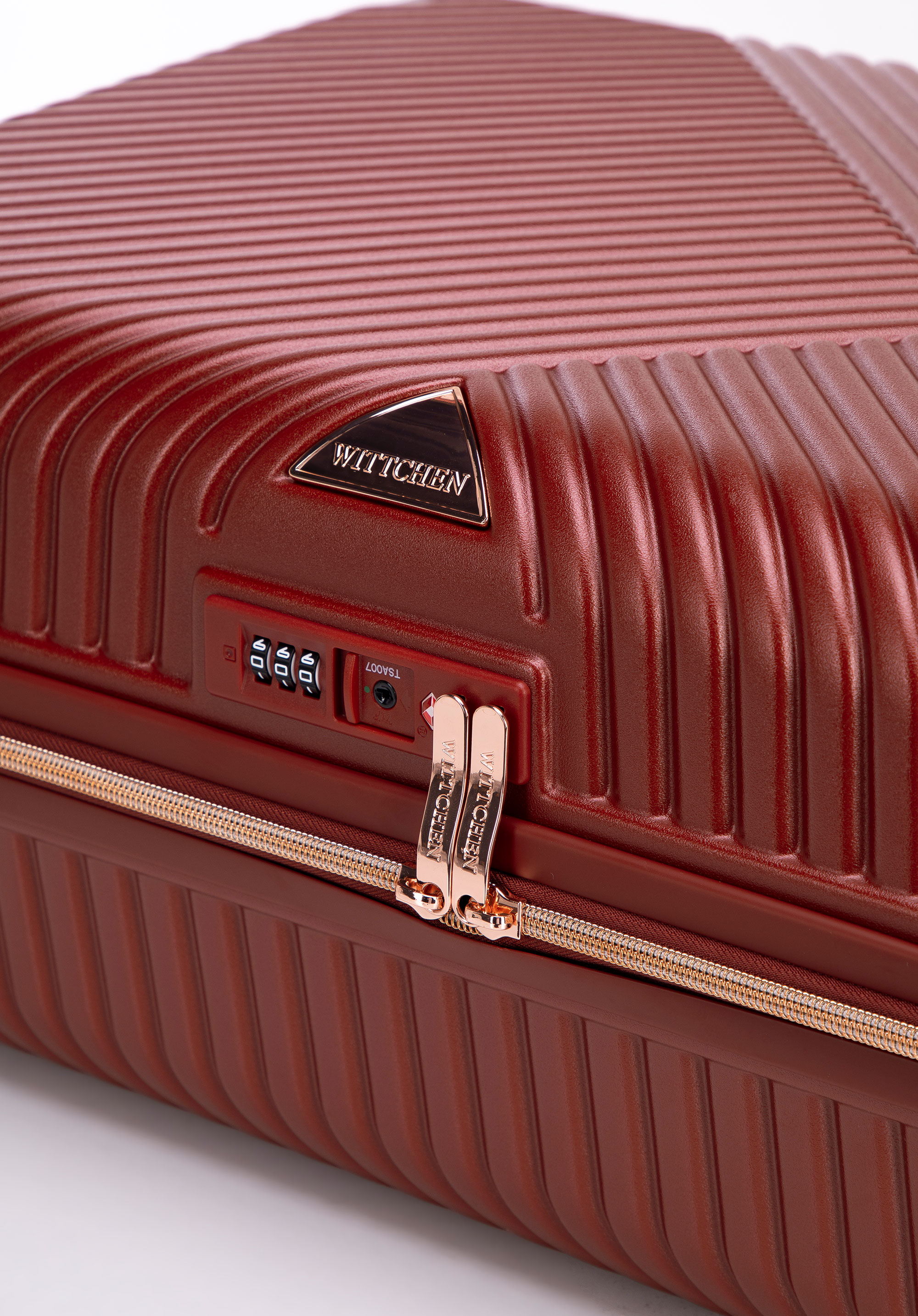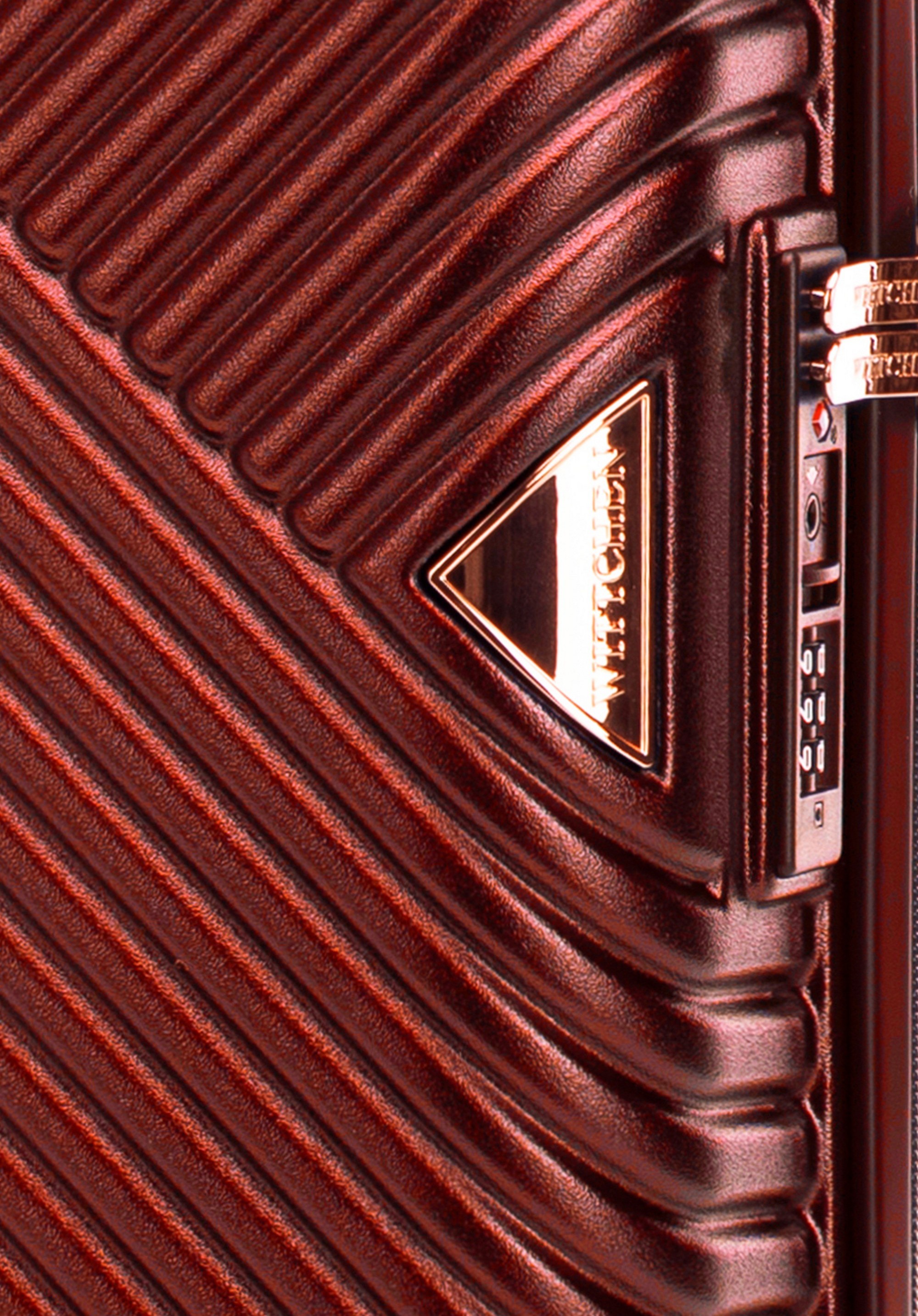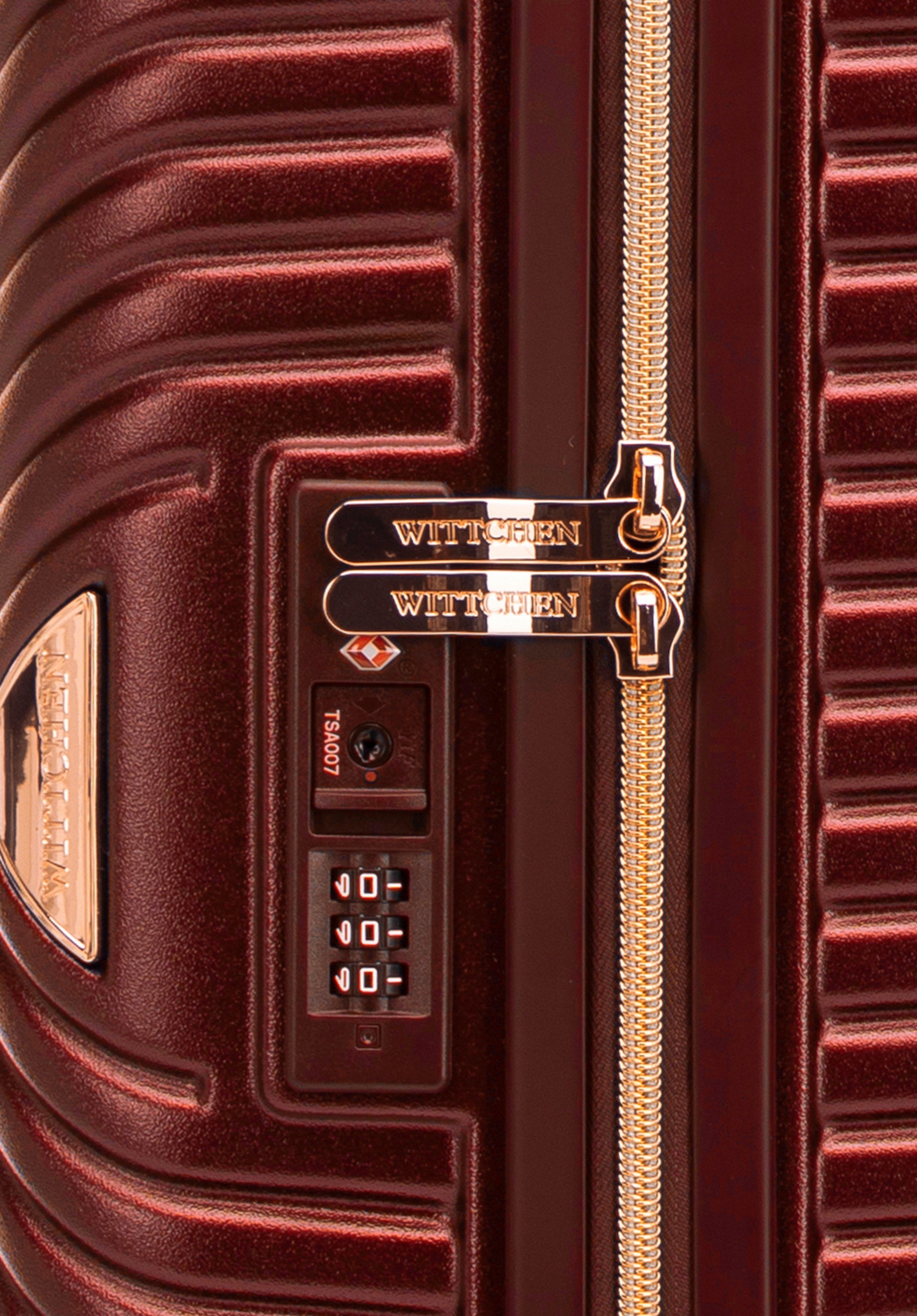 Kis méretű kabin bőrőnd polikarbonátból matt felülettel. Designer modell, fényes, rózsaarany részletekkel. Kerekei ABS műanyagból készülnek, elasztikus bevonattal. A bőrönd belsejét bézs színű poliészter bélés borítja, WITTCHEN logóval.