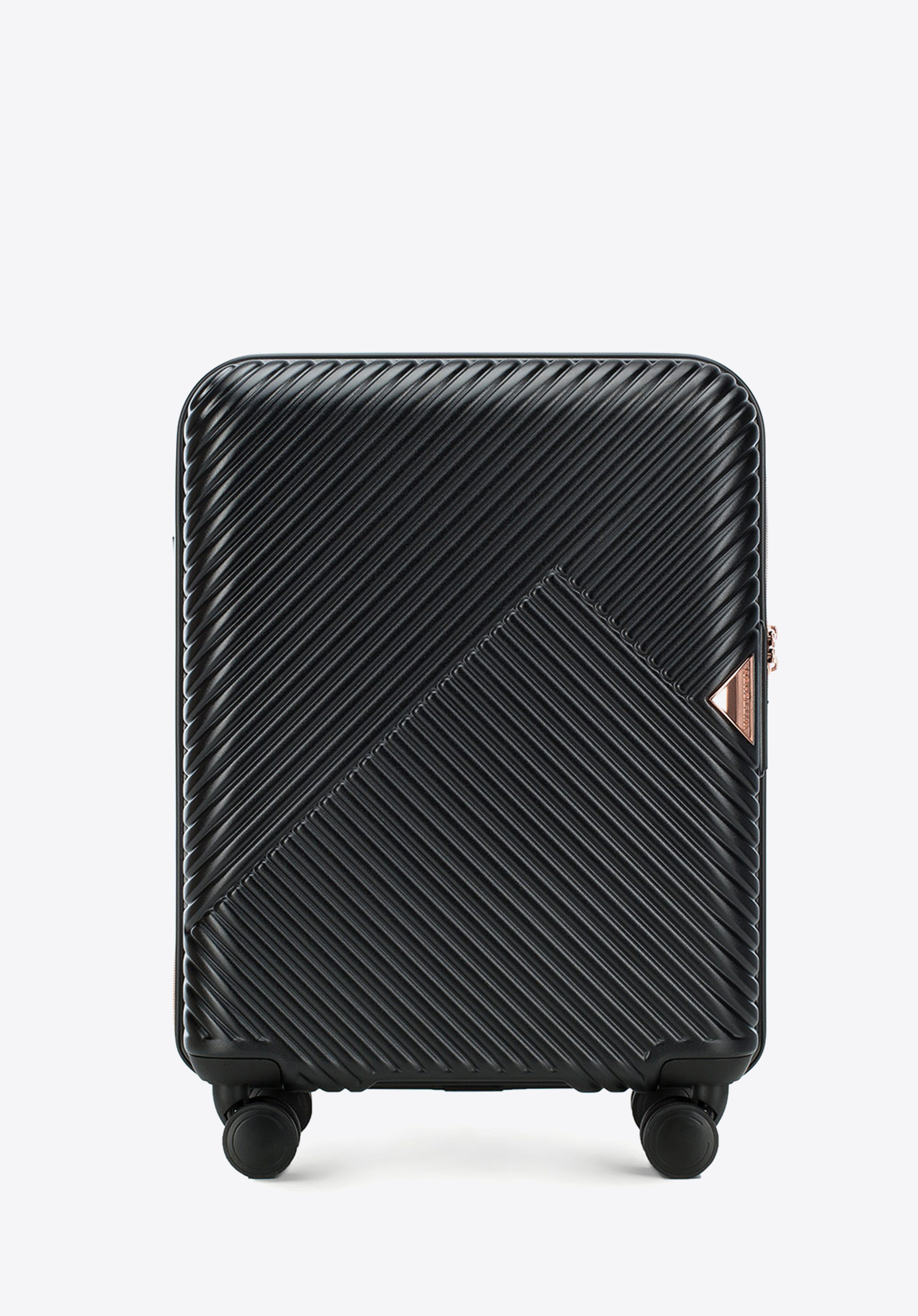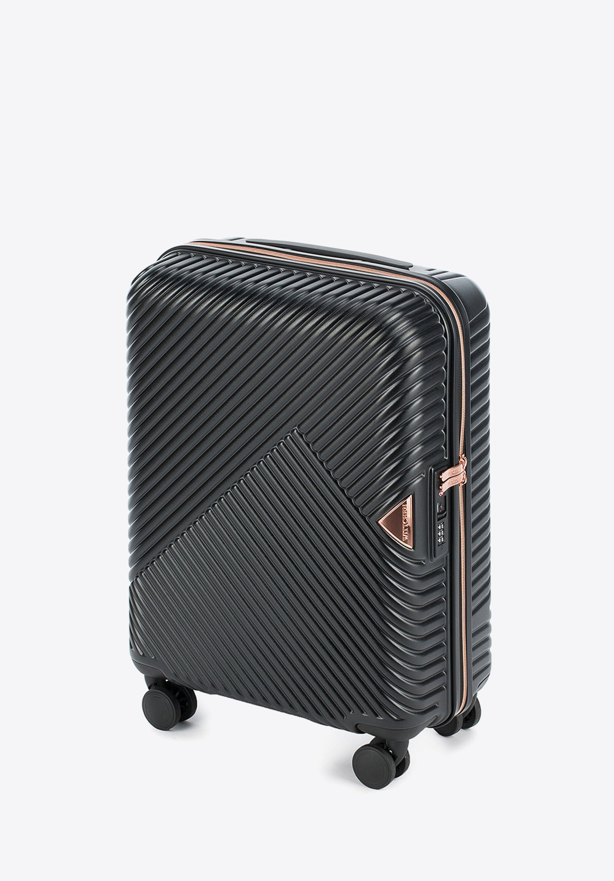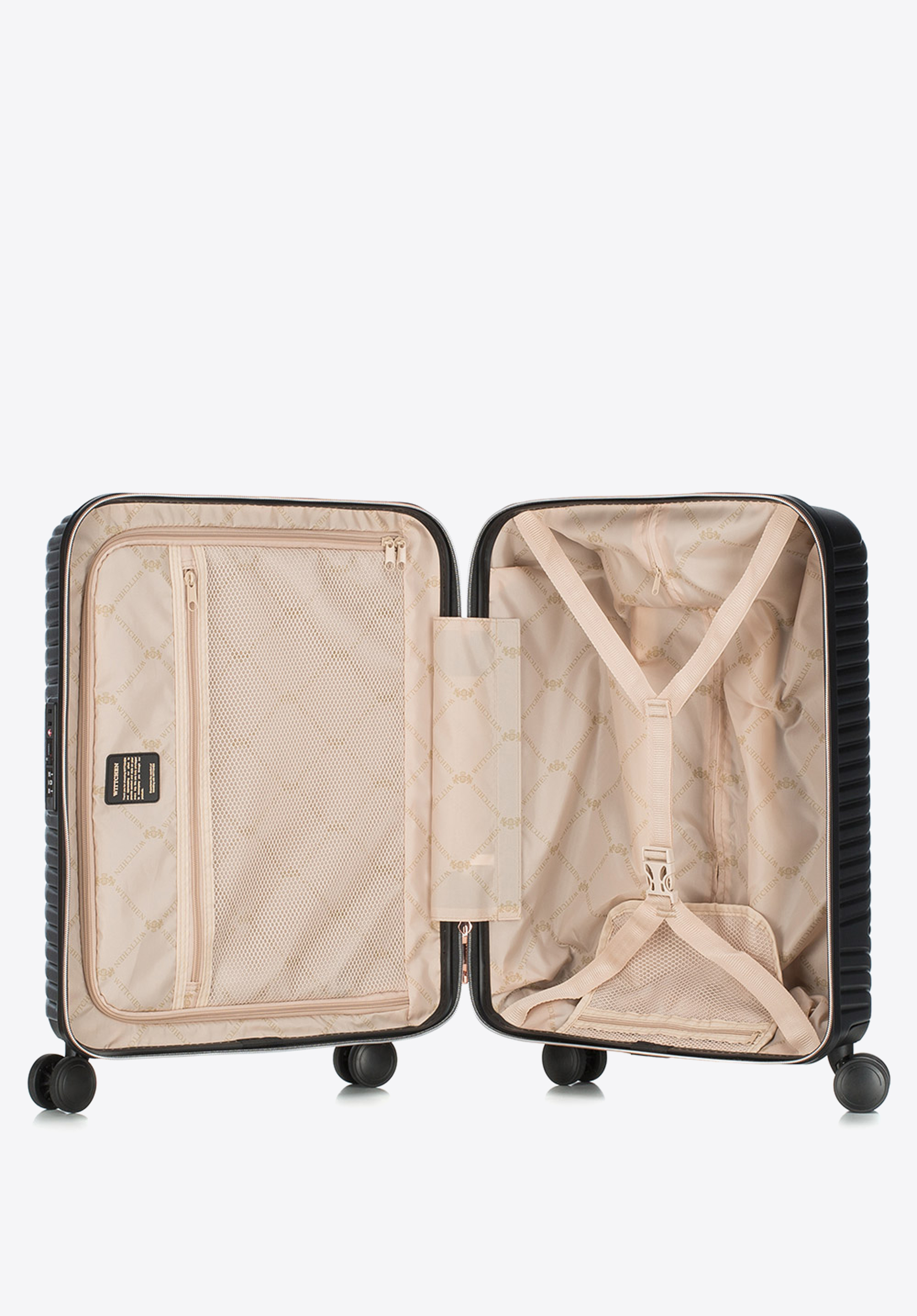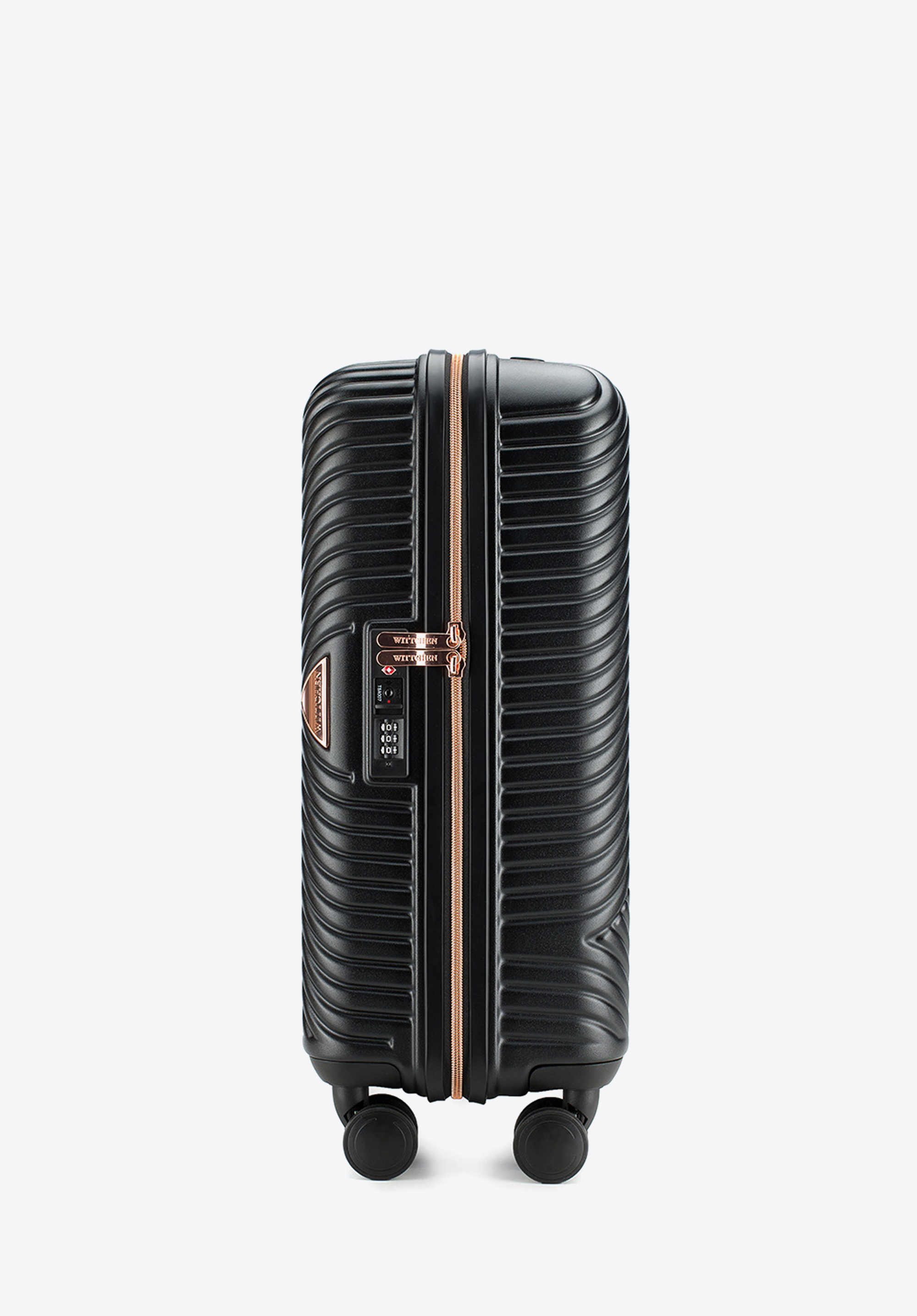 Kis méretű kabin bőrőnd polikarbonátból matt felülettel. Designer modell, fényes, rózsaarany részletekkel. Kerekei ABS műanyagból készülnek, elasztikus bevonattal. A bőrönd belsejét bézs színű poliészter bélés borítja, WITTCHEN logóval.