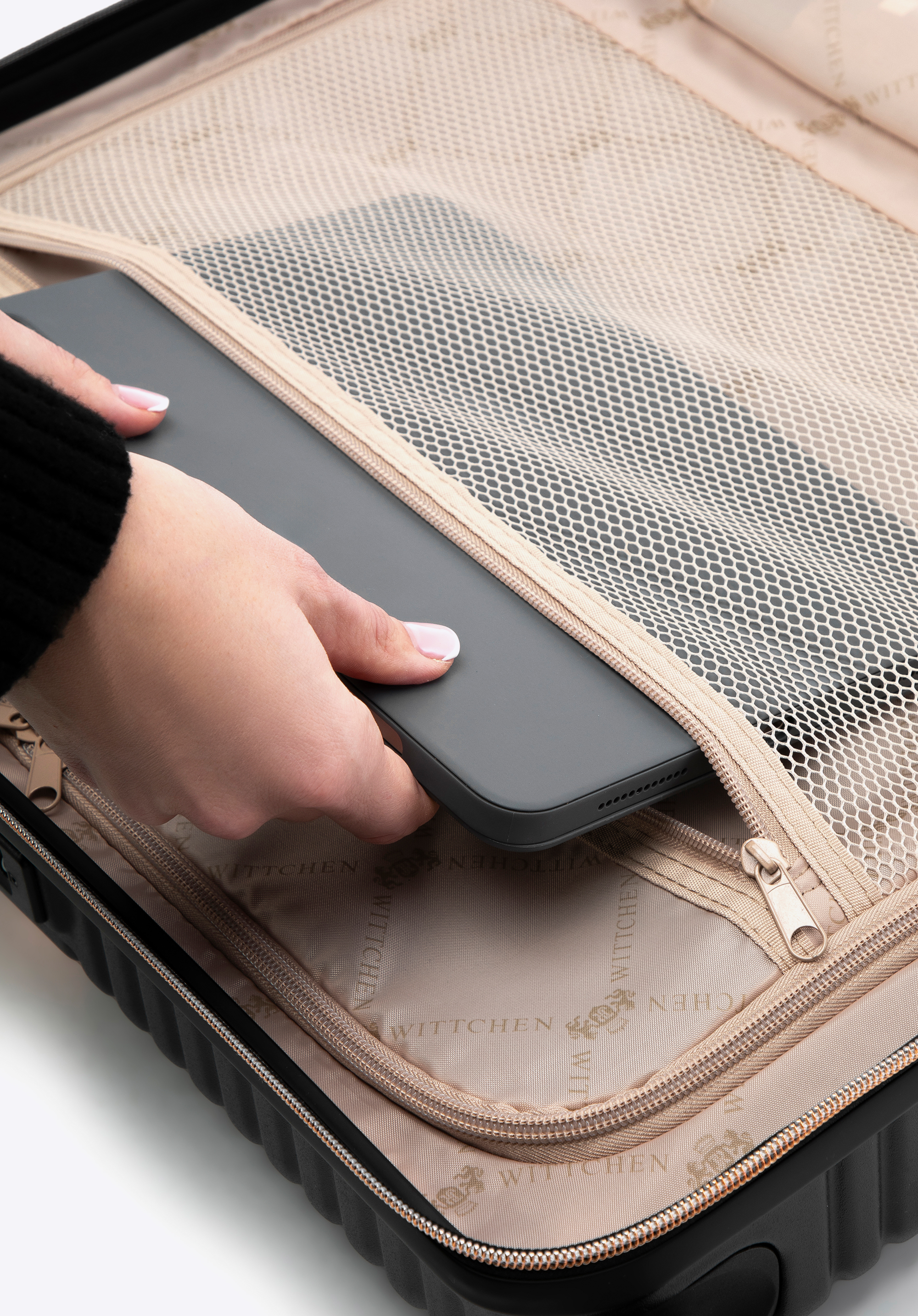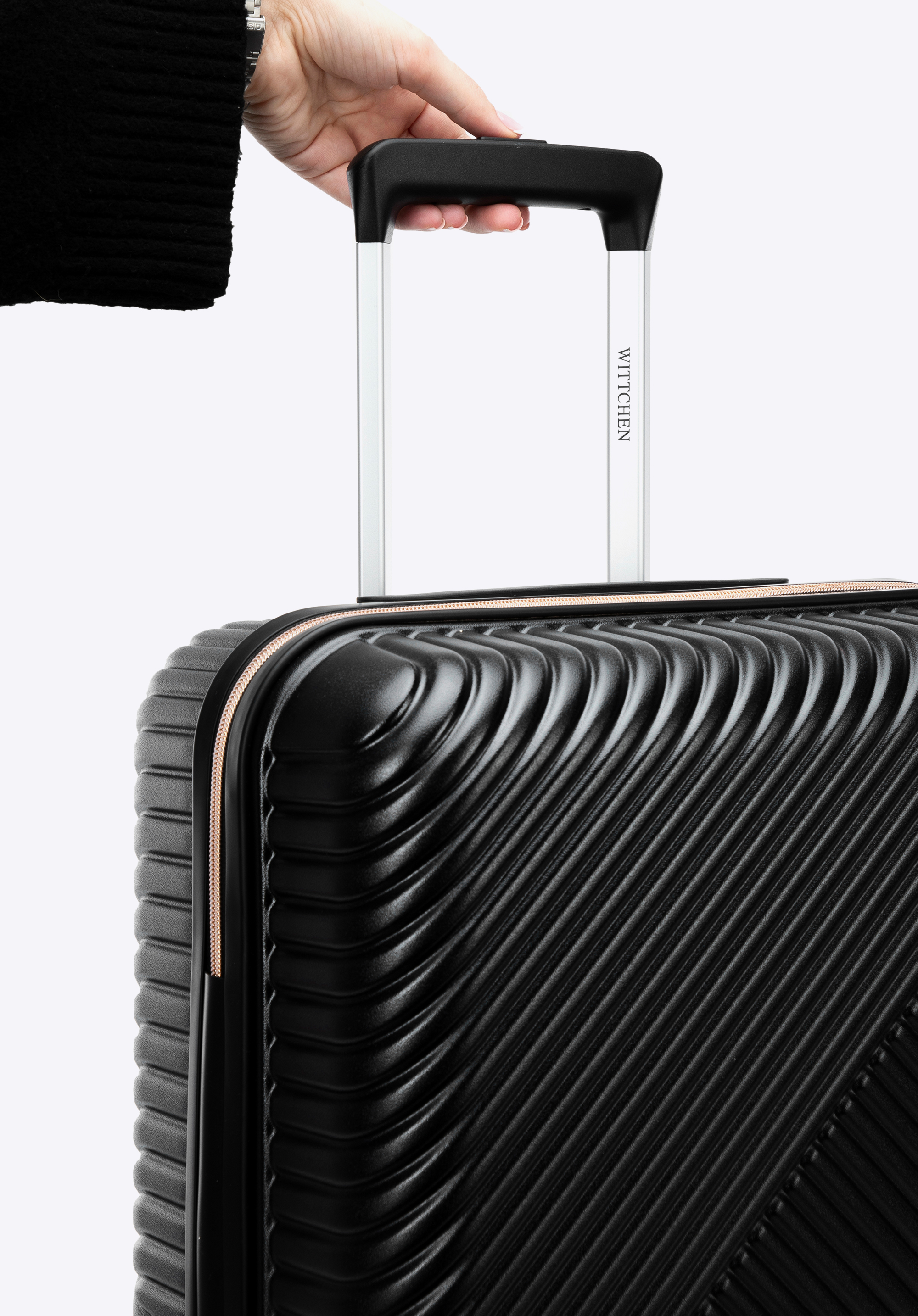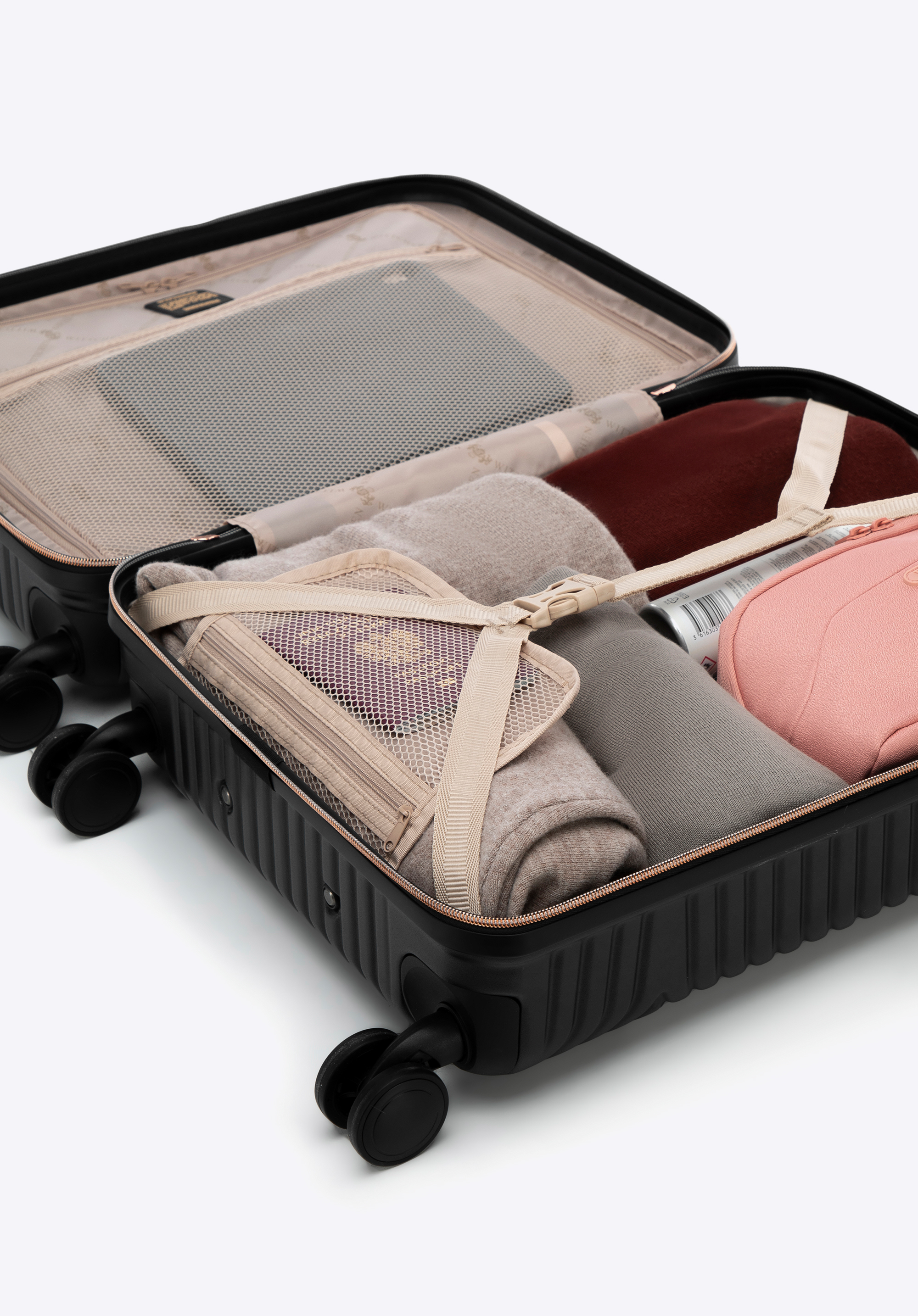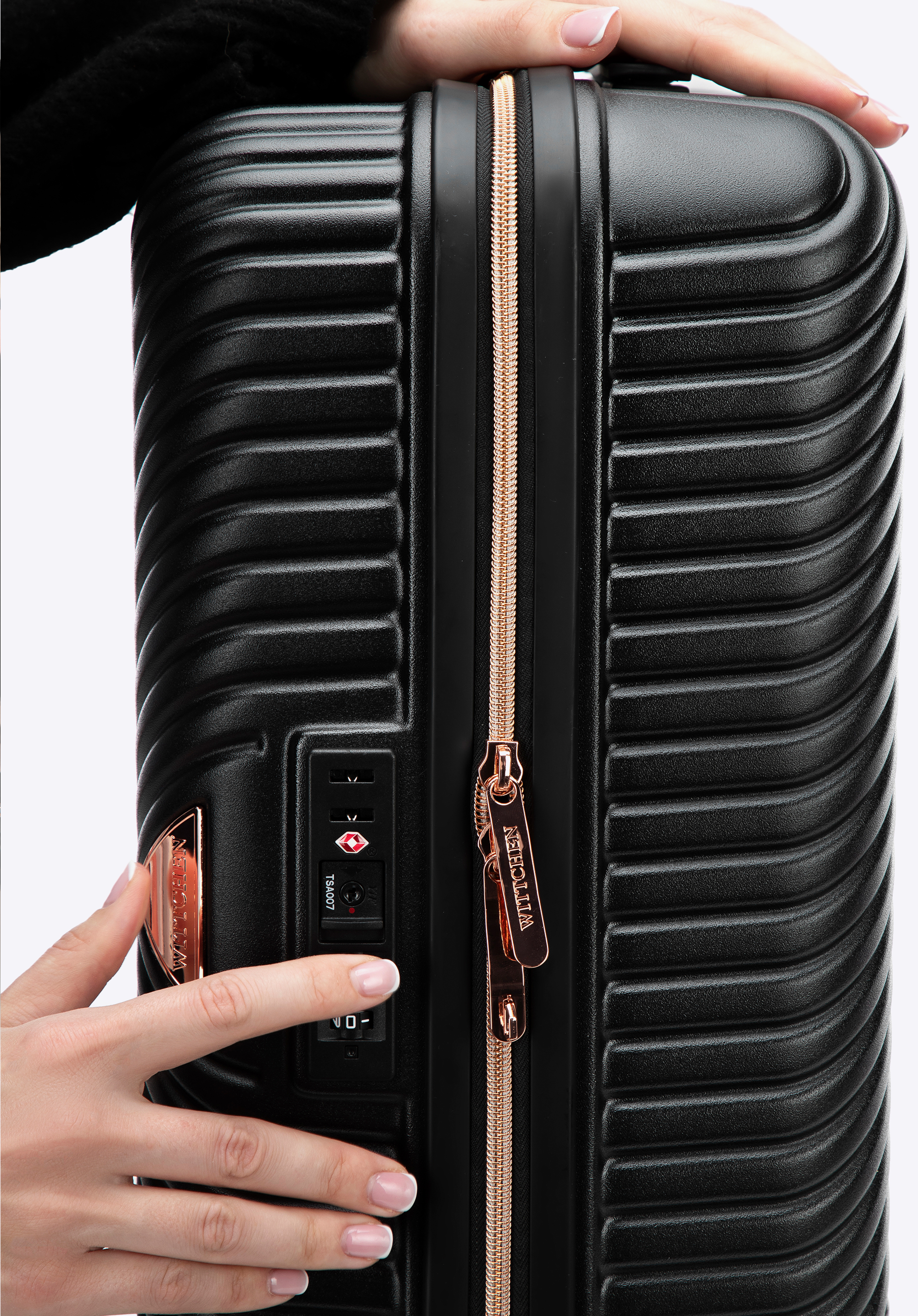 Kis méretű kabin bőrőnd polikarbonátból matt felülettel. Designer modell, fényes, rózsaarany részletekkel. Kerekei ABS műanyagból készülnek, elasztikus bevonattal. A bőrönd belsejét bézs színű poliészter bélés borítja, WITTCHEN logóval.