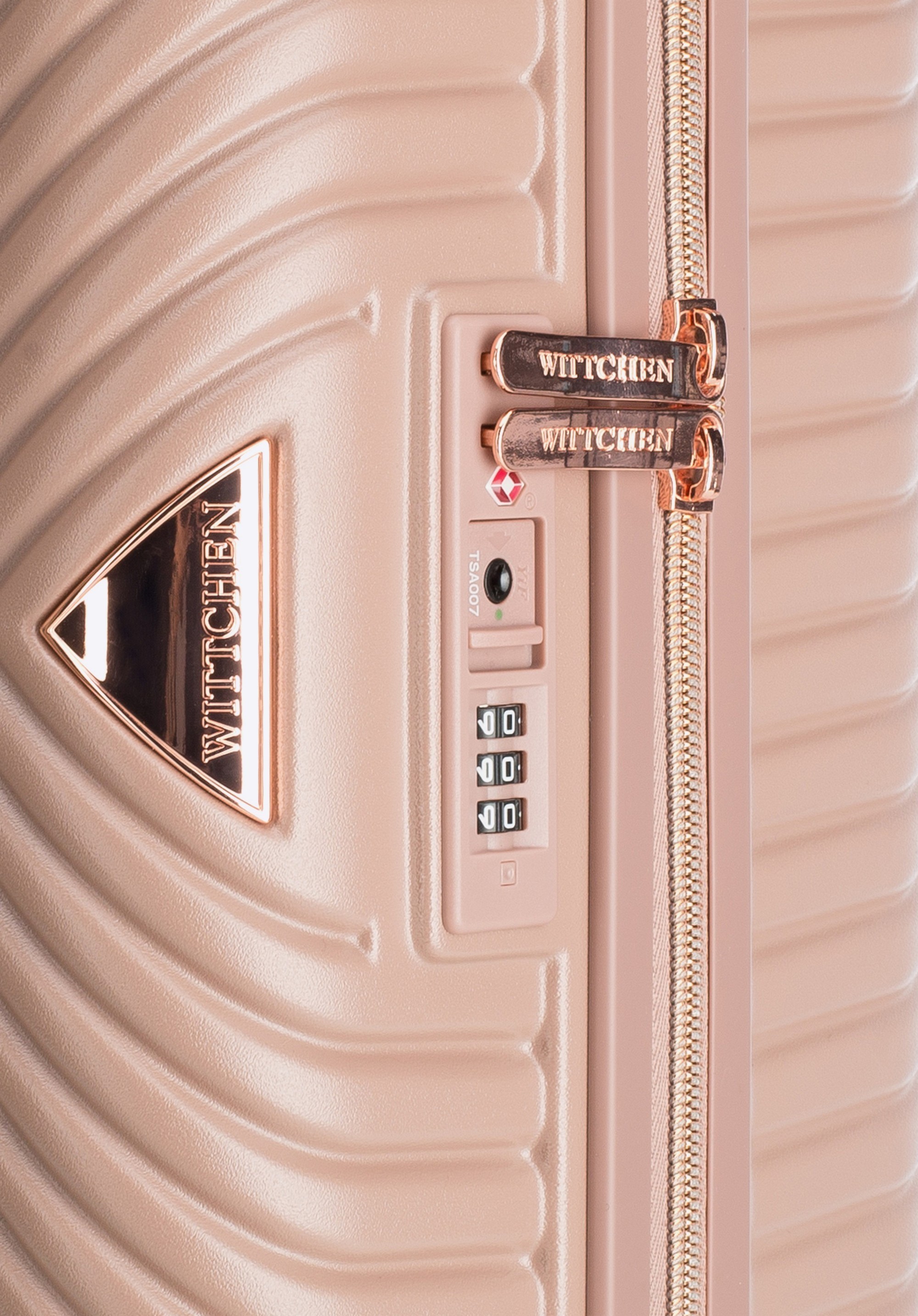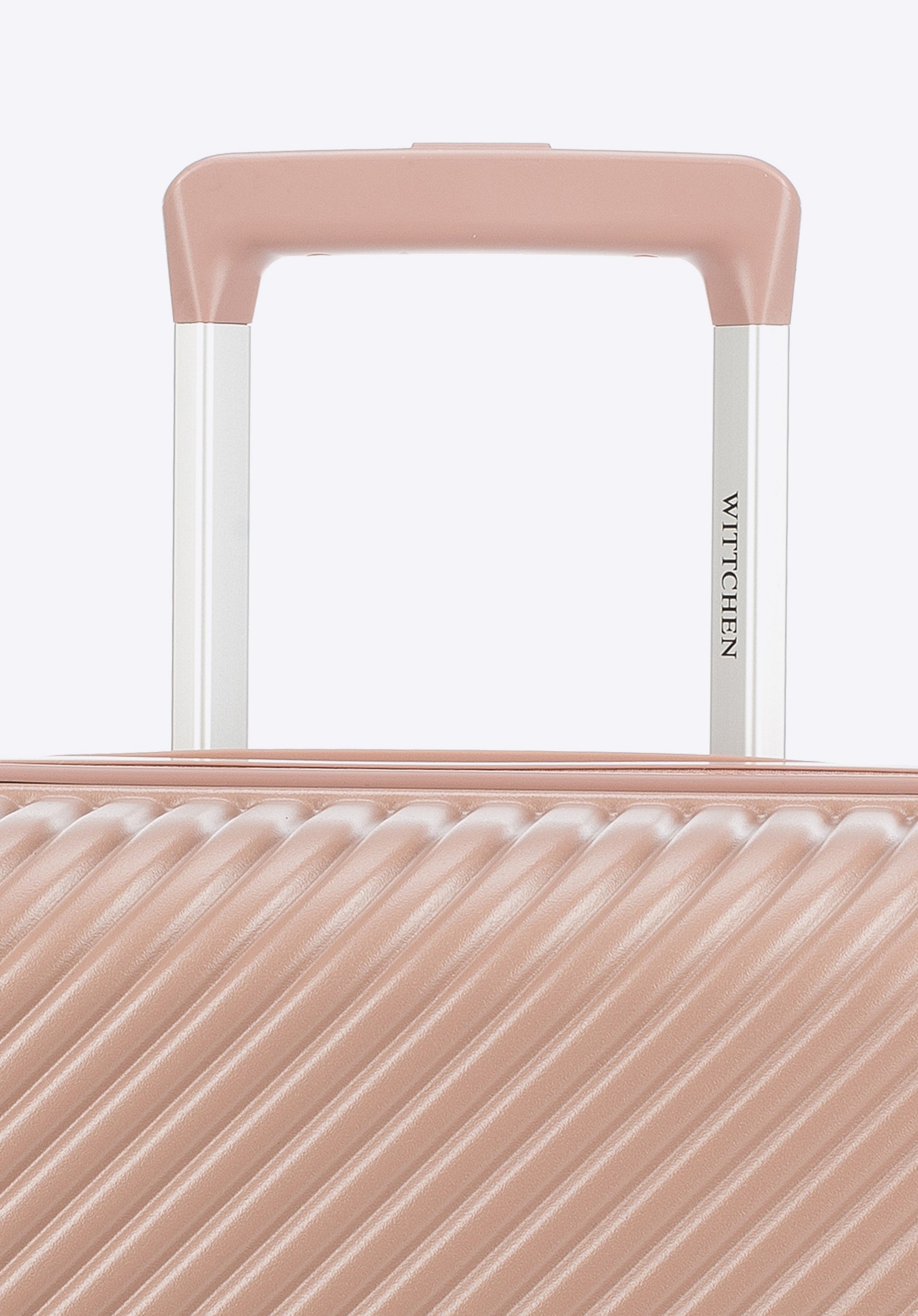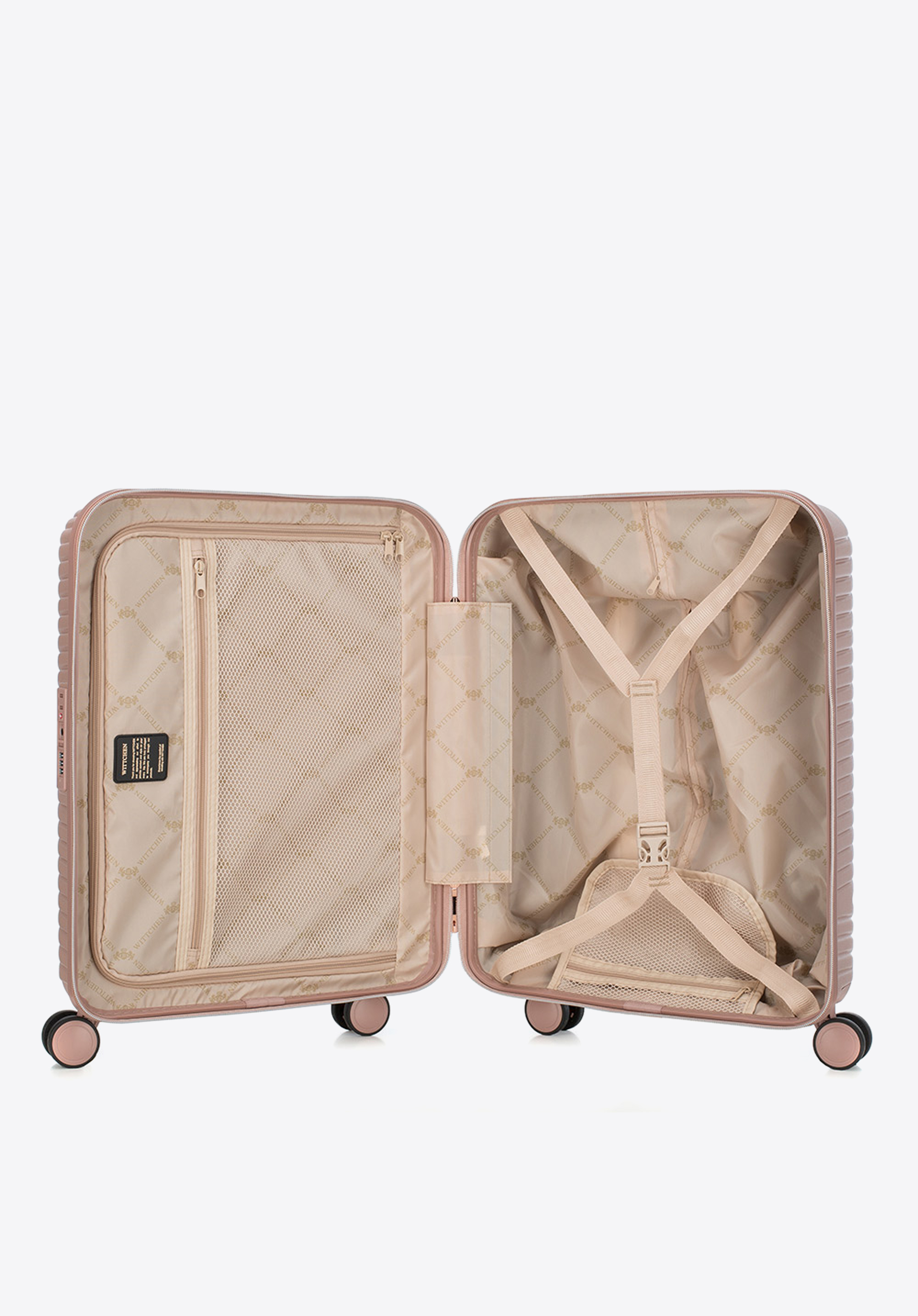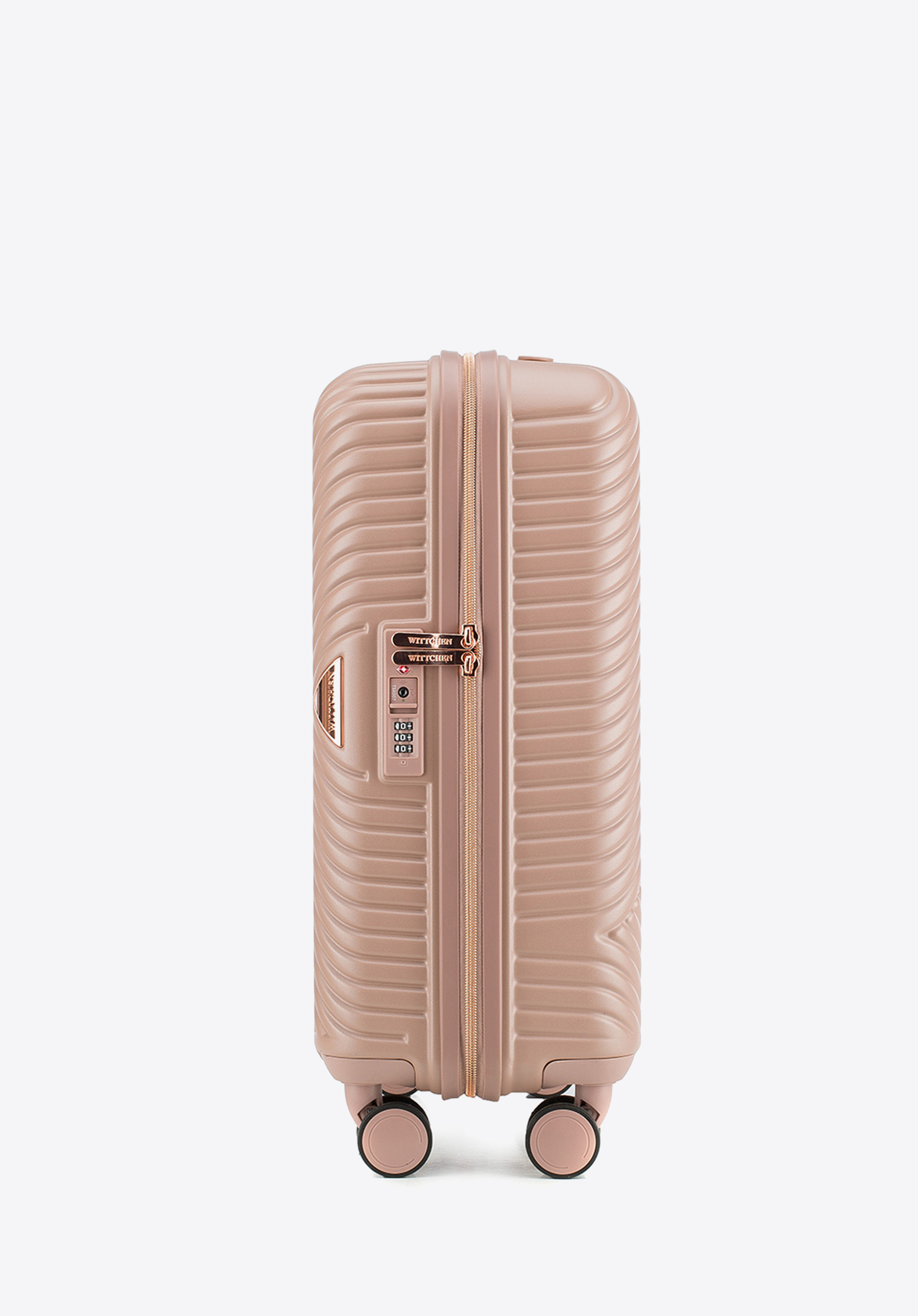 Kis méretű kabin bőrőnd polikarbonátból matt felülettel. Designer modell, fényes, rózsaarany részletekkel. Kerekei ABS műanyagból készülnek, elasztikus bevonattal. A bőrönd belsejét bézs színű poliészter bélés borítja, WITTCHEN logóval.