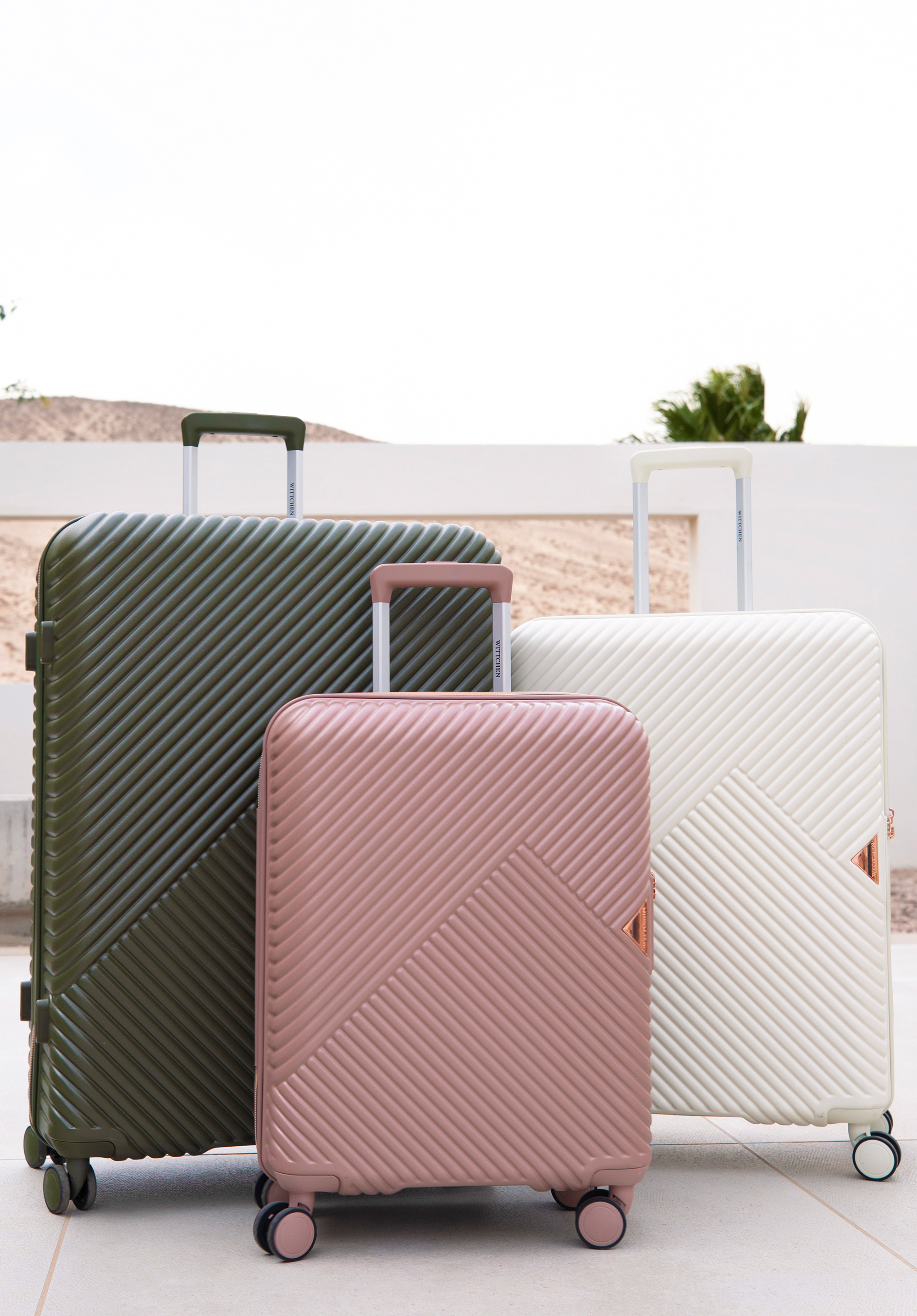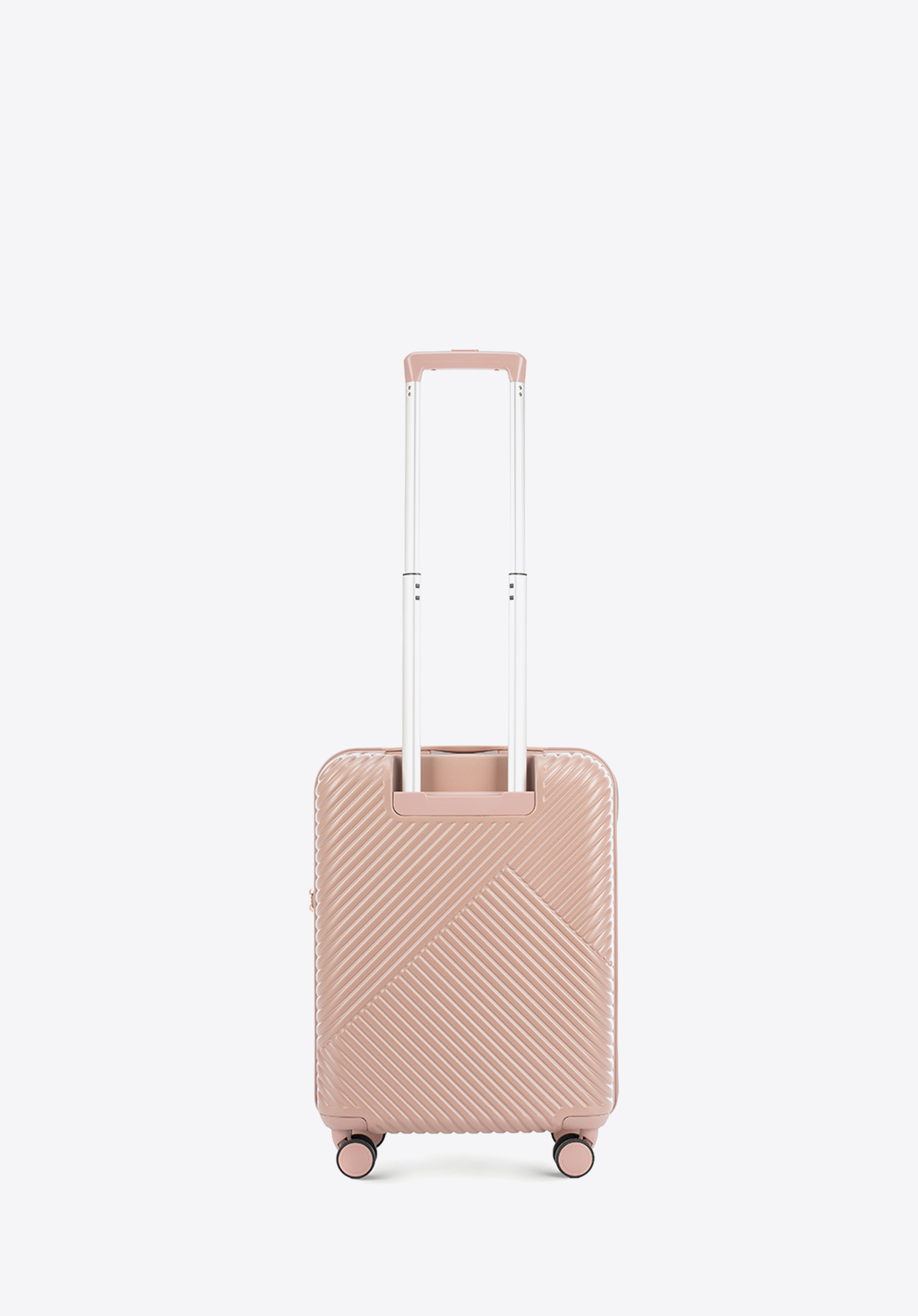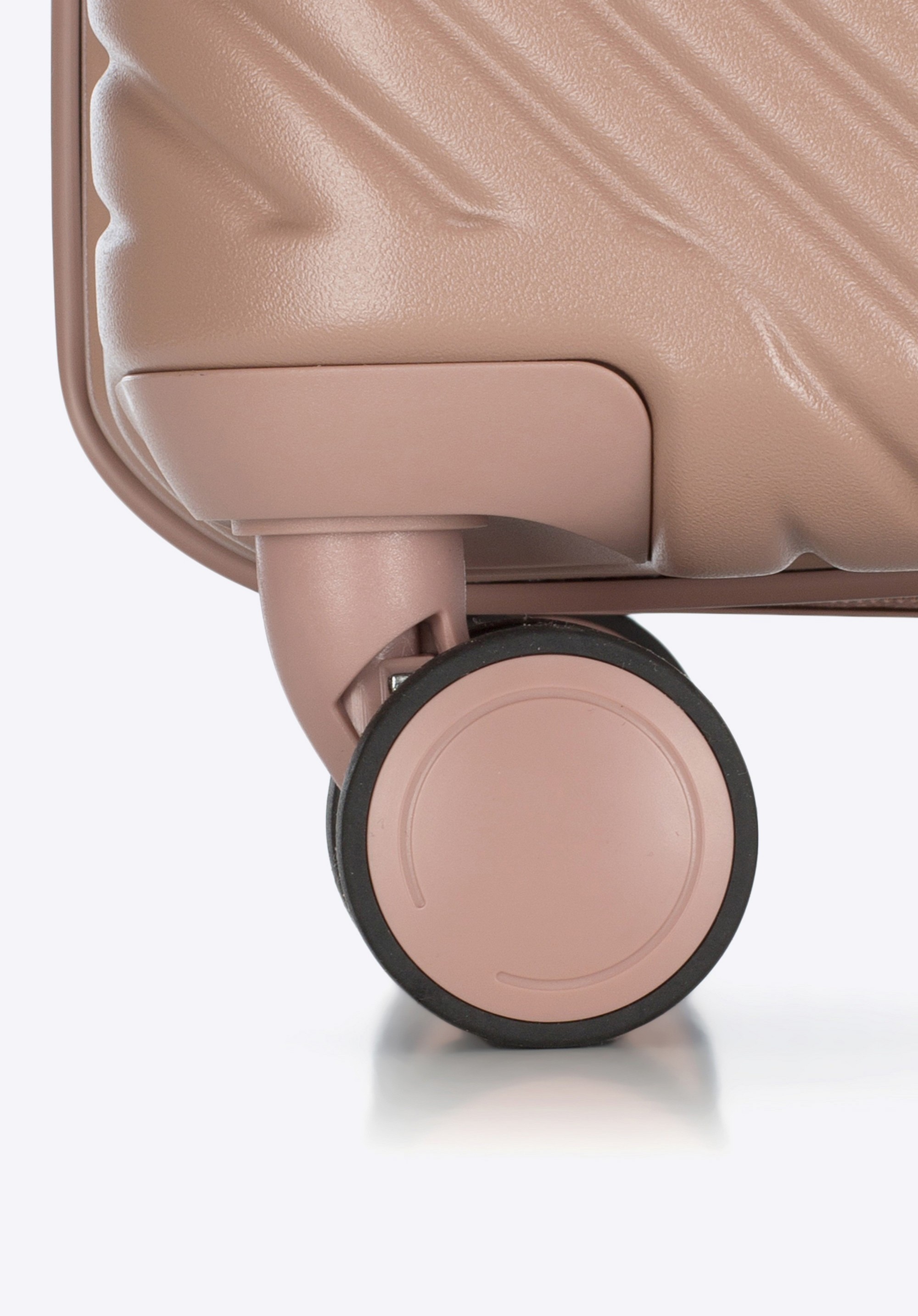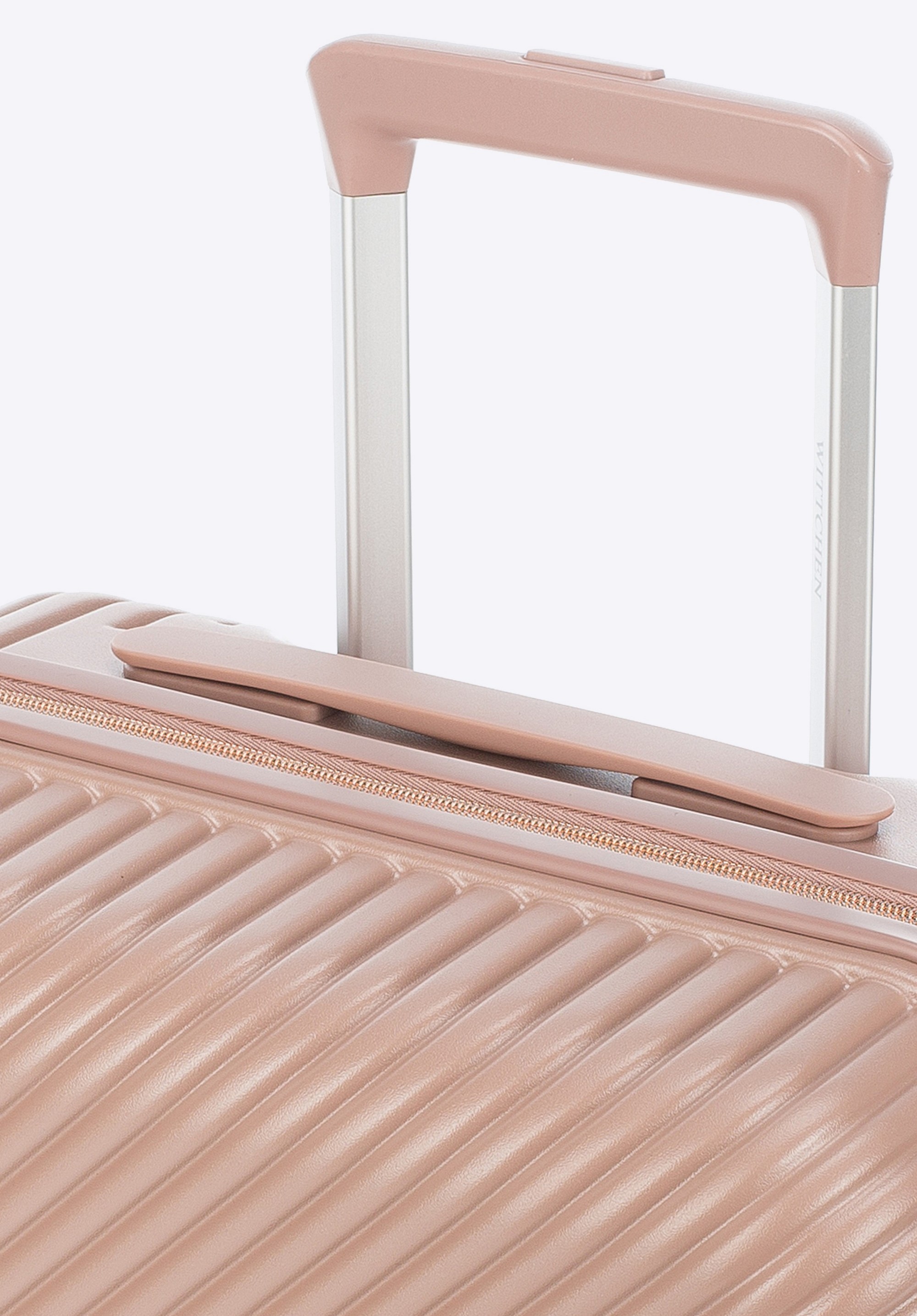 Kis méretű kabin bőrőnd polikarbonátból matt felülettel. Designer modell, fényes, rózsaarany részletekkel. Kerekei ABS műanyagból készülnek, elasztikus bevonattal. A bőrönd belsejét bézs színű poliészter bélés borítja, WITTCHEN logóval.
