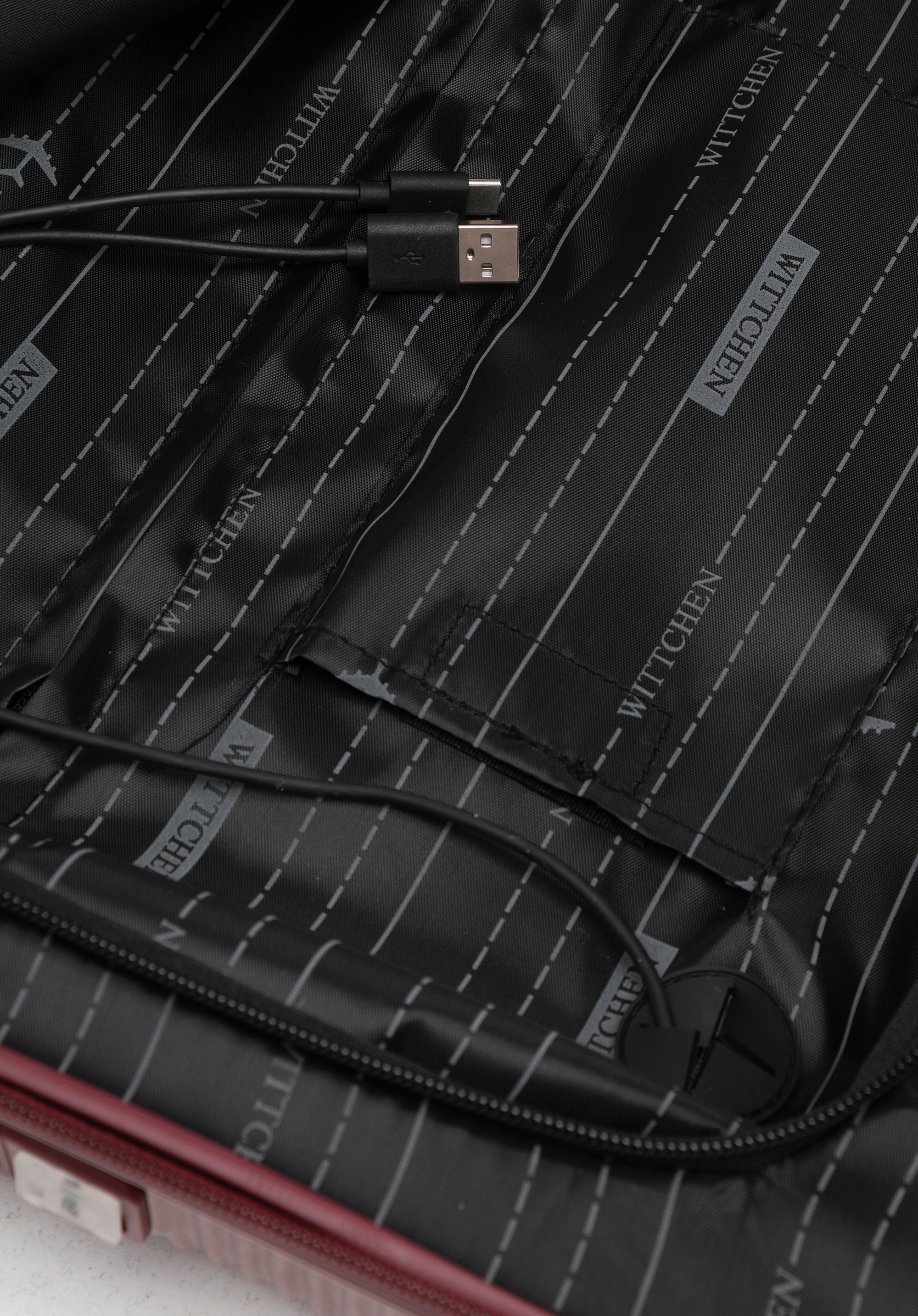 - USB-port: Integrált USB-port belső kábellel, a zárnál elhelyezve, és a fő rekeszben található, dedikált powerbank-zsebhez csatlakozik. Lehetővé teszi az elektronikus eszközök egyszerű csatlakoztatását, kényelmet és kényelmes töltést biztosítva útközben.
