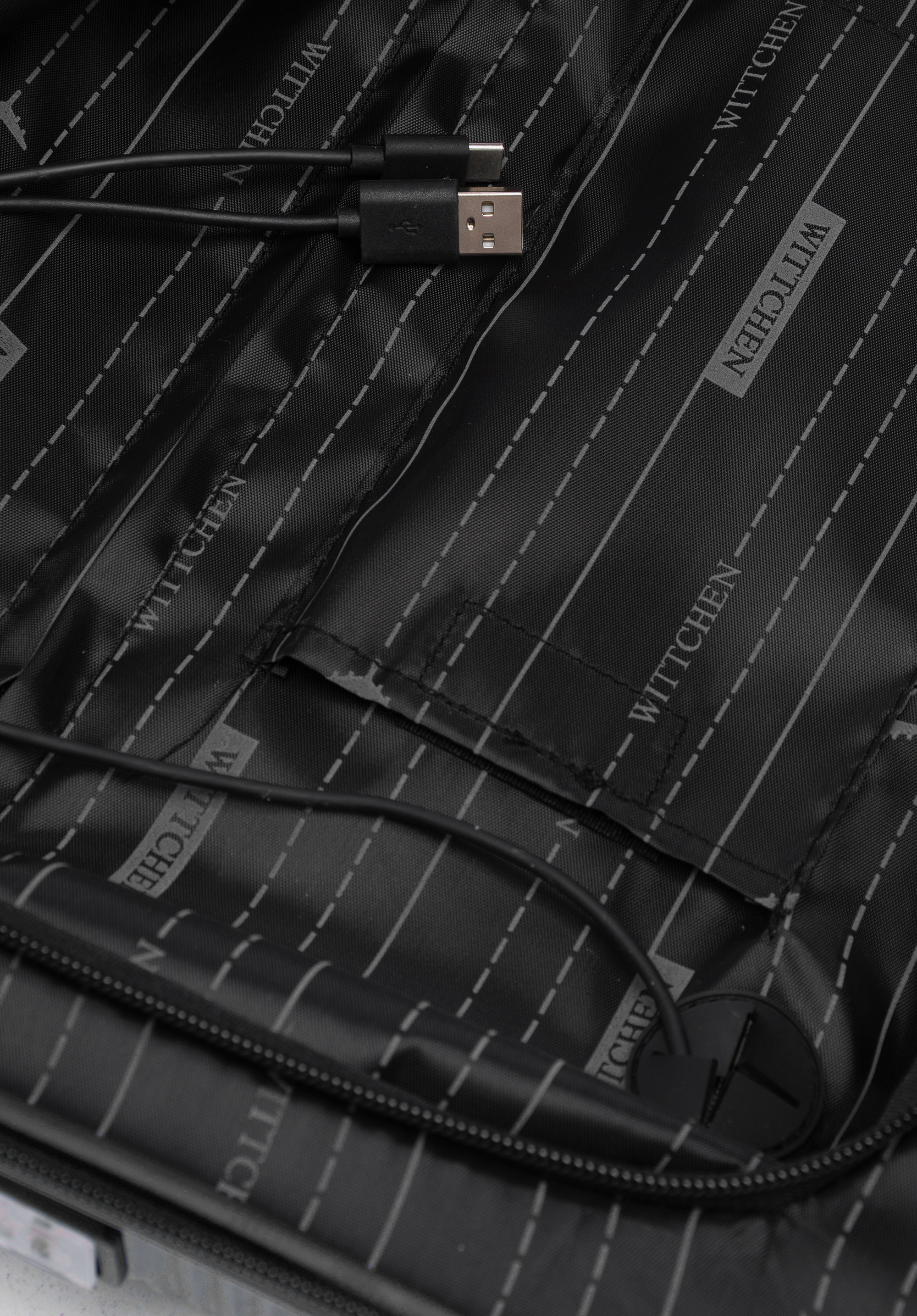 - USB-port: Integrált USB-port belső kábellel, a zárnál elhelyezve, és a fő rekeszben található, dedikált powerbank-zsebhez csatlakozik. Lehetővé teszi az elektronikus eszközök egyszerű csatlakoztatását, kényelmet és kényelmes töltést biztosítva útközben.