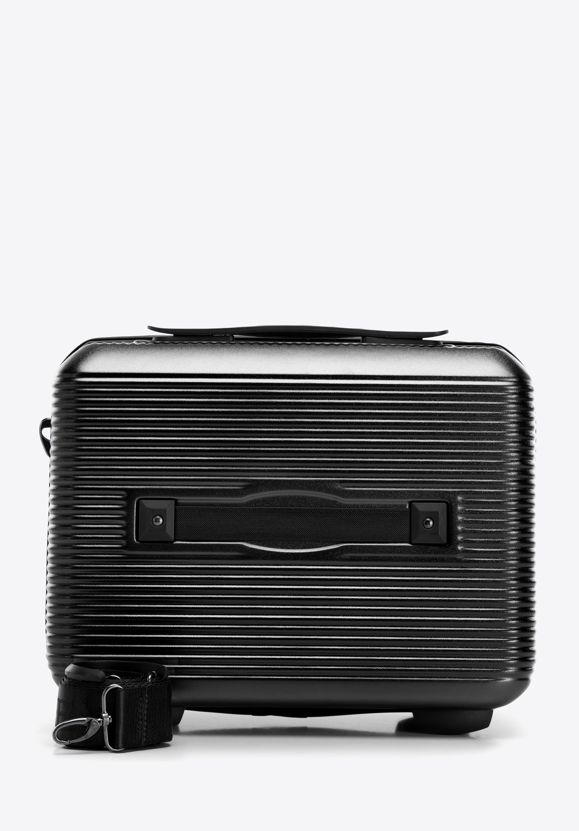- Kozmetikai táska: Praktikus fogantyúval, levehető és állítható vállpánttal, valamint rugalmas pánttal rendelkezik a bőrönd fogantyújához való biztonságos rögzítéshez.