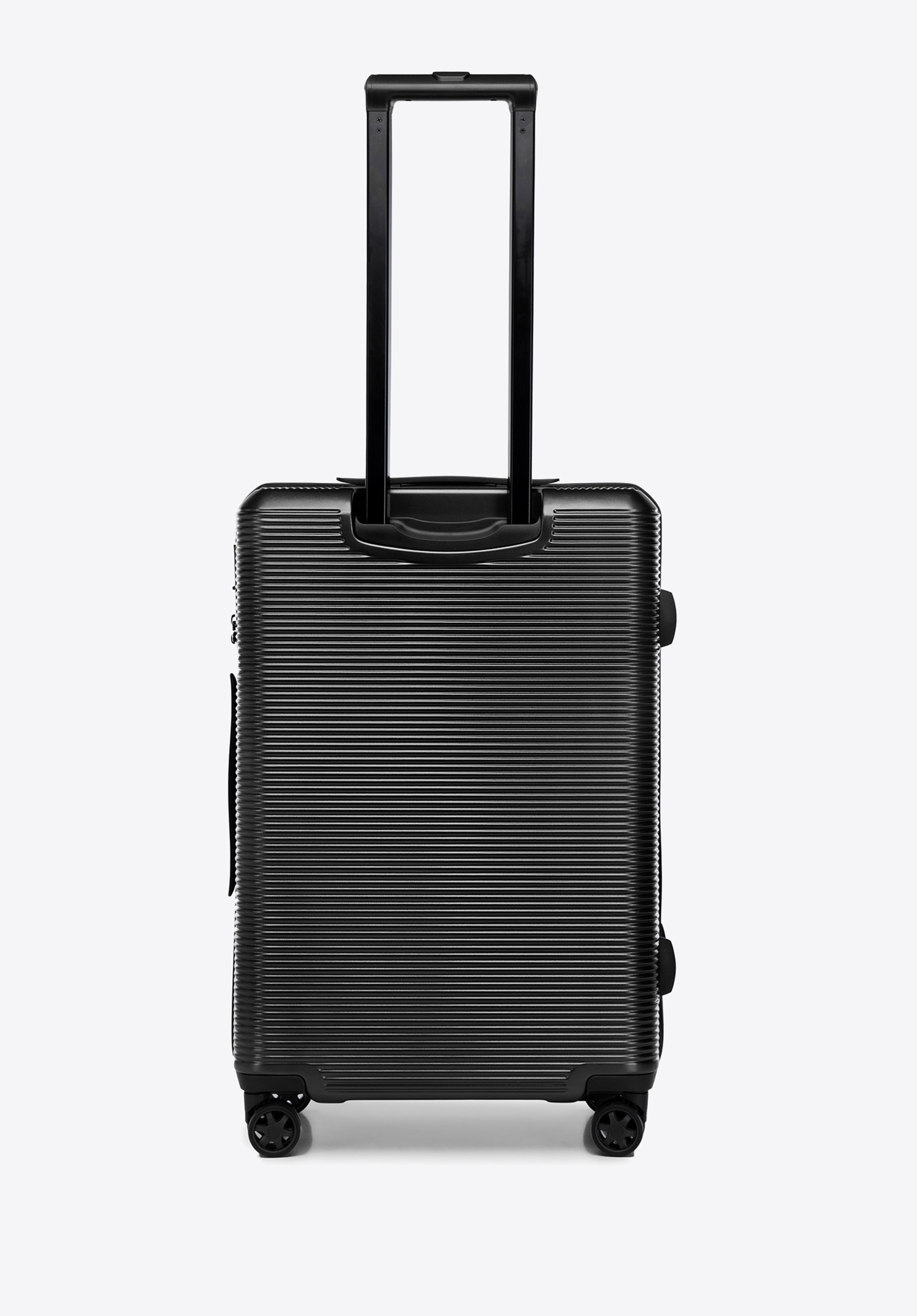 - Kialakítás: A függőleges csíkok és a sima középső panel elegáns, modern megjelenést kölcsönöznek a bőröndnek és a kozmetikai táskának.