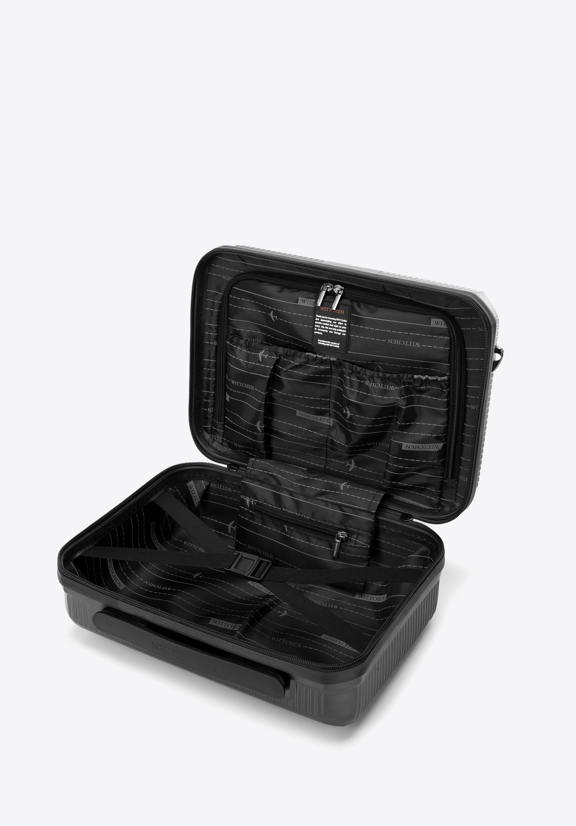 - Kozmetikai táska: Hordozófogantyúval, levehető és állítható vállpánttal, valamint a bőrönd fogantyújához rögzíthető rugalmas pánttal rendelkezik.