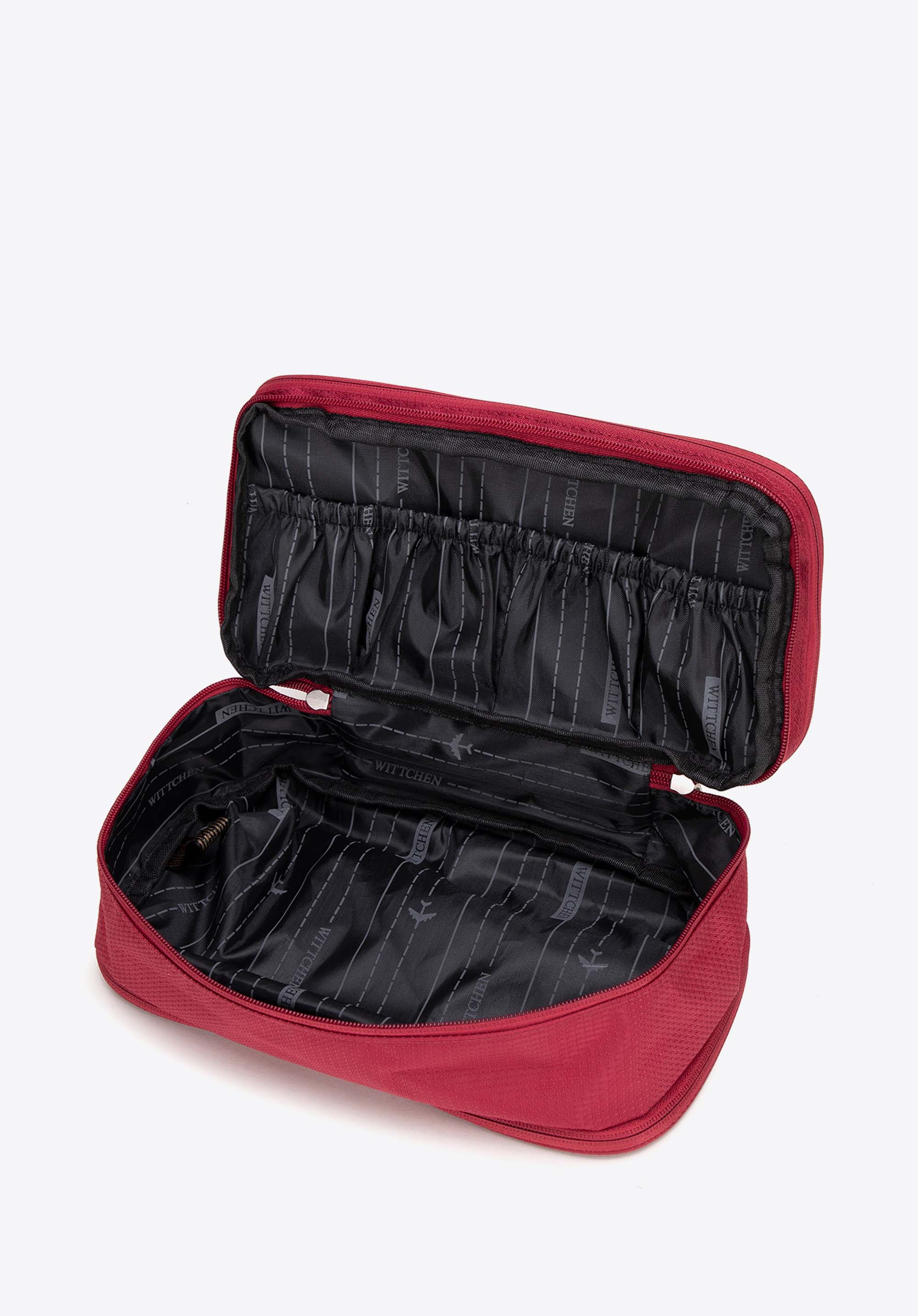 - Felépítés: Az első rekeszben négy kis PVC zseb található az apró tárgyak számára. A középső rekeszben négy elasztikus zseb található gumiszalaggal az apró tárgyak rögzítésére, megakadályozva a mozgást és a sérüléseket.
