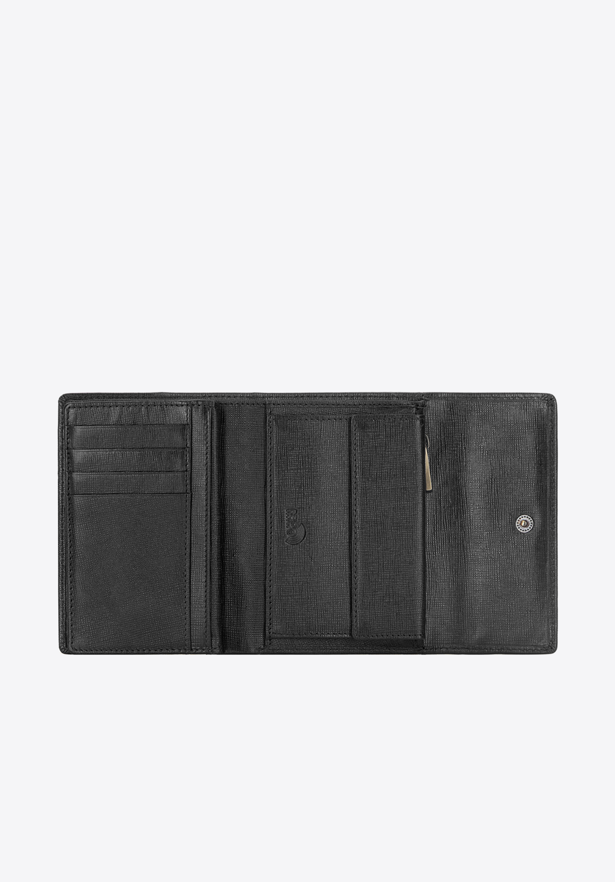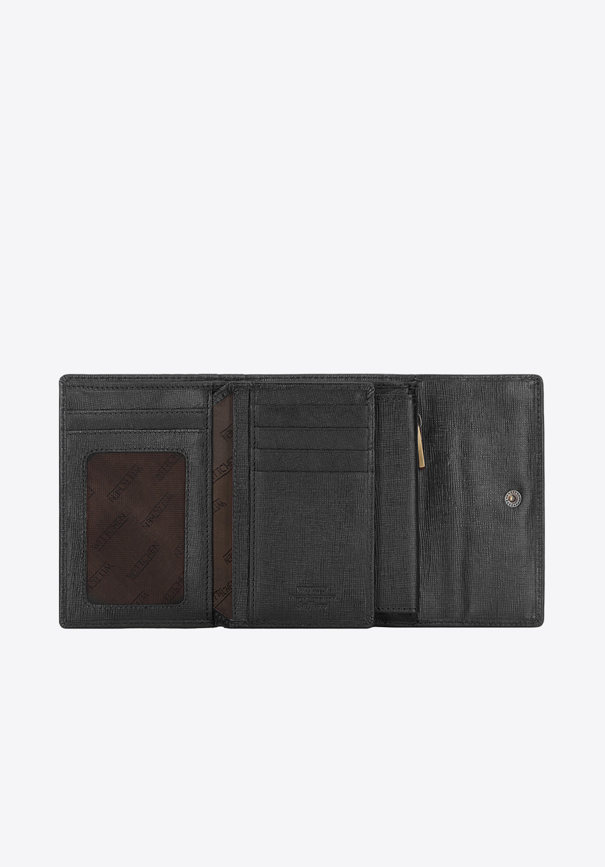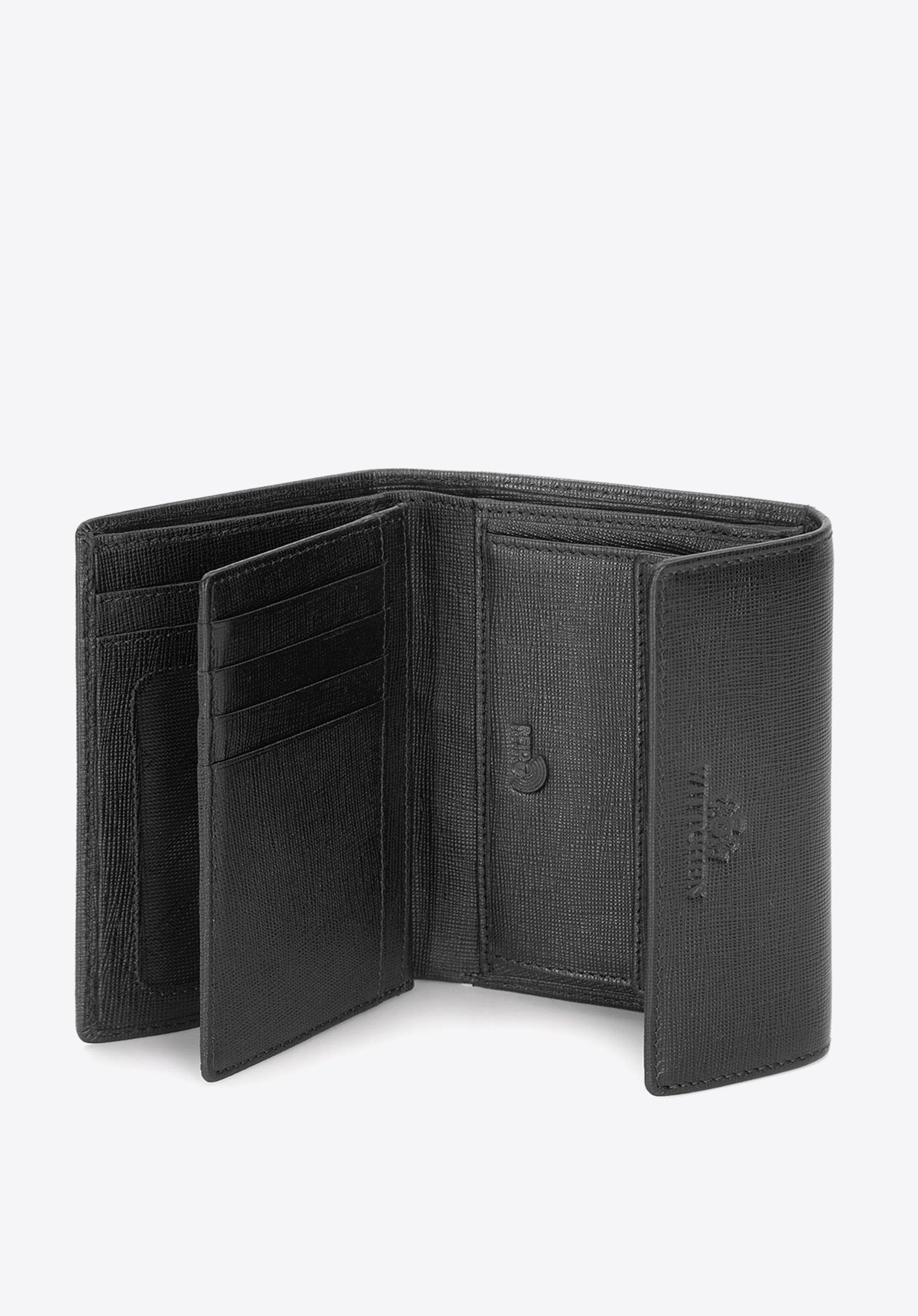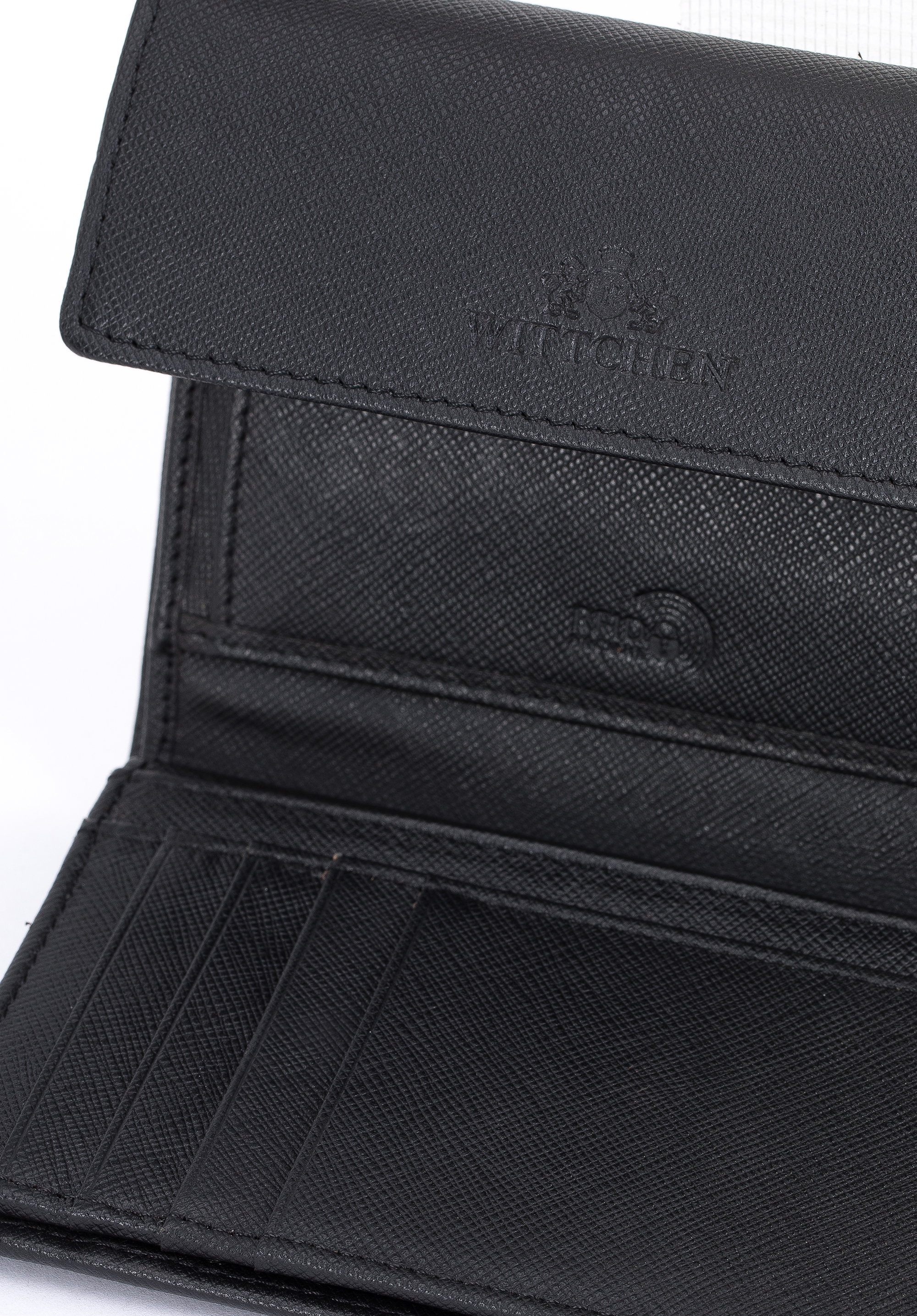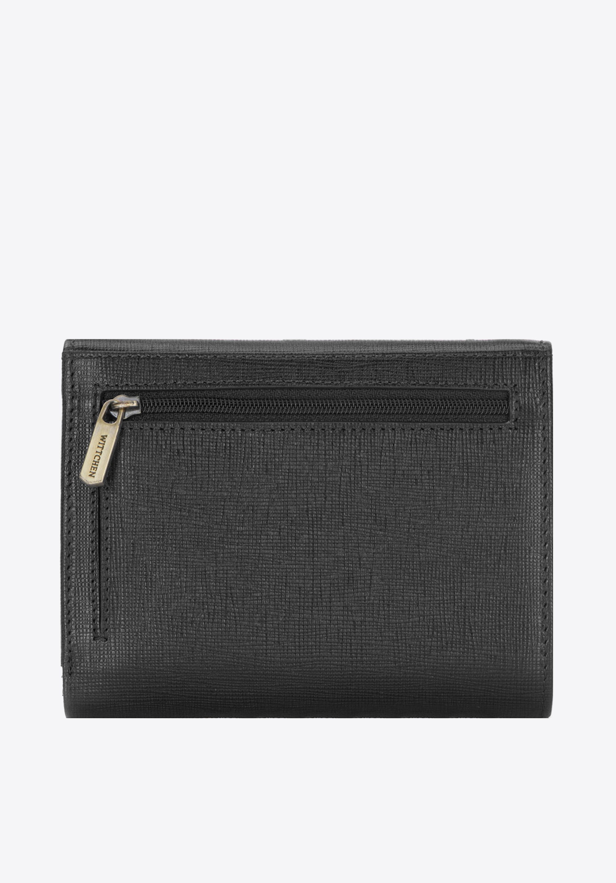 Négyzet alakú pénztárca, kis méretű, de nagyon tágas belsővel. A modell nemes, nagyon karcálló saffiano bőrből készült. Innovatív béléssel van felszerelve, amely megakadályozza az adatok kártyáról történő szkennelését. A pénztárcán a bőrbe domborított WITTCHEN címer formájú dísz található.