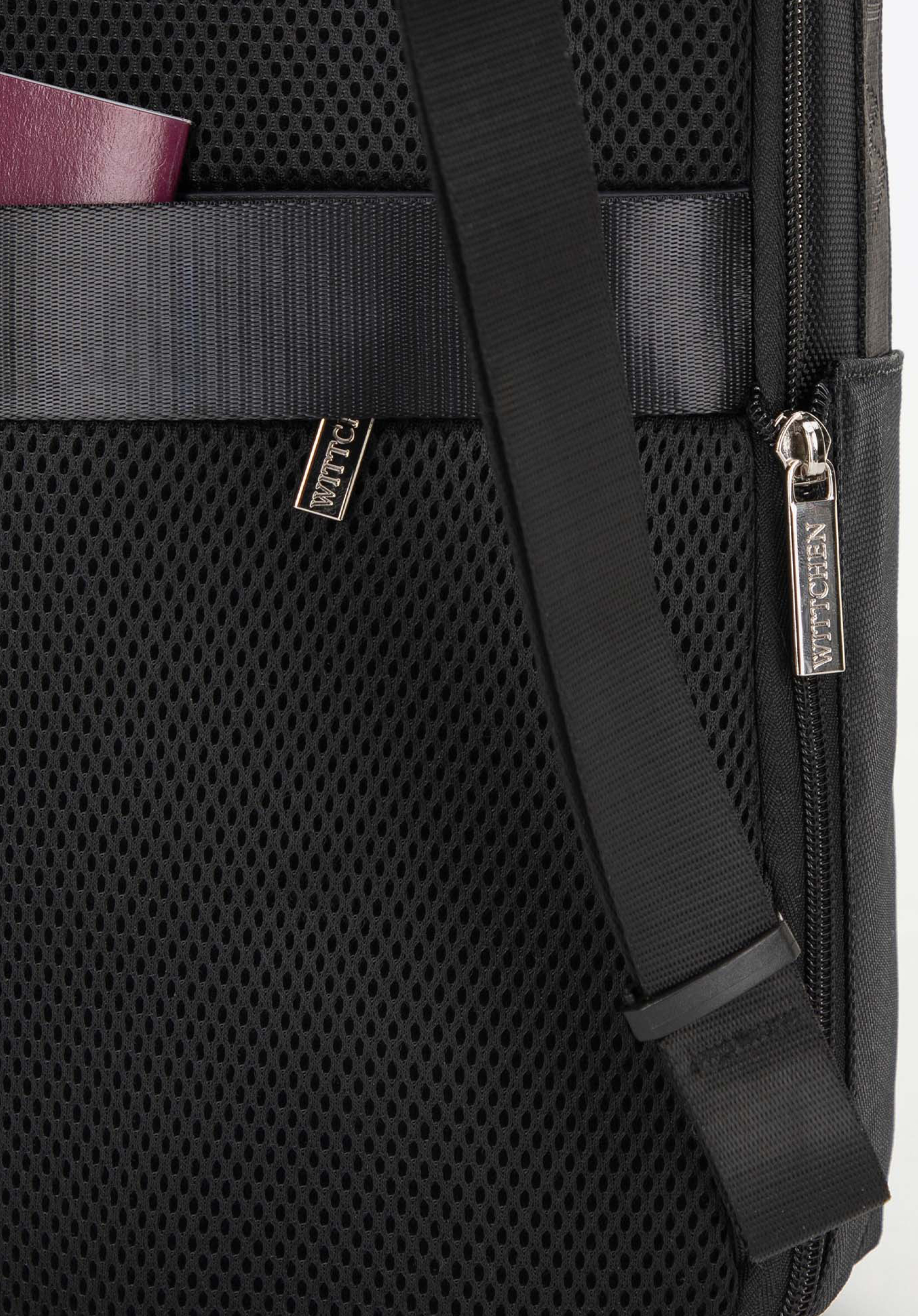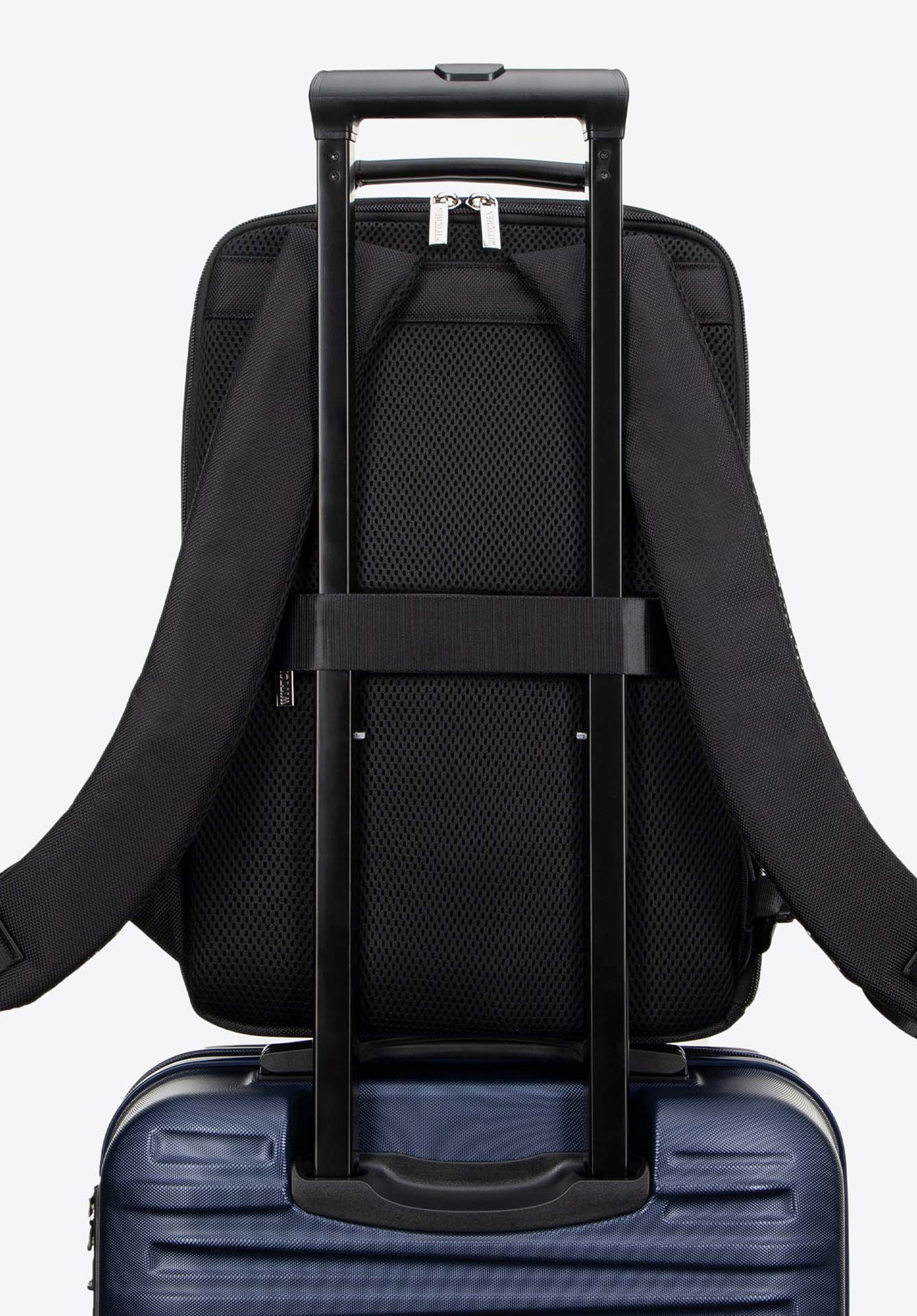 - Hátsó pánt: Lehetővé teszi, hogy gyorsan és egyszerűen rögzítsd a hátizsákot a bőrönd fogantyújához a maximális kényelem érdekében, miközben áthaladsz a repülőtéren vagy az állomáson.