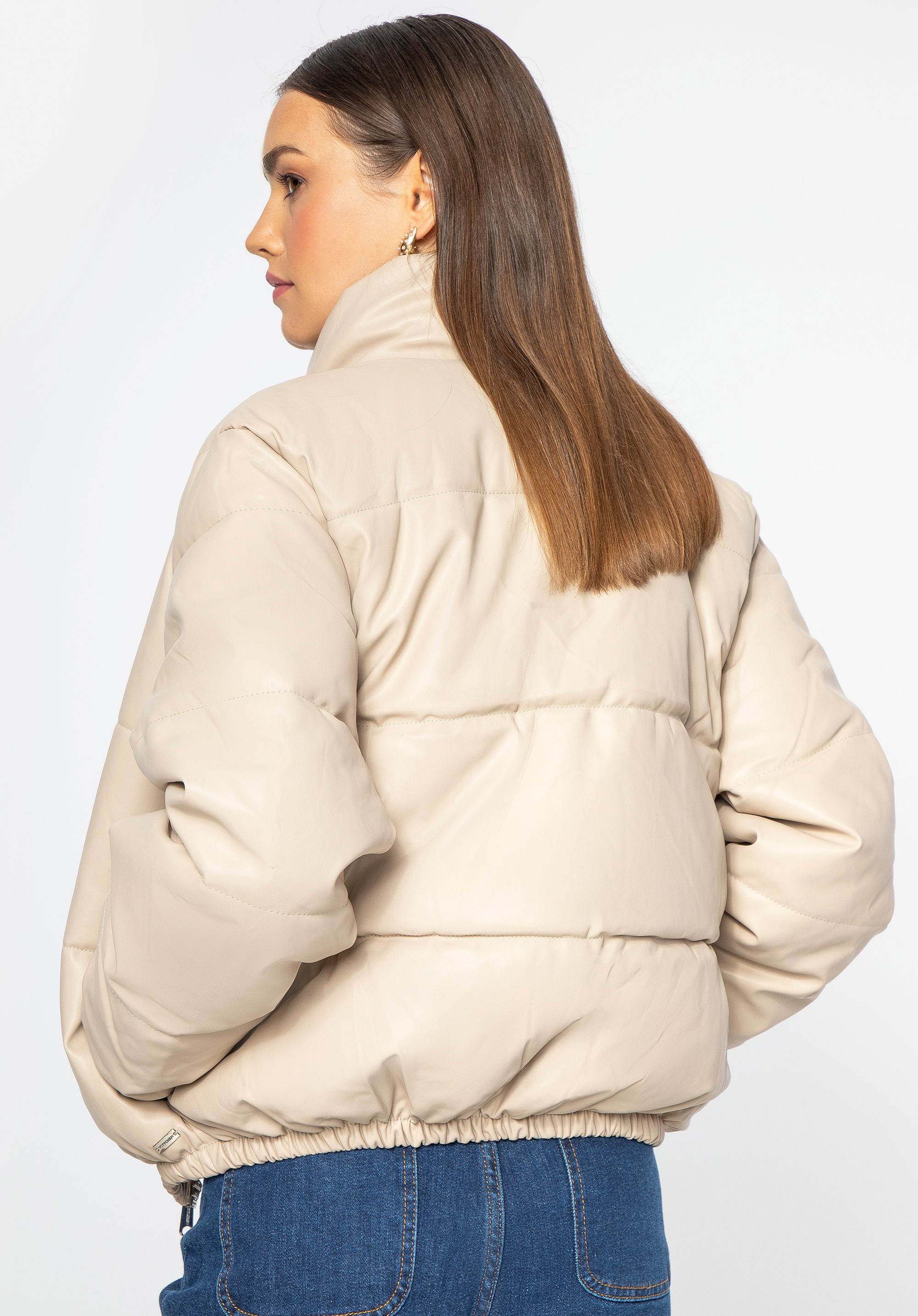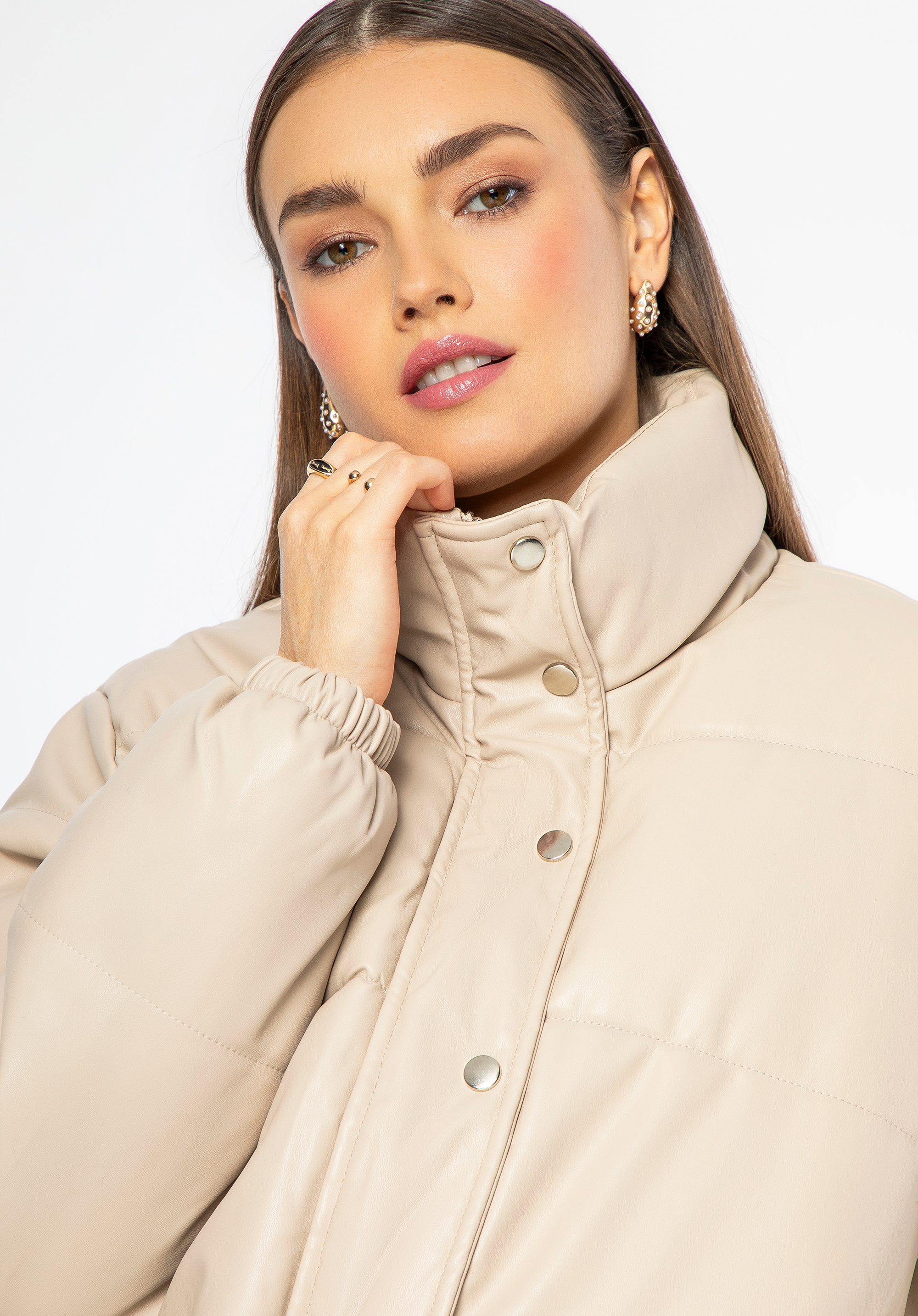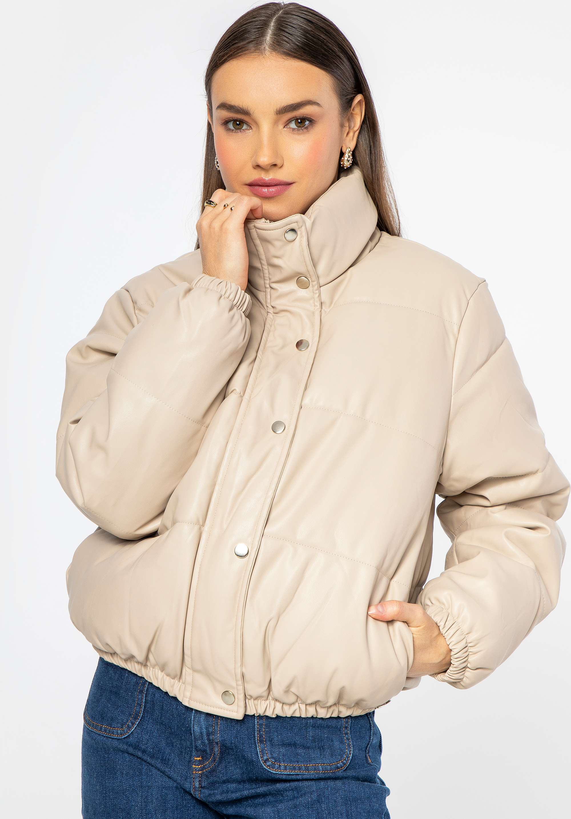 Ez a stílusos női kabát karakteressé varázsol minden ruhadarabot. Népszerű pufi dizájnnal rendelkezik, de szokatlan anyagból, kiváló minőségű ökobőrből készült. A puha tölteléknek köszönhetően a hidegebb hónapokban is melegen tart. Az oldalán nyitott zsebek találhatók, ahol elrejtheted kezeidet a hideg elől. A kabát túlméretezett szabása remekül mutat mind a sportos stilizációkkal, mind a testhezálló ruhákkal és magas csizmákkal. Ez a női öko-bőr pufferkabát nagyszerű választás a divatos kiegészítőket kedvelő nők számára.