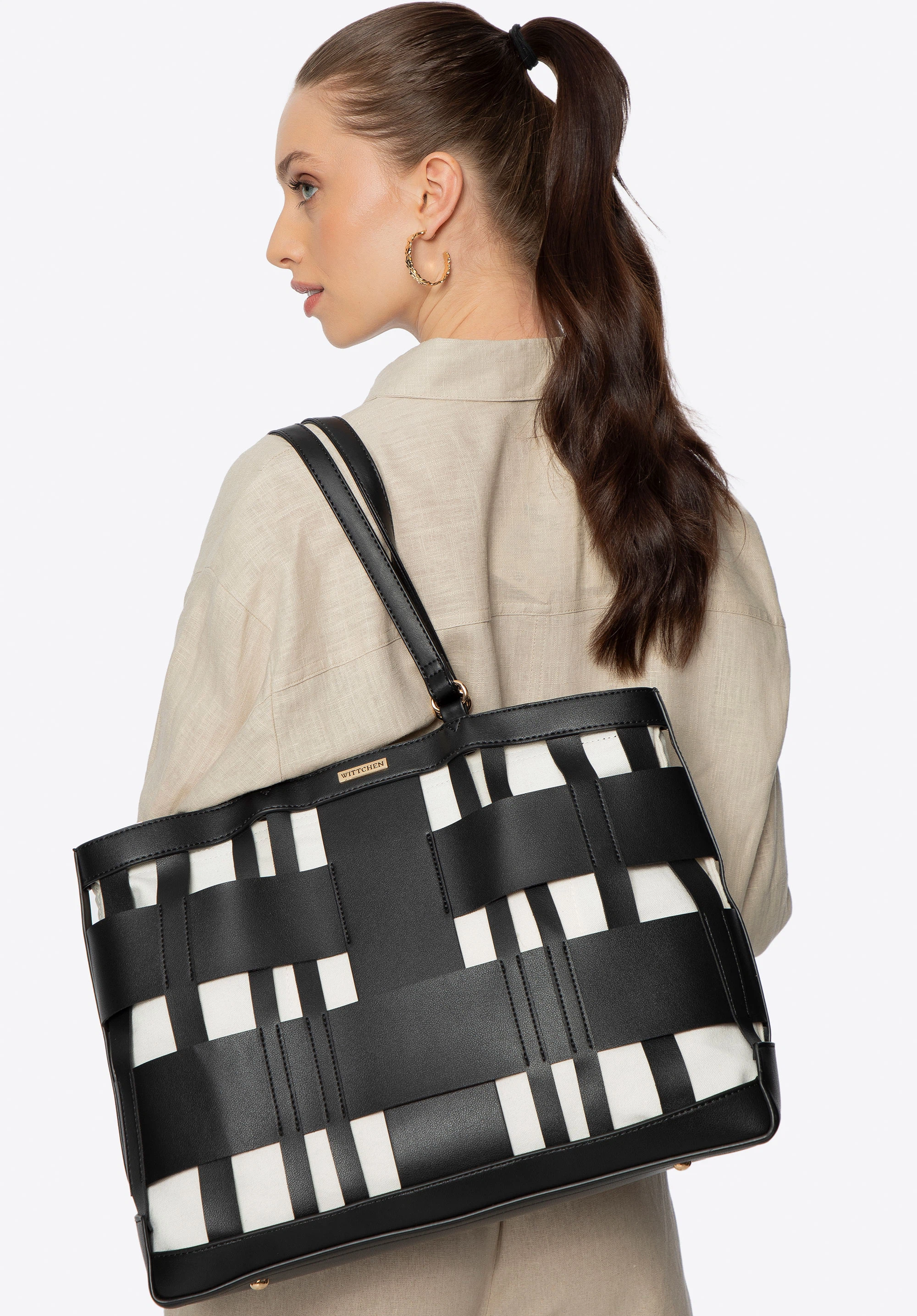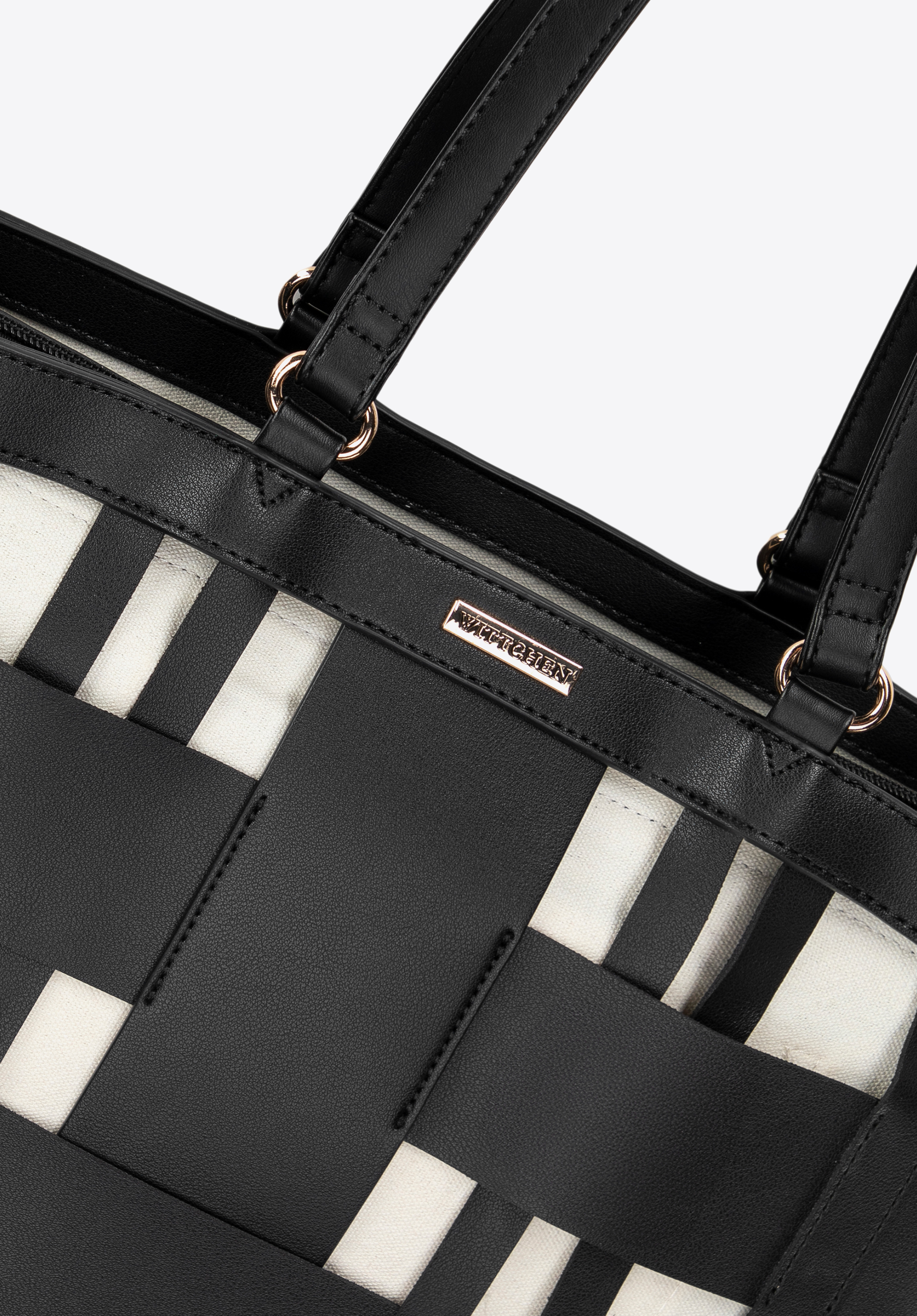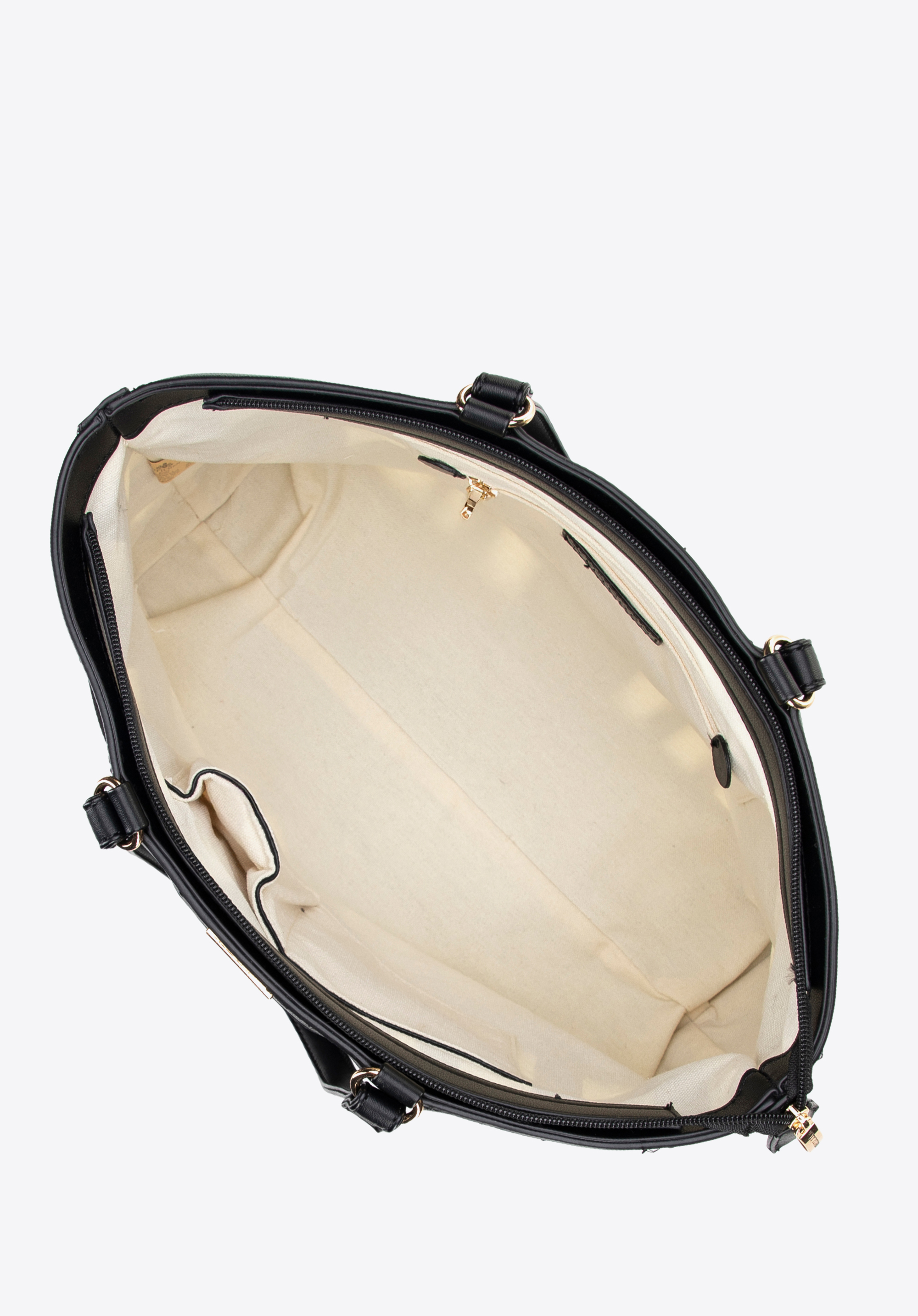 Elegáns shoppertáskánk ötvözi a funkcionalitást a divatos dizájnnal. Ökobőrből készült, cipzárral záródó, gondoskodik a holmijaid biztonságáról. A táska két kényelmes fogantyúval van ellátva, amelyek lehetővé teszik, hogy a válladon vagy kézben hordozd. Belsejét a rendezettség jegyében alakítottuk ki - három praktikus zseb segít a könnyű rendszerezésben, amelyek közül az egyik cipzáras.