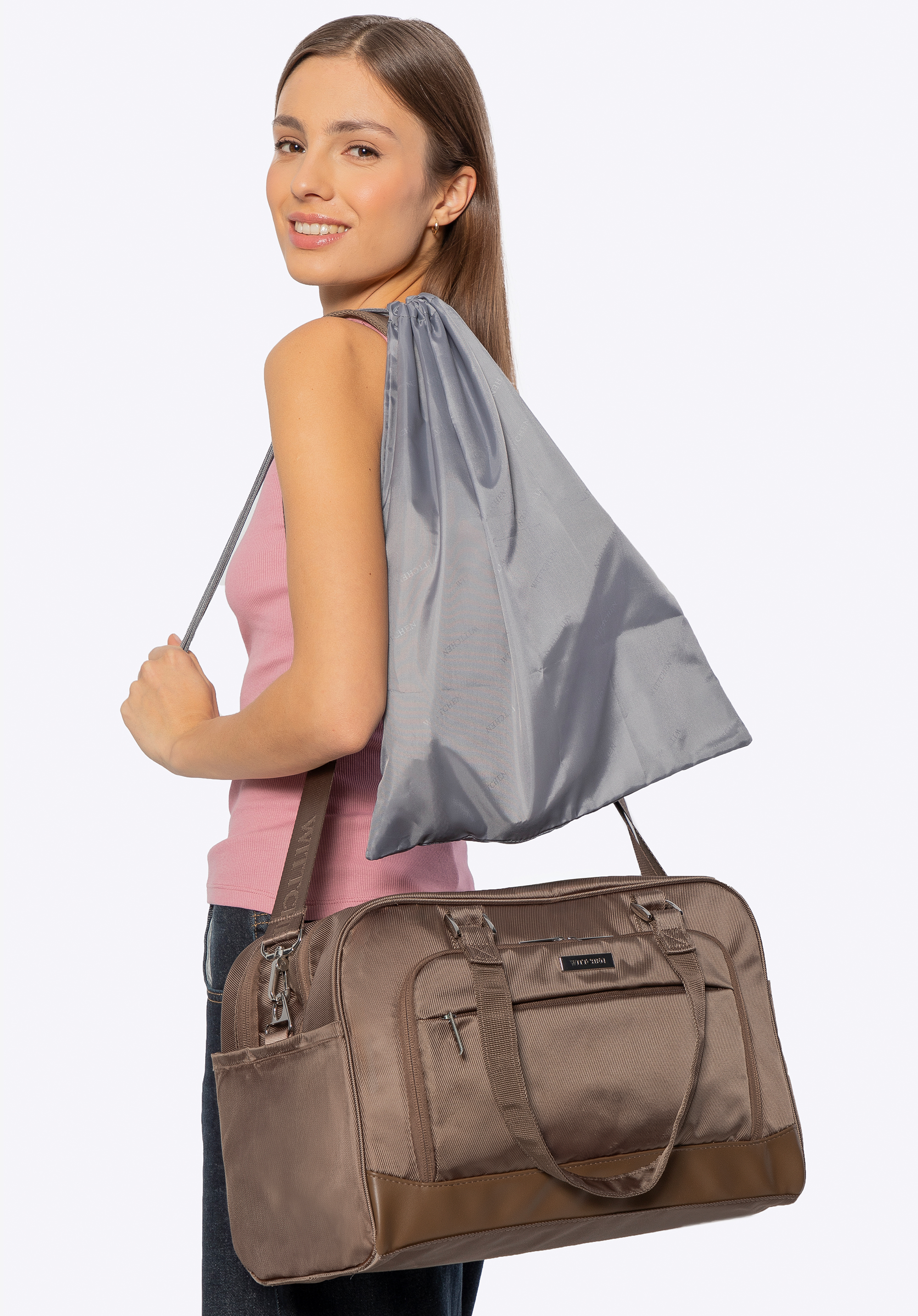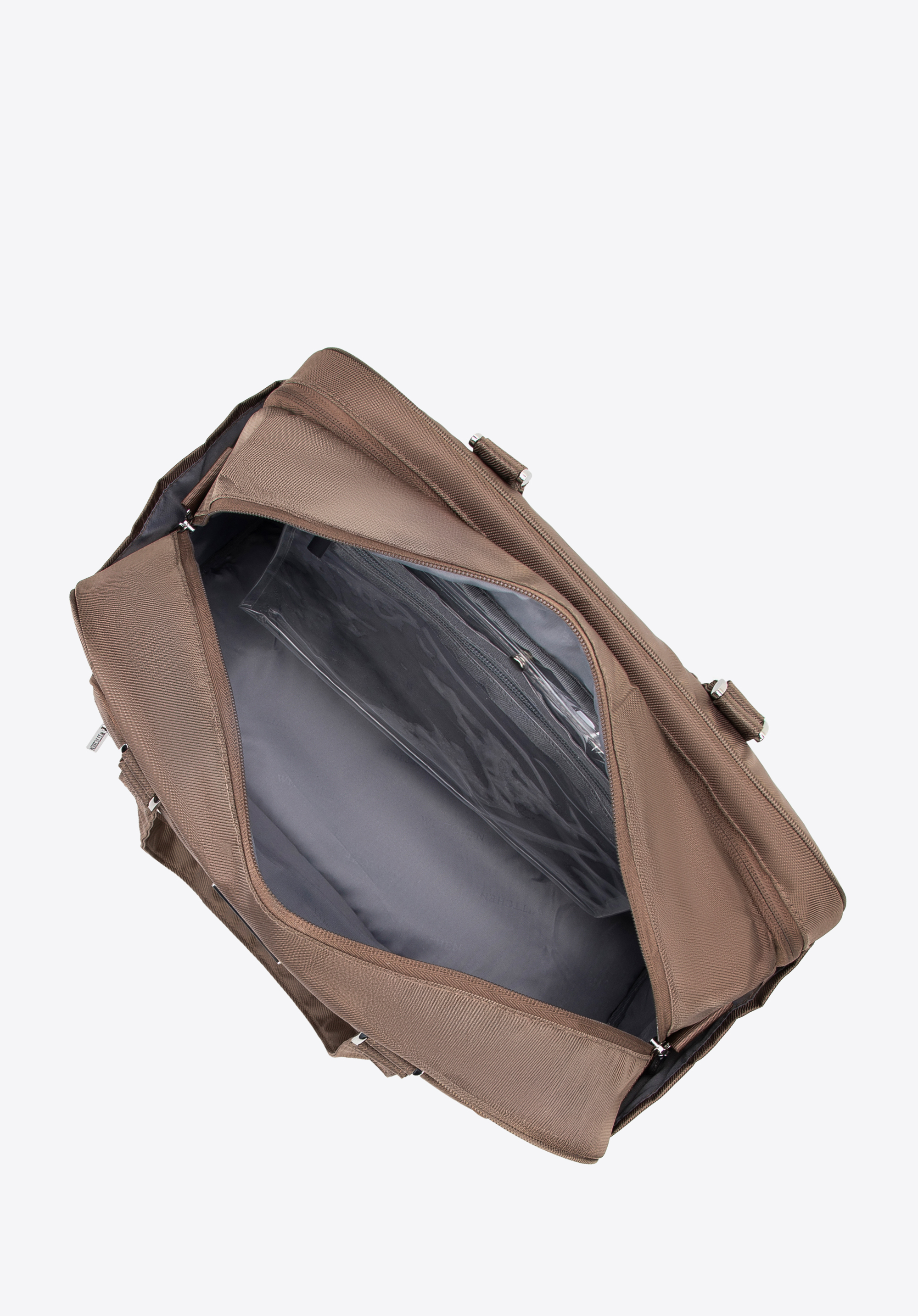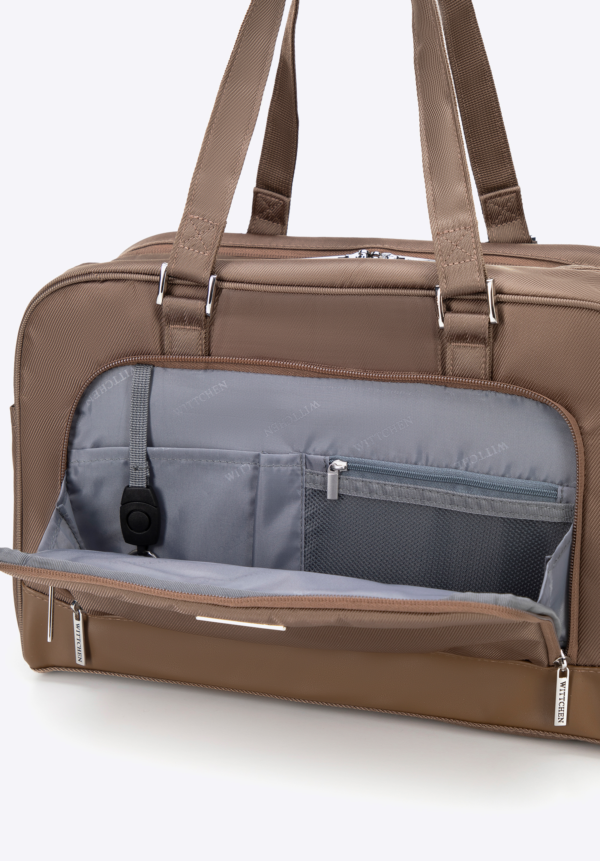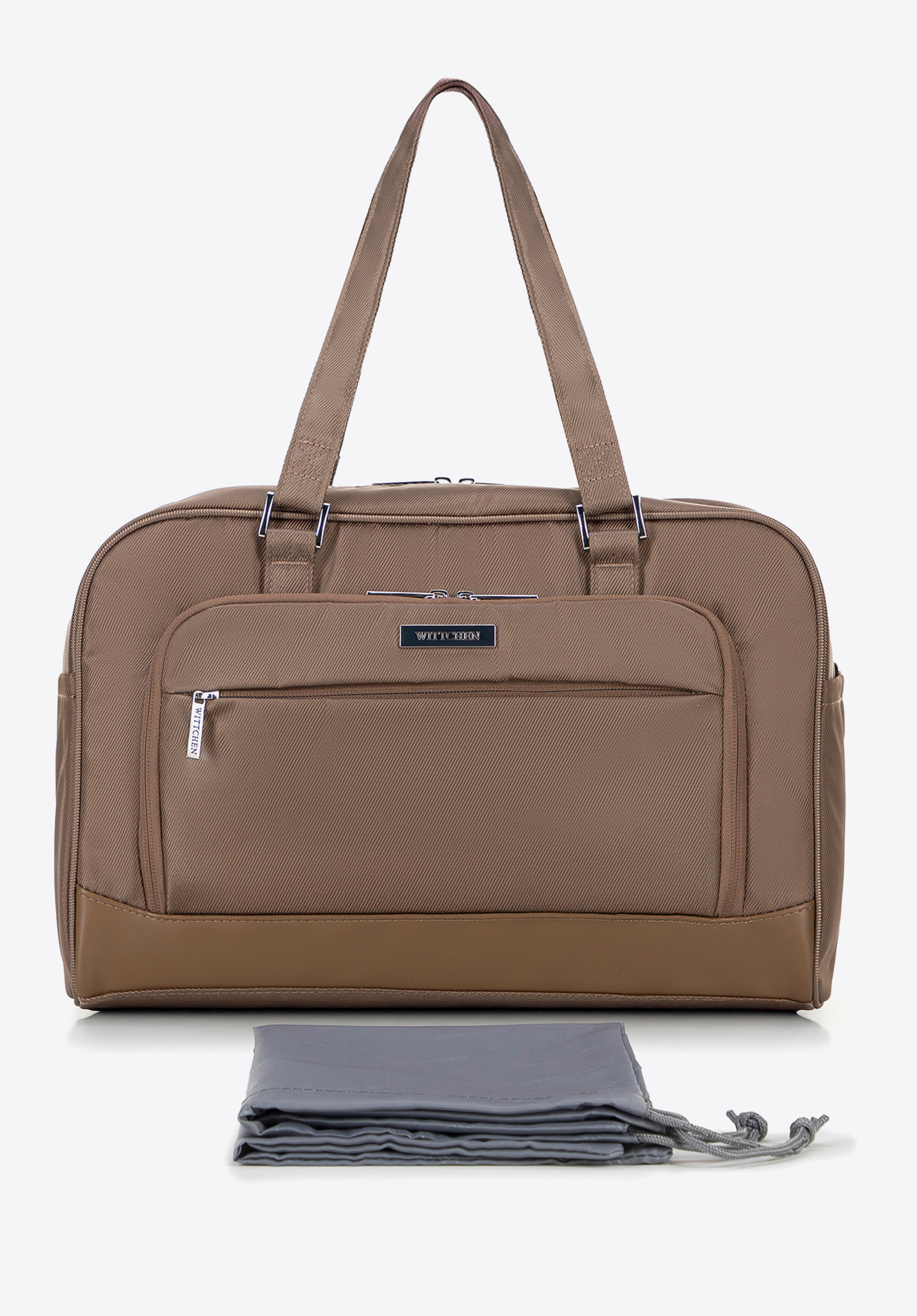 Ez a funkcionális poggyász azért készült, hogy megkönnyítse utazásaidat. Egy különálló, puha bélésű rekeszben maximum 36 x 22 cm méretű elektronikai eszköz szállítható. Ezen kívül a táska egy nagy rekesszel rendelkezik, amibe könnyedén elhelyezheted a hétvégi kiránduláshoz szükséges személyes holmikat. Belül további kiegészítőket találsz: egy húzózsinóros táskát - tökéletes ruhák vagy cipők mosására - és egy levehető átlátszó tasakot. Számos zsebében pedig elférnek a szükséges apróságok. Az egyik külső zseb RFID kártya védelemmel rendelkezik, így pénztárcatartónak is tökéletes lesz. Az enyhe fényű bordázott felület foltálló, és gyorsan megszárad, ha vízzel érintkezik.