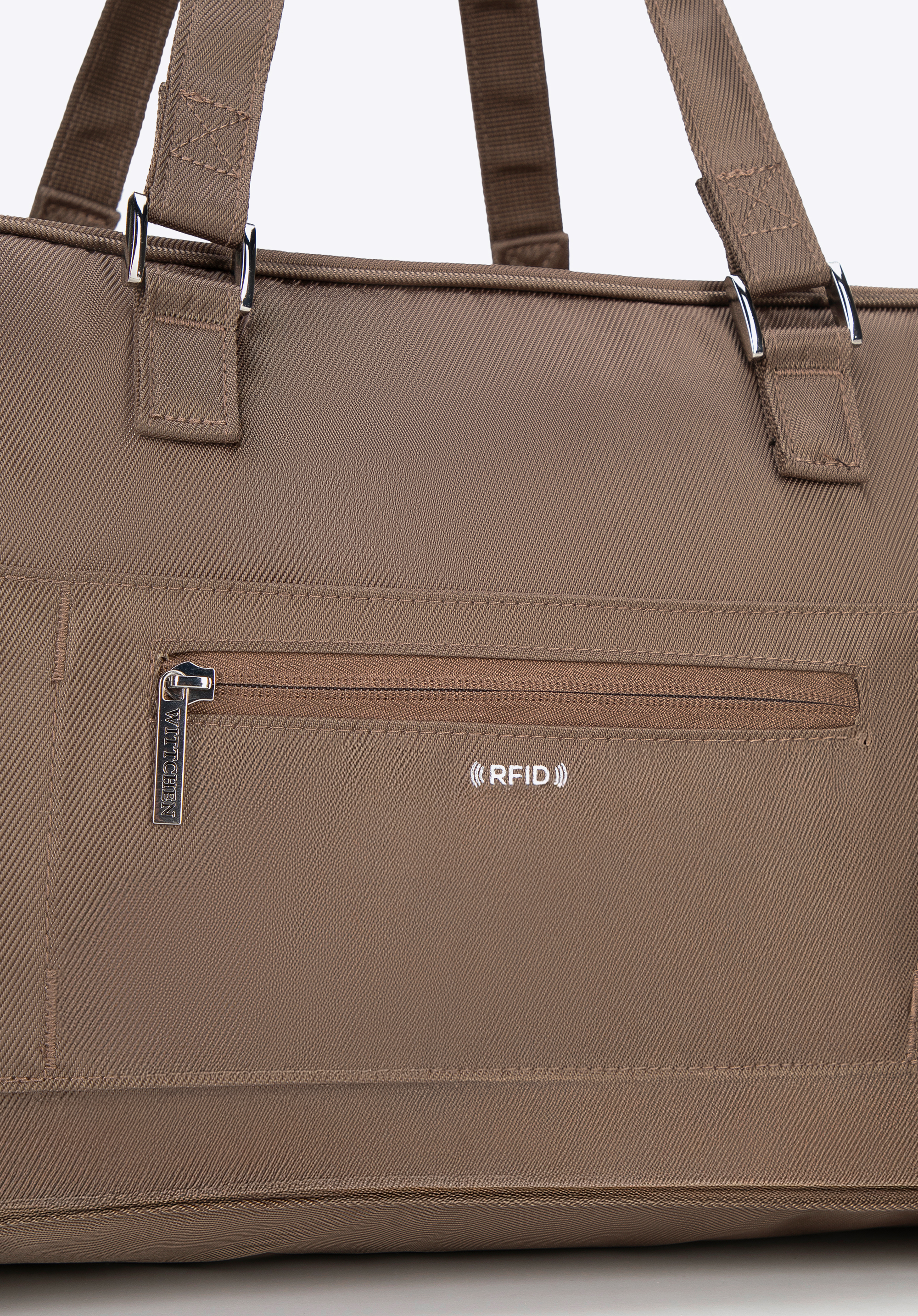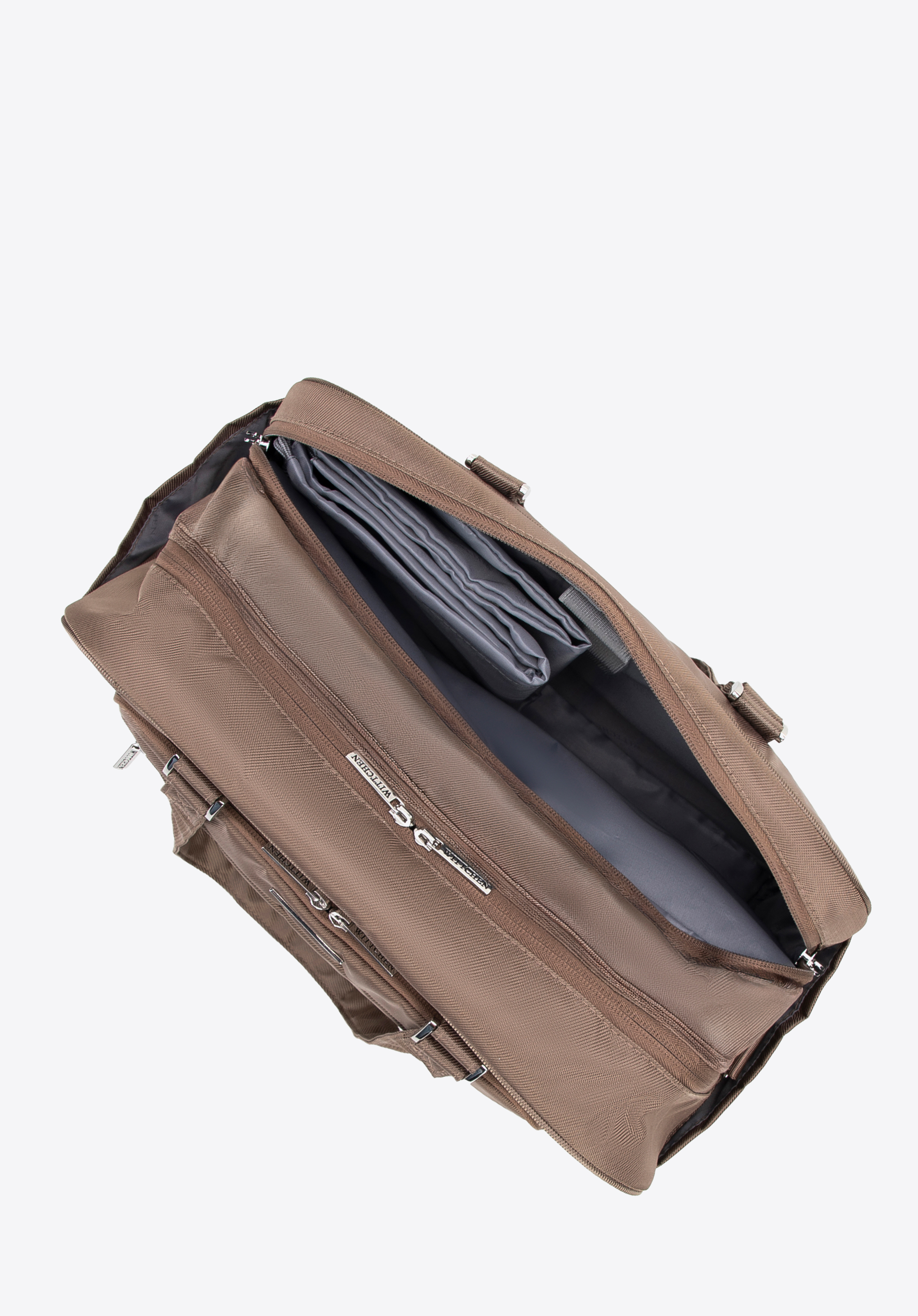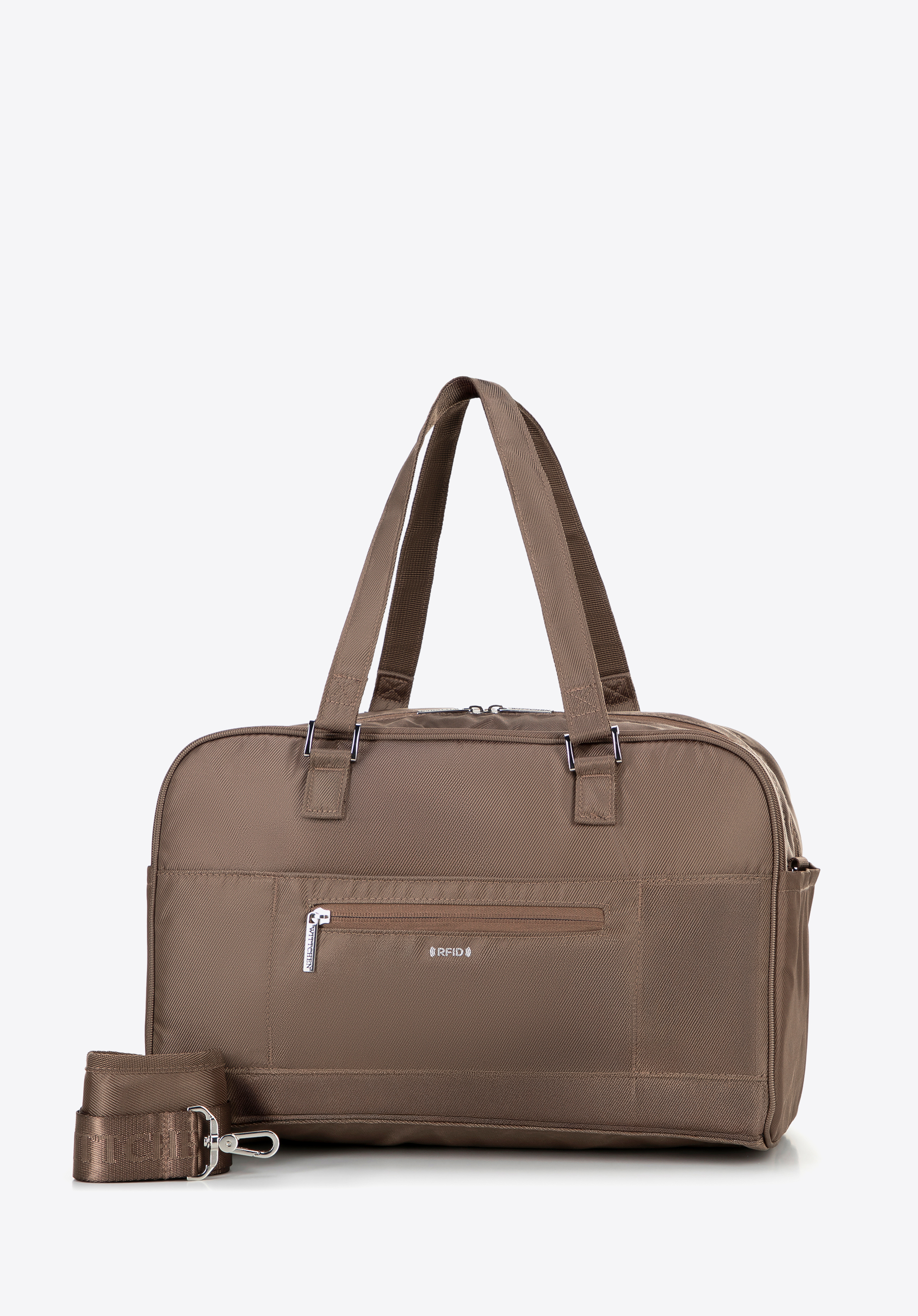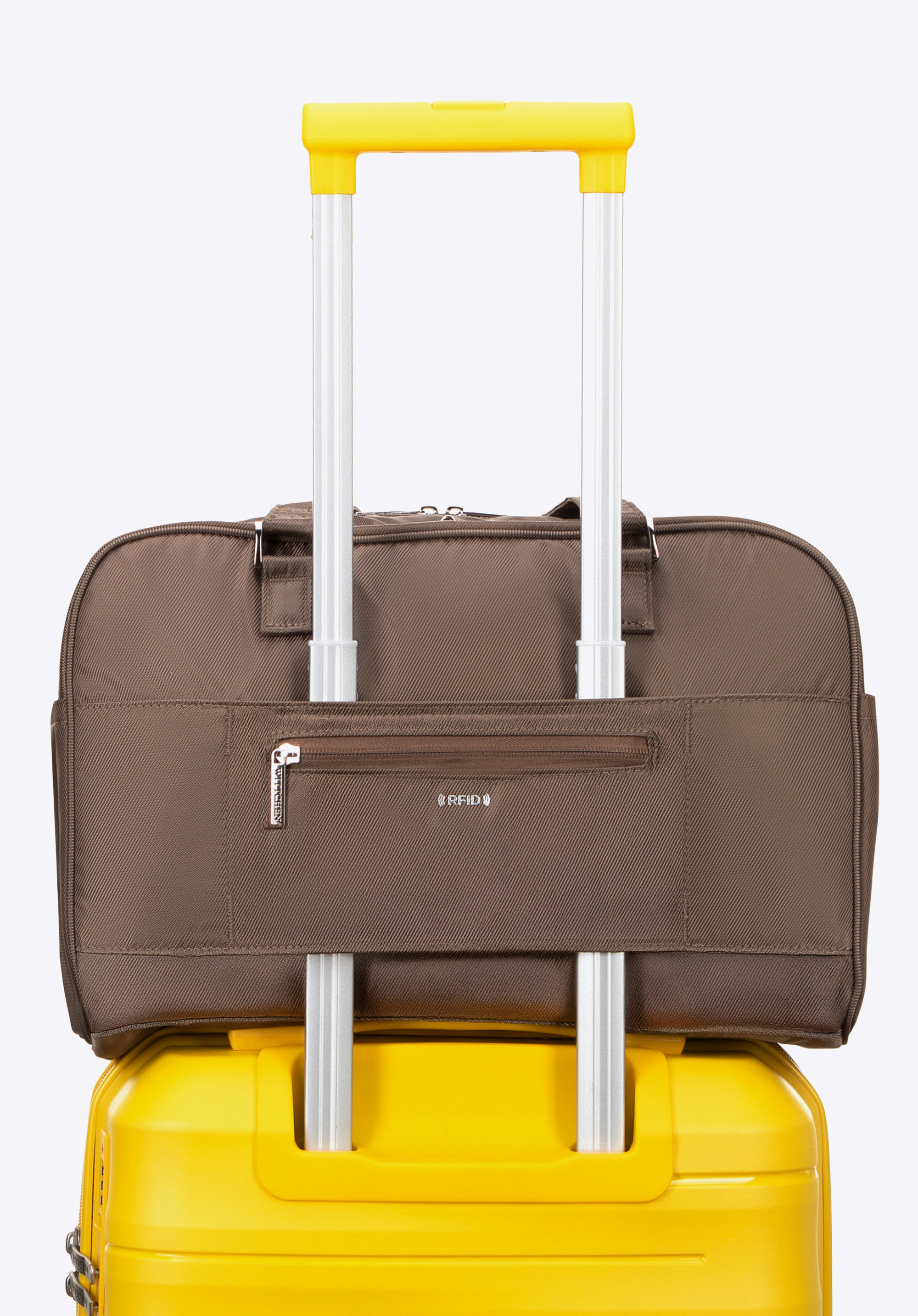 Ez a funkcionális poggyász azért készült, hogy megkönnyítse utazásaidat. Egy különálló, puha bélésű rekeszben maximum 36 x 22 cm méretű elektronikai eszköz szállítható. Ezen kívül a táska egy nagy rekesszel rendelkezik, amibe könnyedén elhelyezheted a hétvégi kiránduláshoz szükséges személyes holmikat. Belül további kiegészítőket találsz: egy húzózsinóros táskát - tökéletes ruhák vagy cipők mosására - és egy levehető átlátszó tasakot. Számos zsebében pedig elférnek a szükséges apróságok. Az egyik külső zseb RFID kártya védelemmel rendelkezik, így pénztárcatartónak is tökéletes lesz. Az enyhe fényű bordázott felület foltálló, és gyorsan megszárad, ha vízzel érintkezik.