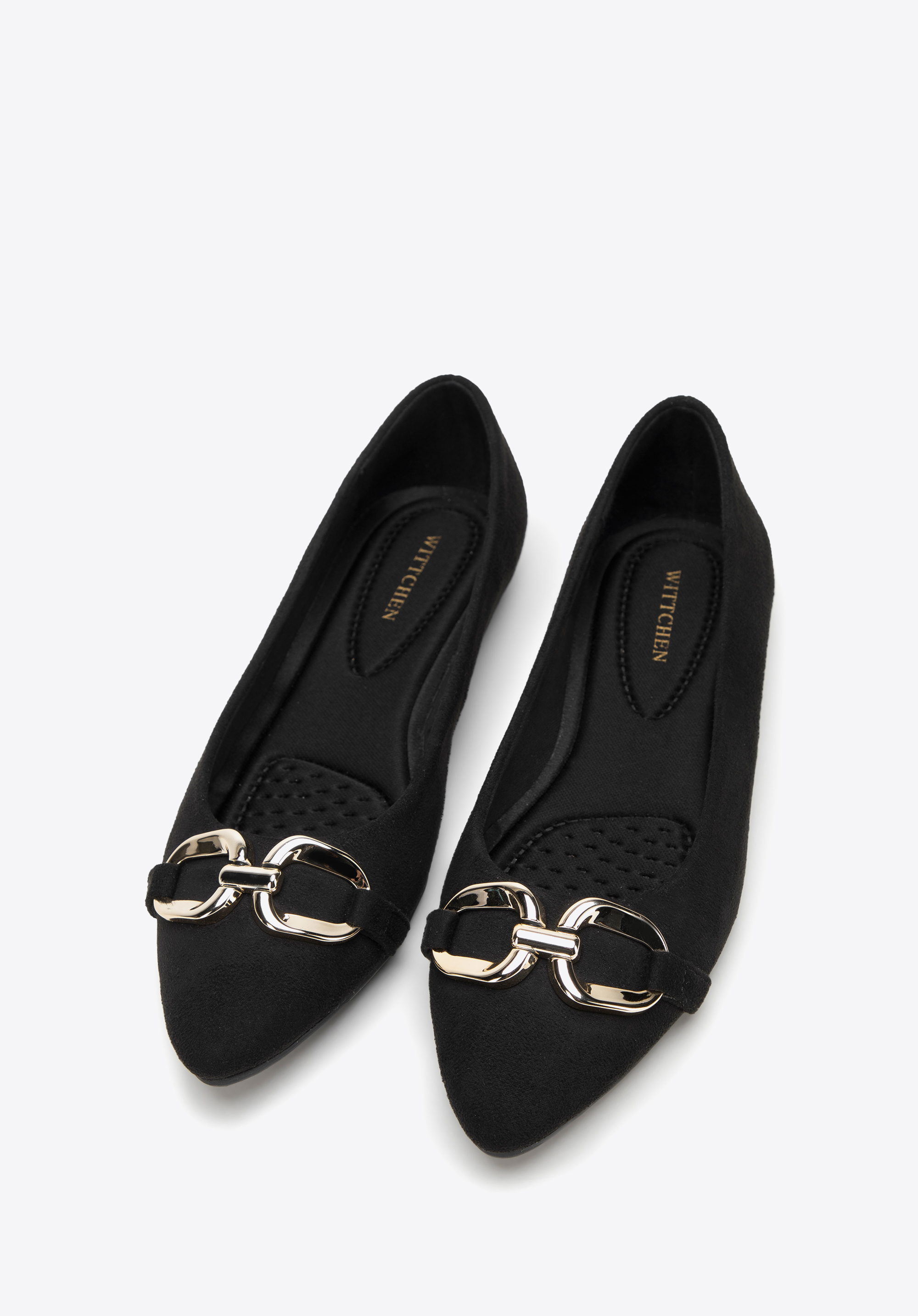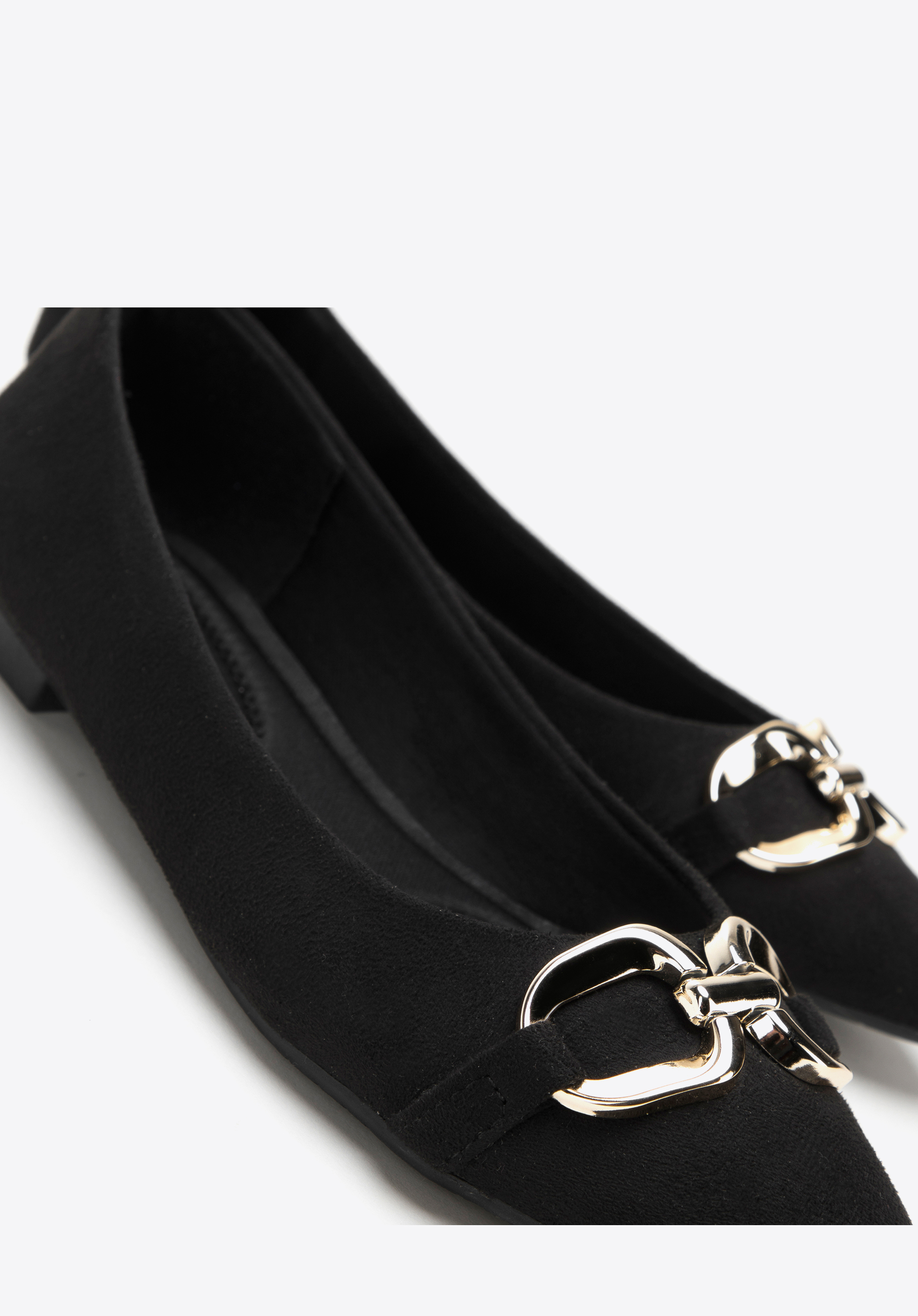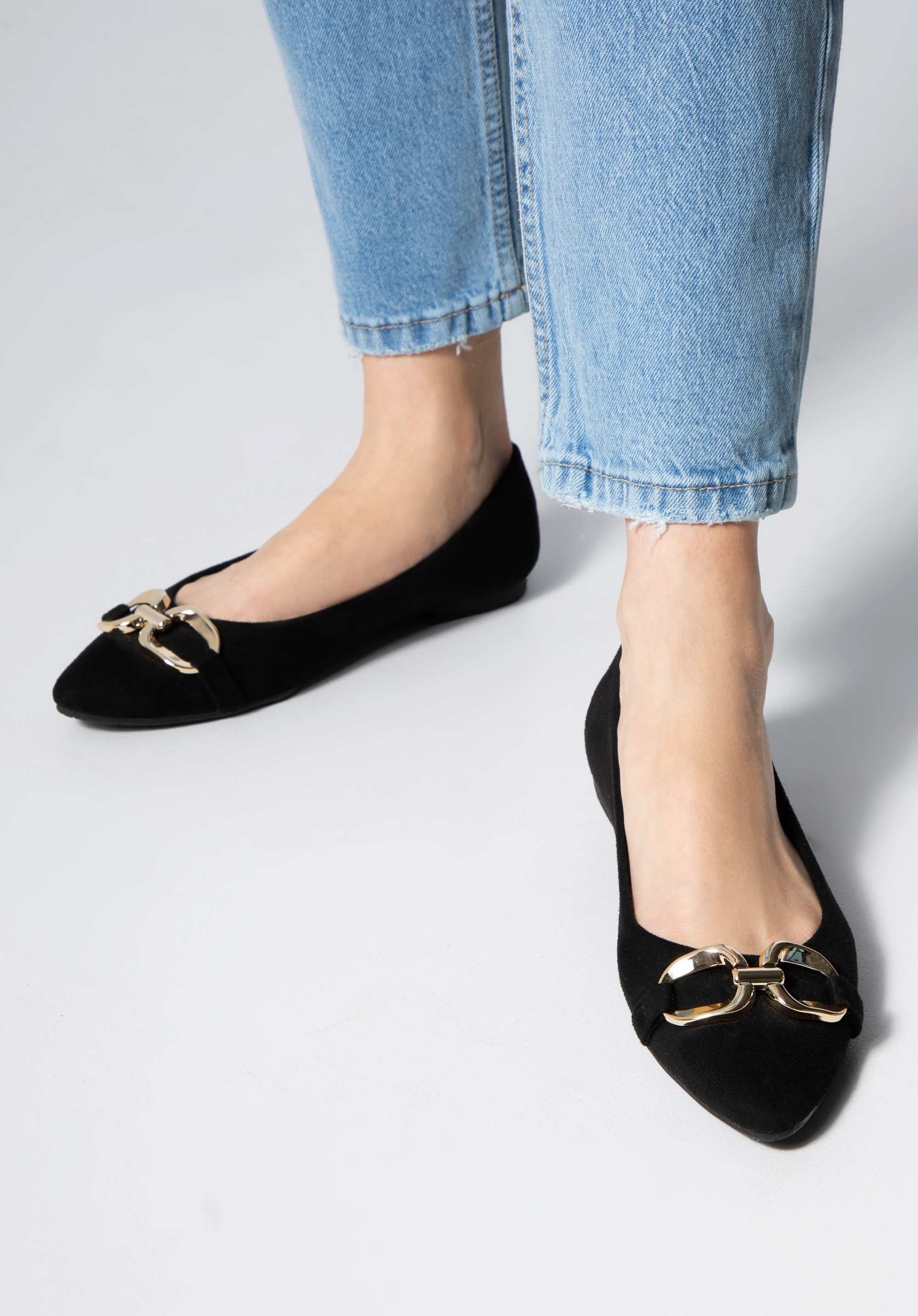 Az elegáns balerinák minden stílusos nő ruhatárának kihagyhatatlan kellékei. Kellemes tapintású a lábfejhez remekül illeszkedő velúr jellegű műbőr anyagból készültek. A puha, kontúros talpbetétnek és az alacsony saroknak köszönhetően akár órákon át sétálhatsz bennük kényelmesen. A csillogó, széles csat változatossá teszi még a legegyszerűbb öltözéked is, a hegyes orrú cipő pedig elegánsan karcsúsítja lábfejed. Viseld kedvenc fekete estélyi ruhádhoz vagy hord farmerrel és bőrdzsekivel - minden helyzetben elegánsan fogsz festeni. A csattal ellátott velúr jellegű műbőr balerina időtálló kiegészítő, akár a mindennapi munkához, akár a színházba, vagy egy elegáns vacsoraestre.