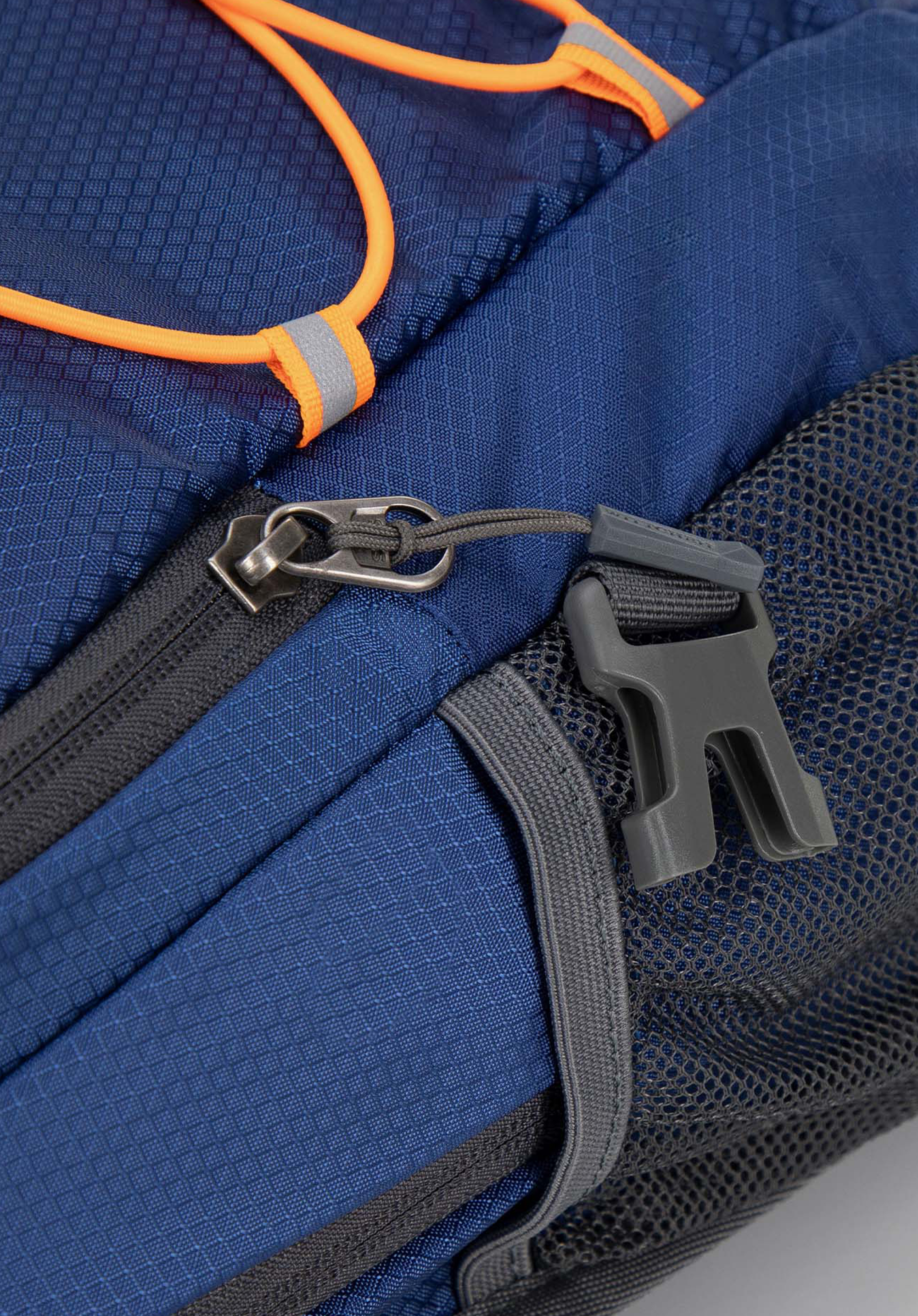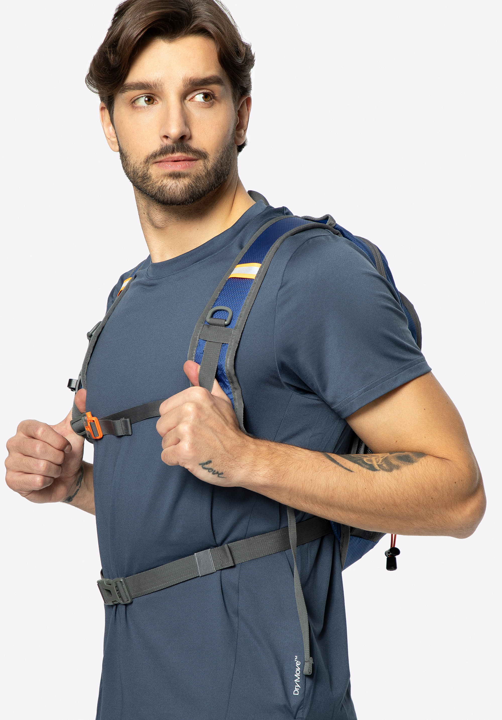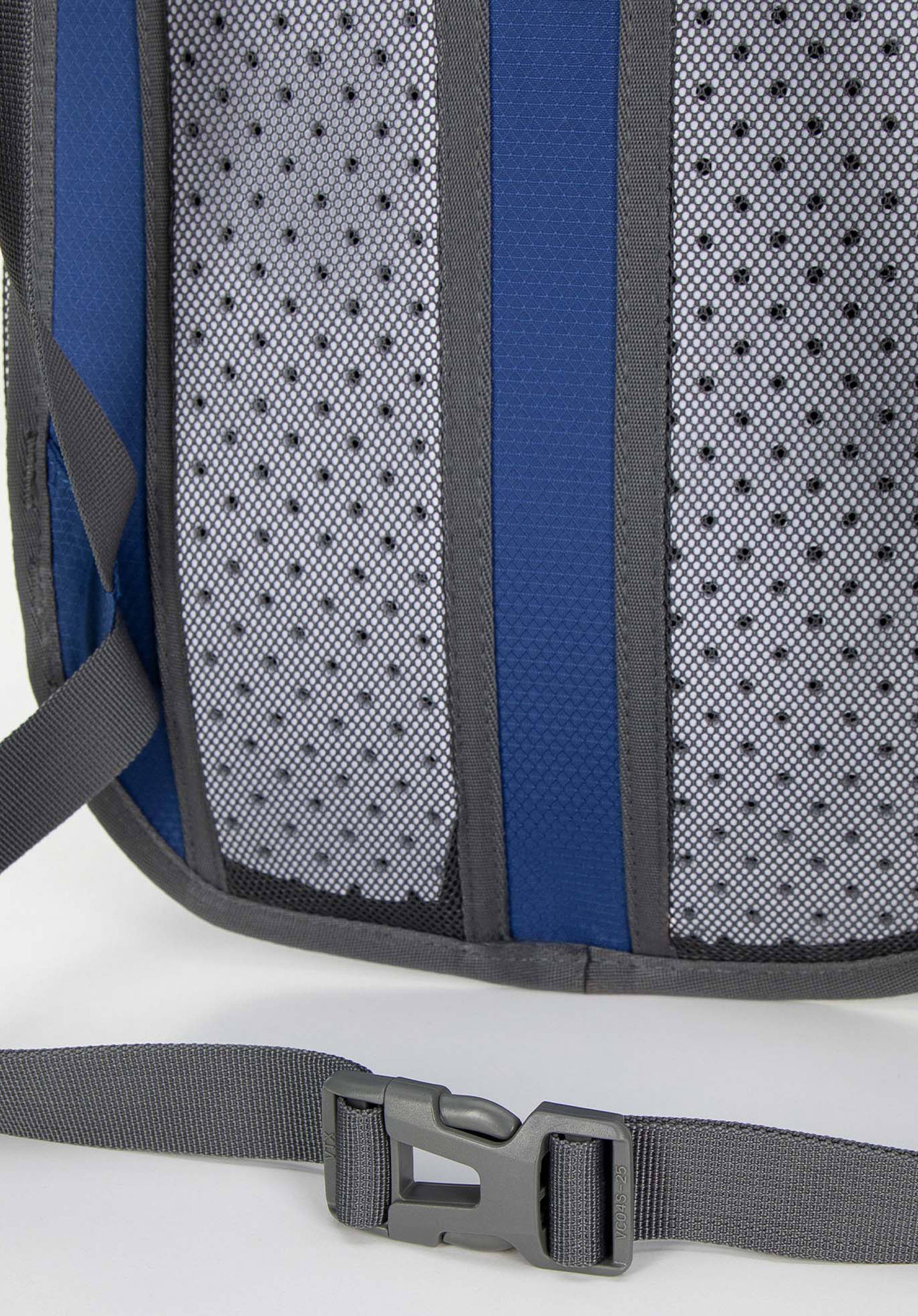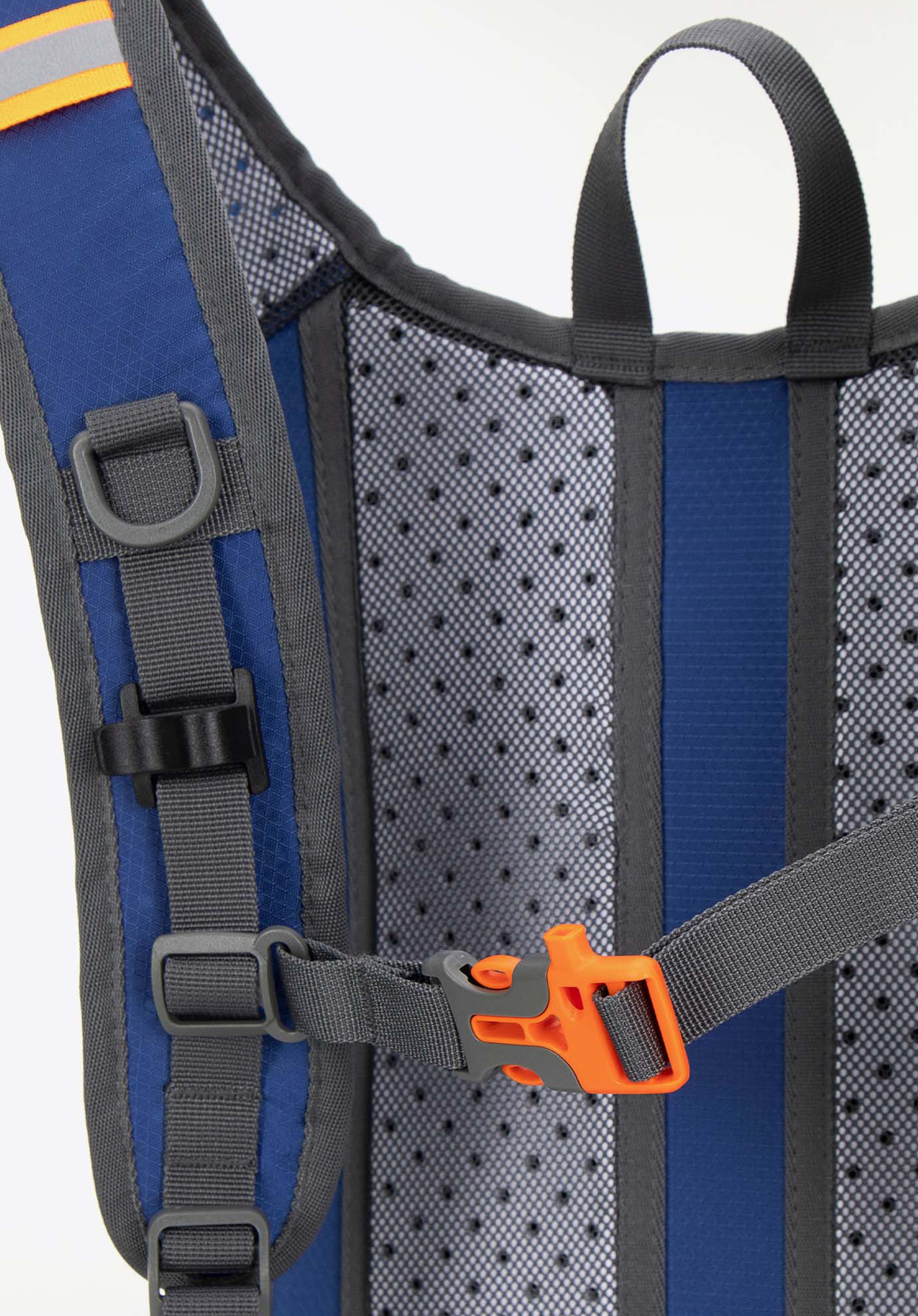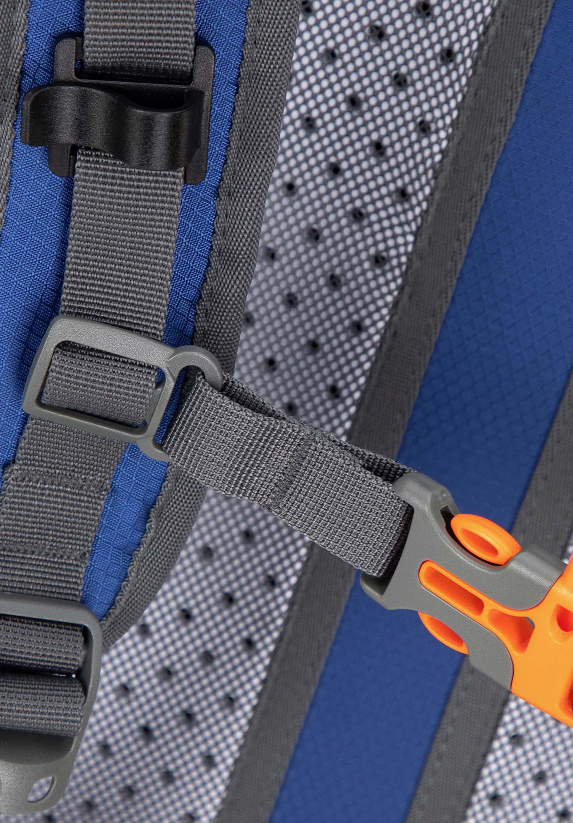- Állítható mellkaspánt: stabilizálja a hátizsákot, megakadályozza annak elmozdulását, míg a csípőöv csökkenti a háton és a csípőn nehezedő nyomást, így nagyobb kényelmet biztosít hosszú túrák és kerékpározások során.